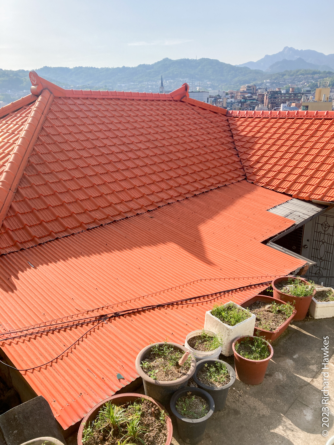 There’s seating outside the front next to the wall, and you can see some views of the city and the mountains from various spots.
