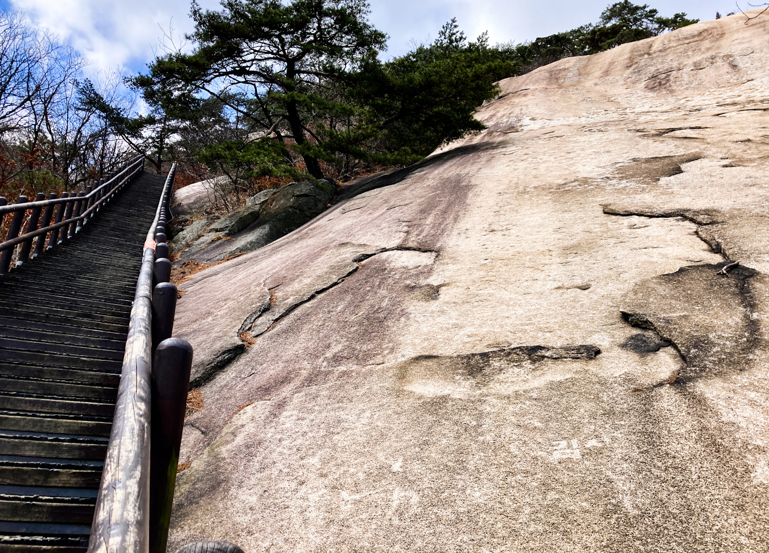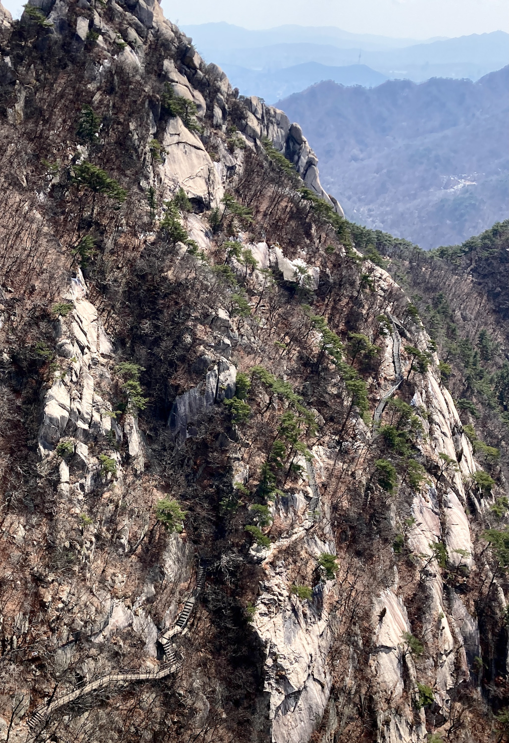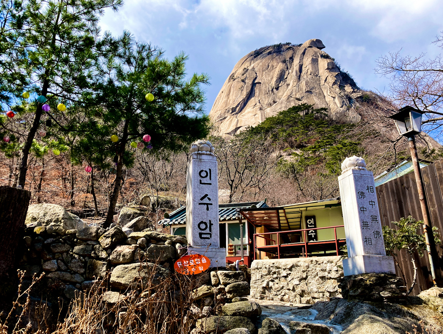 After getting some elevation, I tried to follow the trail Naver Maps was showing me, but it seemed to disappear! Stubbornly I persisted even though hikers were going another way, to I wasted about 30 minutes going up, then down to find the non-existent trail, then back up again! Anyway, once on a trail, I passed a nice looking temple with a mountain behind it, and then on up towards Baegundae.