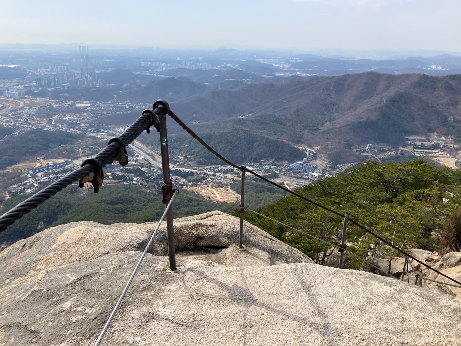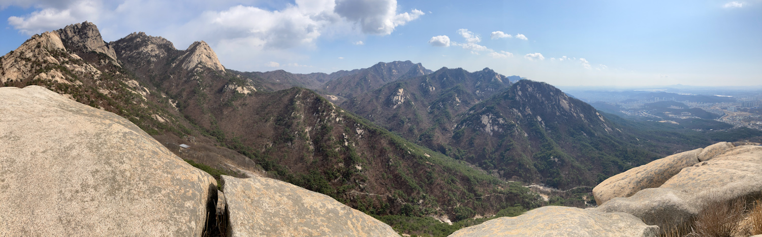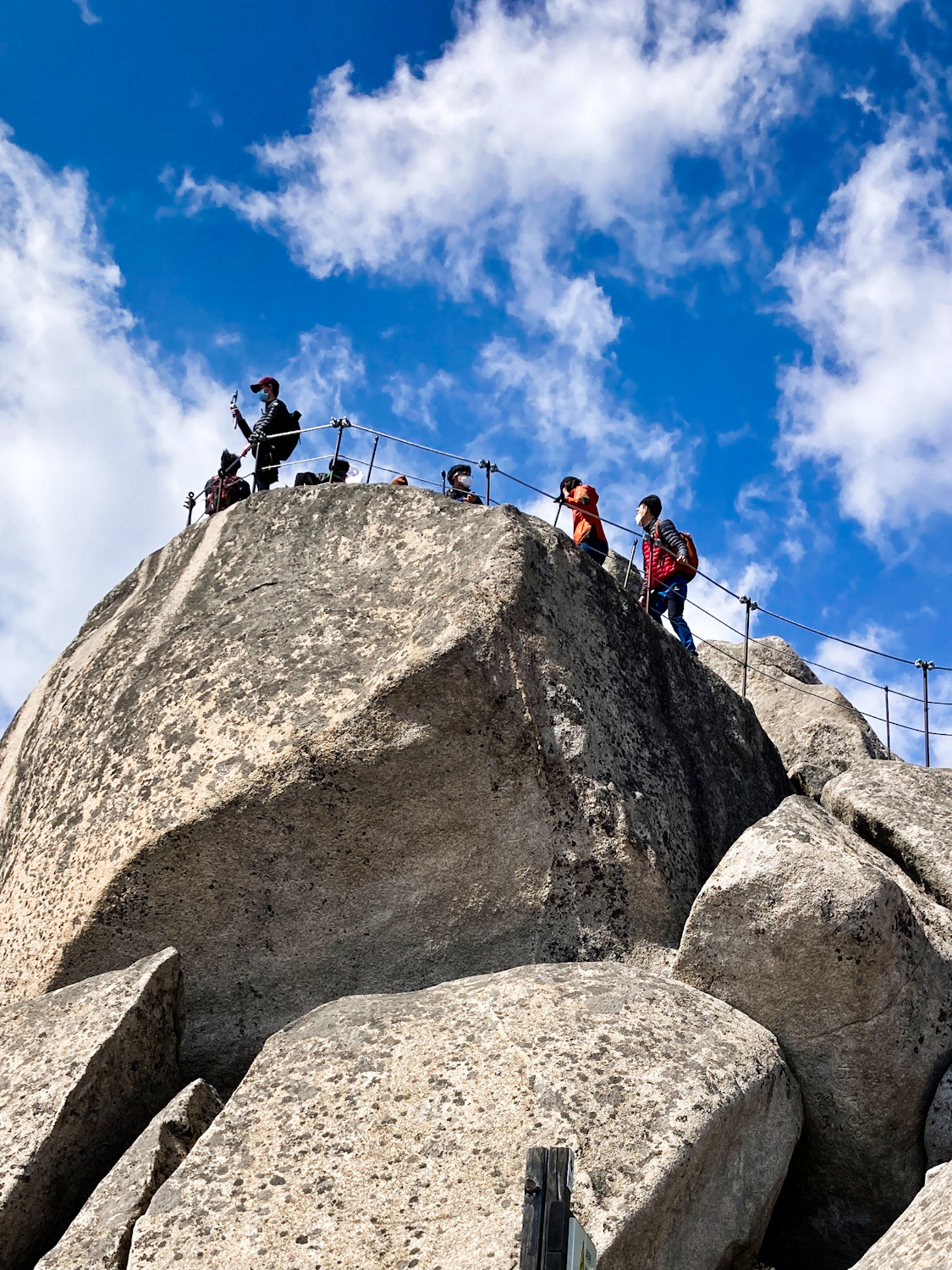 Turning left and contimnuing up, I came across a few wide rocky ledges with insanely nice views of Uisangbong to the south and Baegundae to my left. The peak too was very wide and flat. The trail went further west and up a steep little rock with some rails where you could stand and get a 360 degree view.