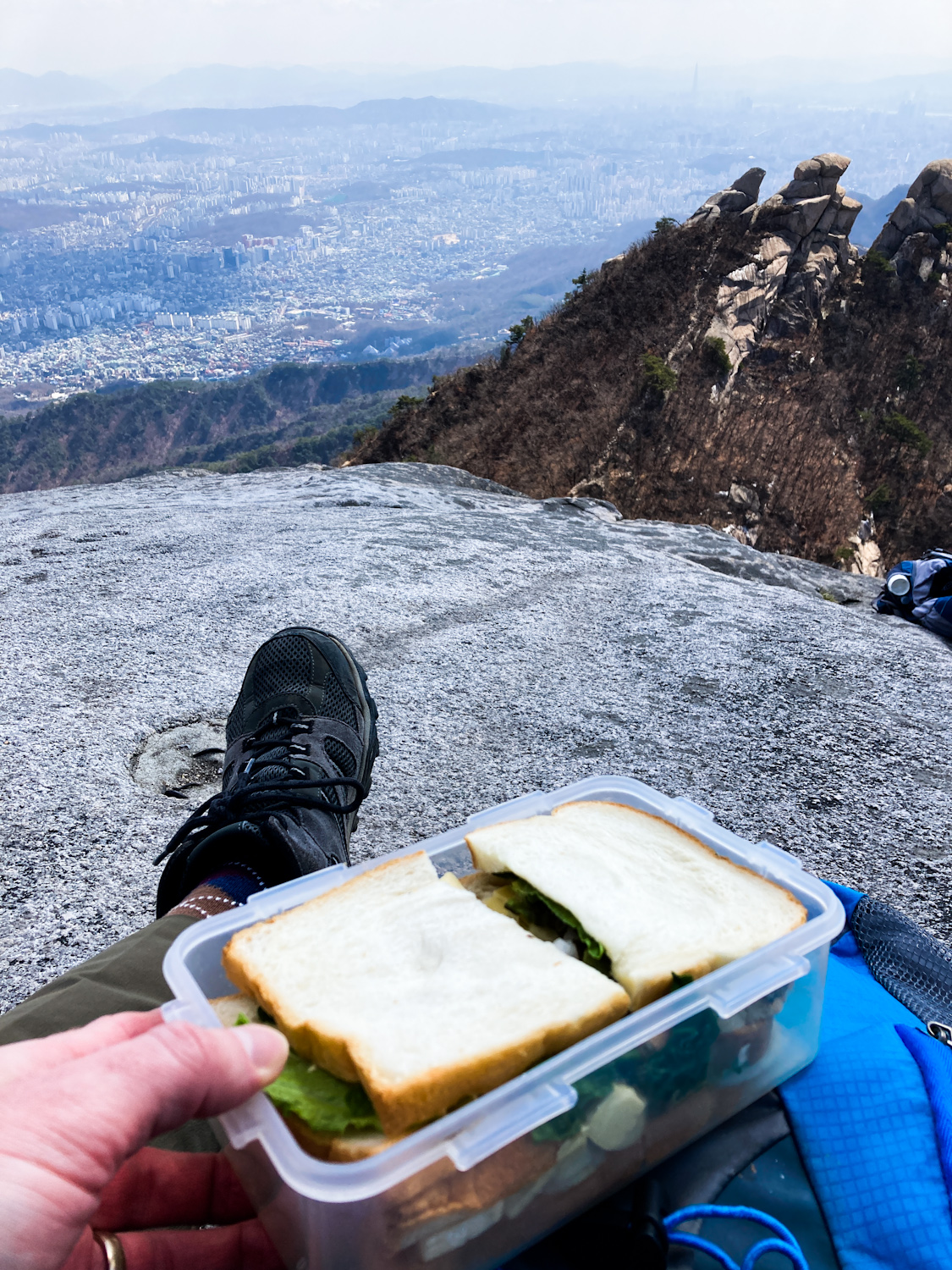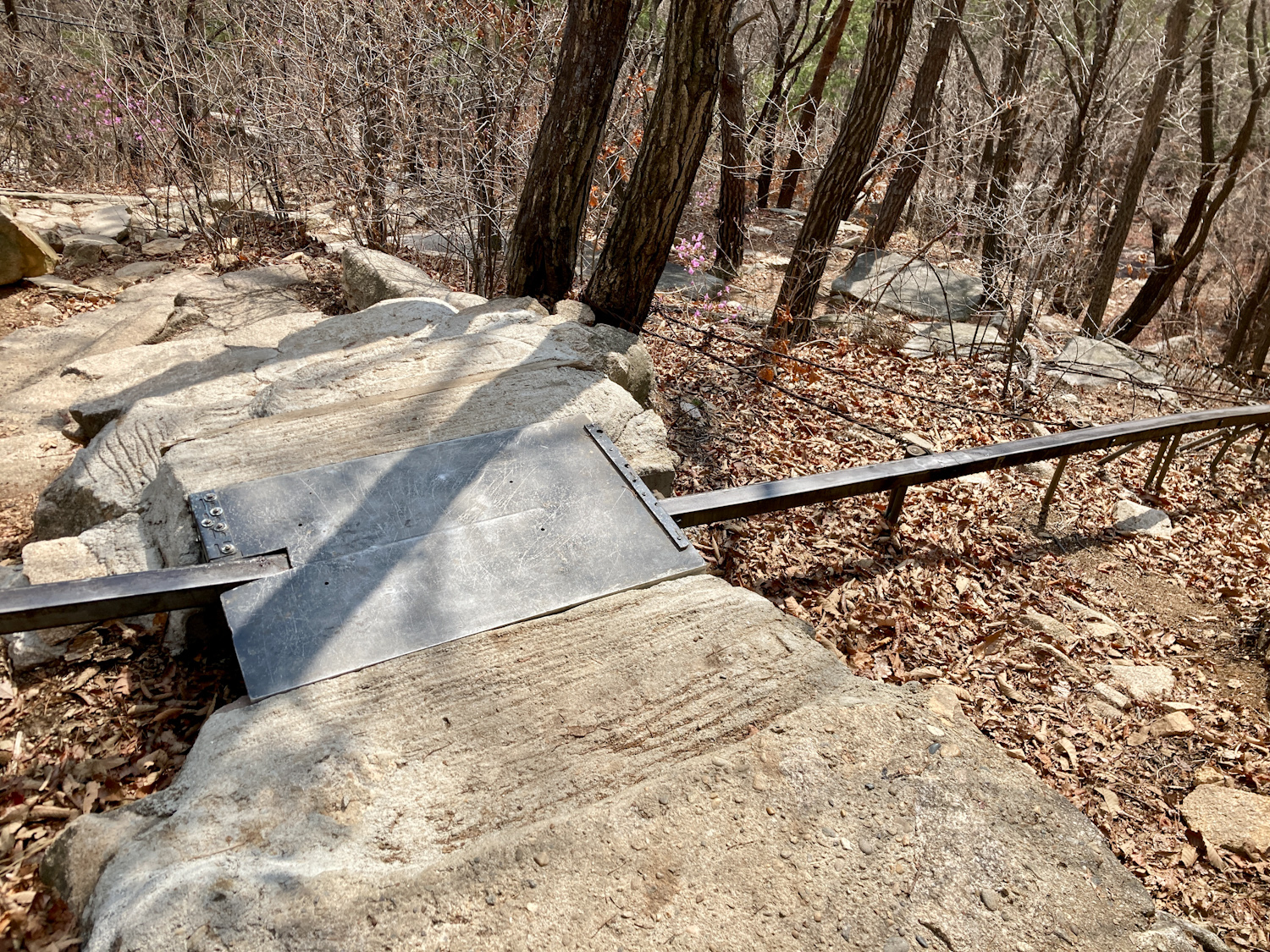 From here it was west along bits of wall before turning south towards the Bukhansanseong Fortress entrance. Along the way I went into an old army bunker. It seemed to have been build in 1968, just after the time the North Koreans tried to assassinate the president. It was in relatively good condition and would be a great location for a mountain retreat! There were more wall sections; these sections on Wonhyobong seemed original and very rugged compared to the rebuilt sections you see in some of the more travelled places in Seoul. Once I got to the foot of the mountain, I headed to a coffee shop I’d seen before. On the way were two dining chairs just placed along the trail looking south. I guess they were someones…