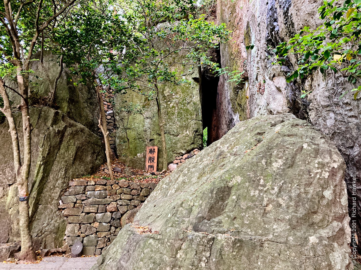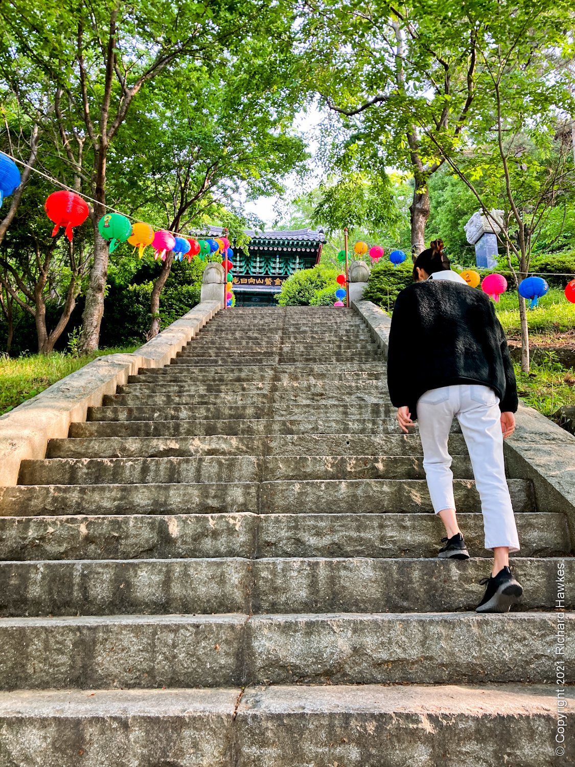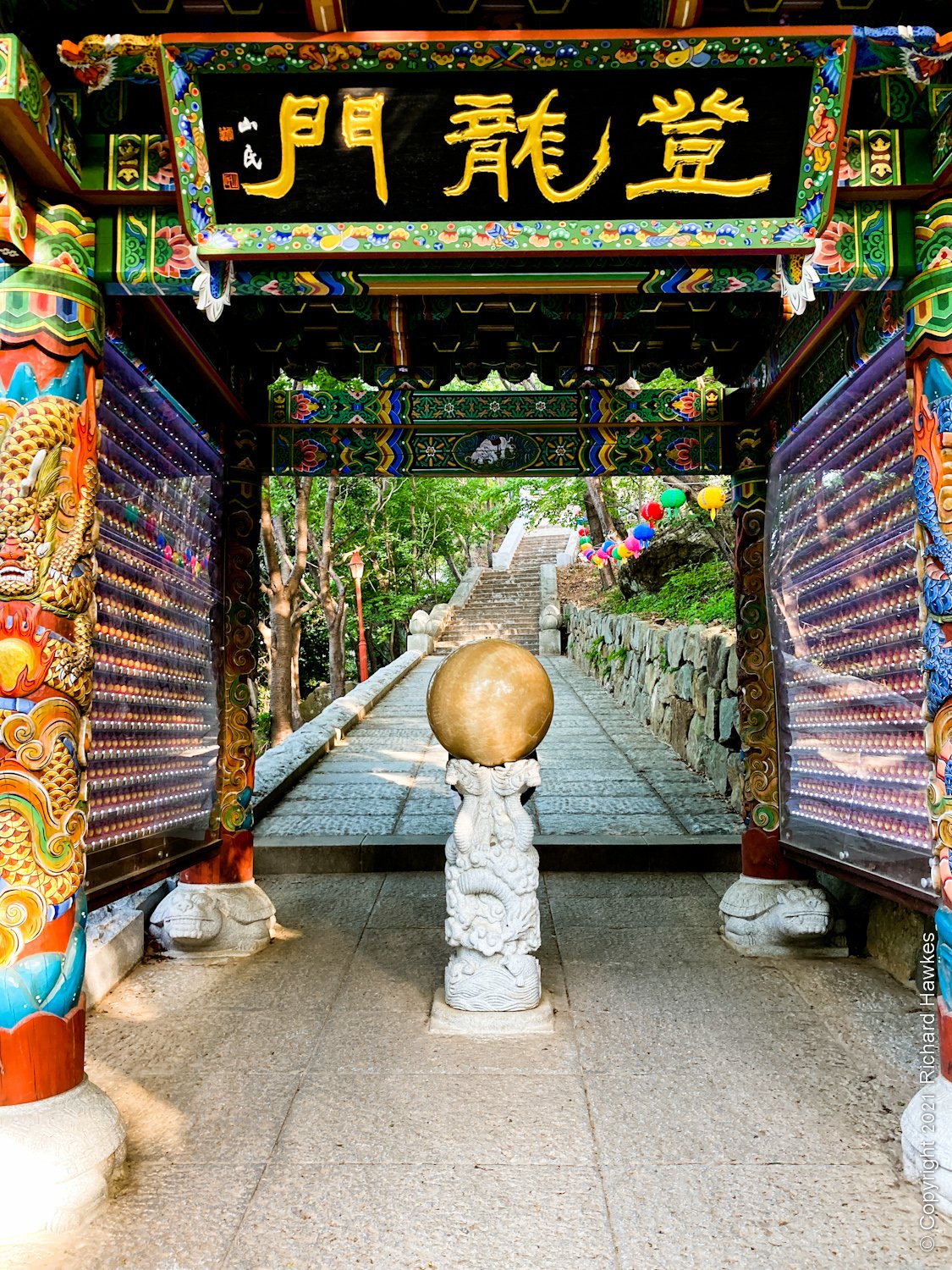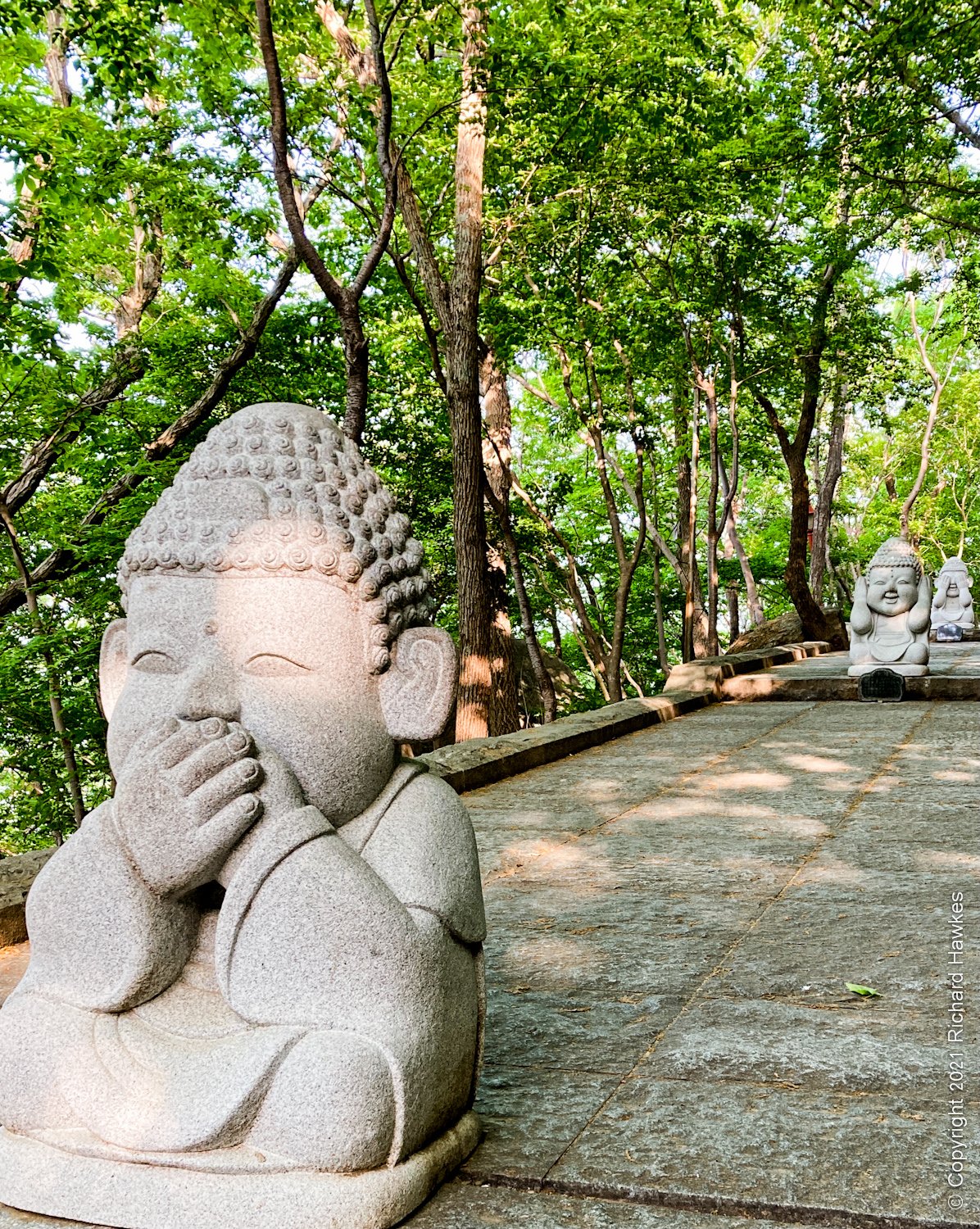 Hyangilam temple (향일암) is on Dolsaneup (돌산읍) next to Yeosu in the south of Korea. I was very taken with this place of trees, rocks, and its many hidden pathways. There’s a steep walk to the entrance area, with lots of cafes and restaurants; you can tell this would be massively busy on the weekends! The actual temple starts with steps up through a forest. Then it’s a left turn along a path featuring see-no, hear-no, speak-no evil Buddha statues. I posted about this place in April 2021.