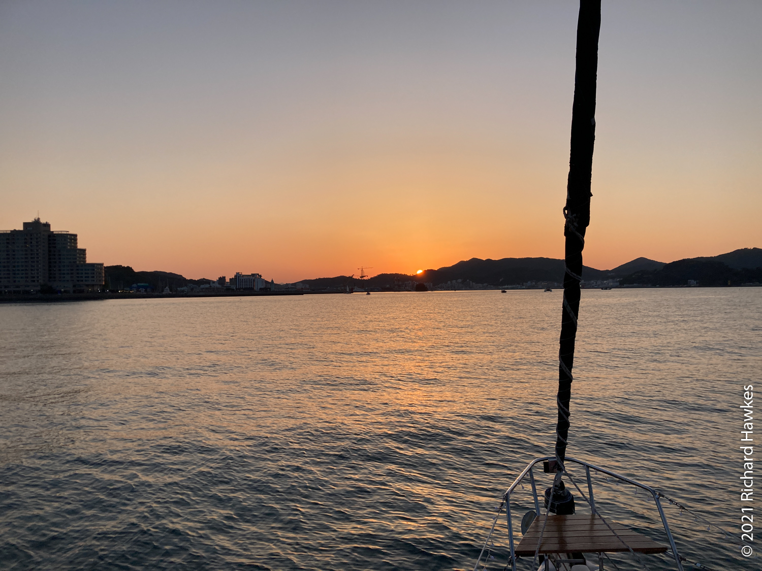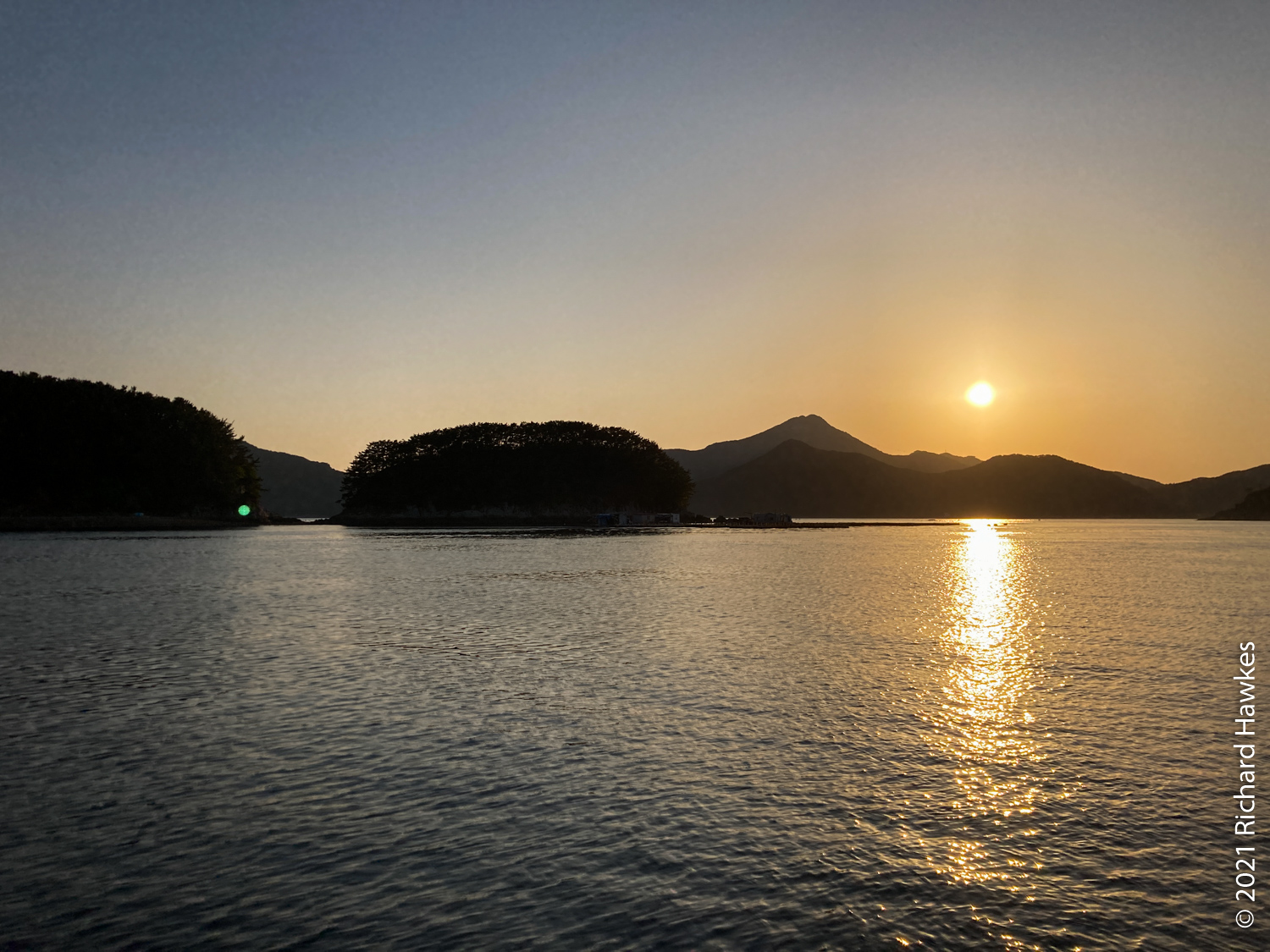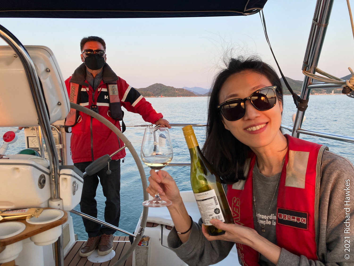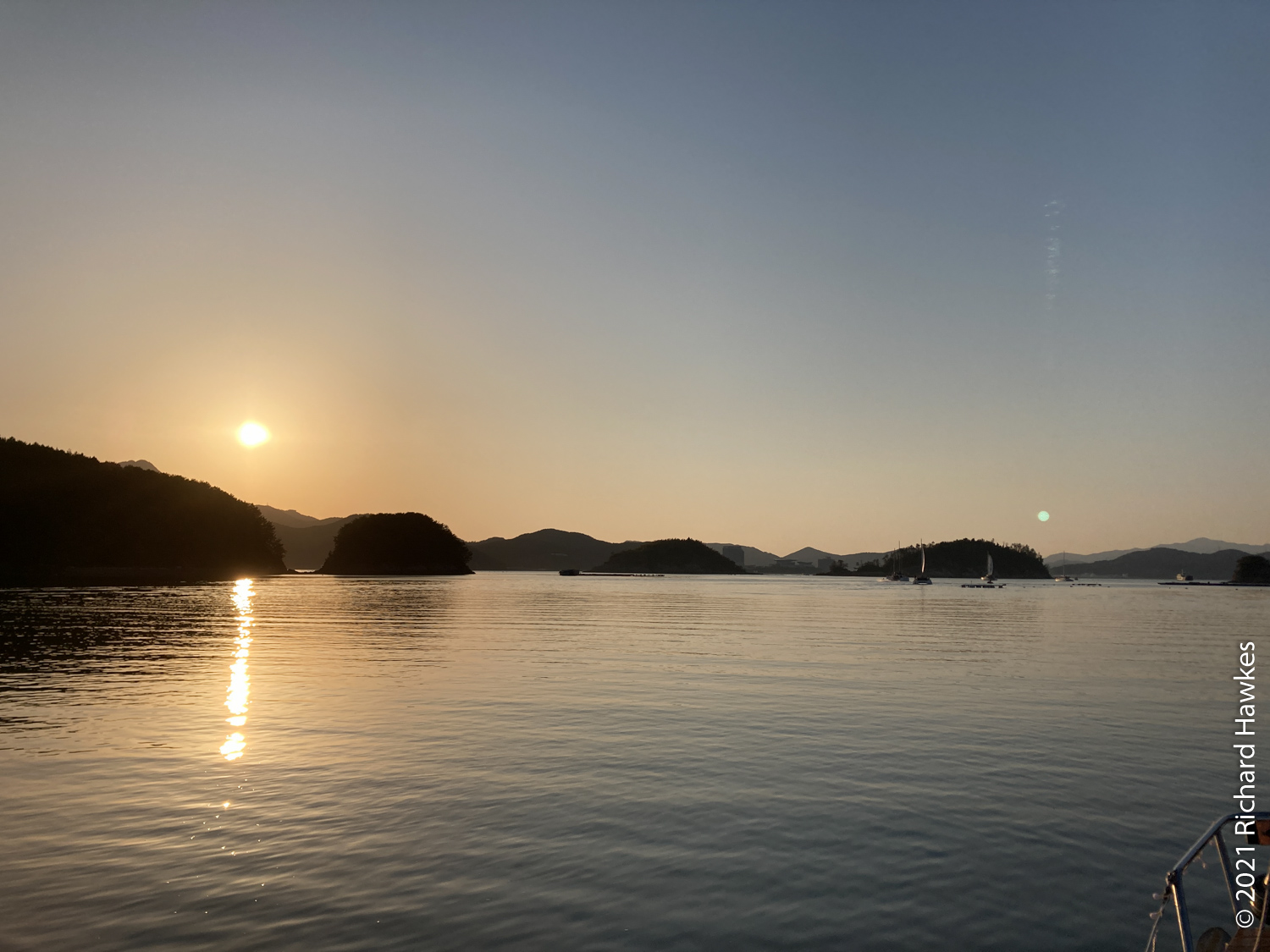 The perfectly calm weather made for an extremely pleasant trip but there wasn’t enough wind for sailing. Romana and I sat on the front deck and enjoyed the relaxing ride. Along the way there were other pleasure boats out with various levels of fun, from music and lights and drink, to calm and quiet like ours! There was also a section near the island filled with jelly fish, and also plenty of seagulls following us. Hansando looked lovely from afar and we spent a short time in the bay taking photos. The captain even broke out a bottle of chilled white wine (we paid for it) and we had a glass while sitting on the water; nice! On the way back to Tongyeong, we got to see the sunset over the hills which rounded off the trip perfectly.