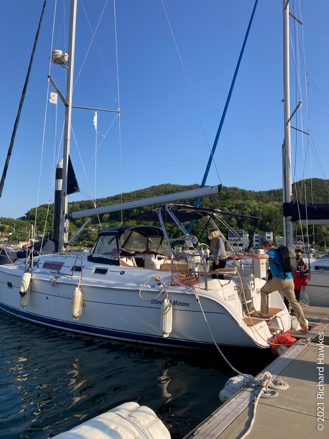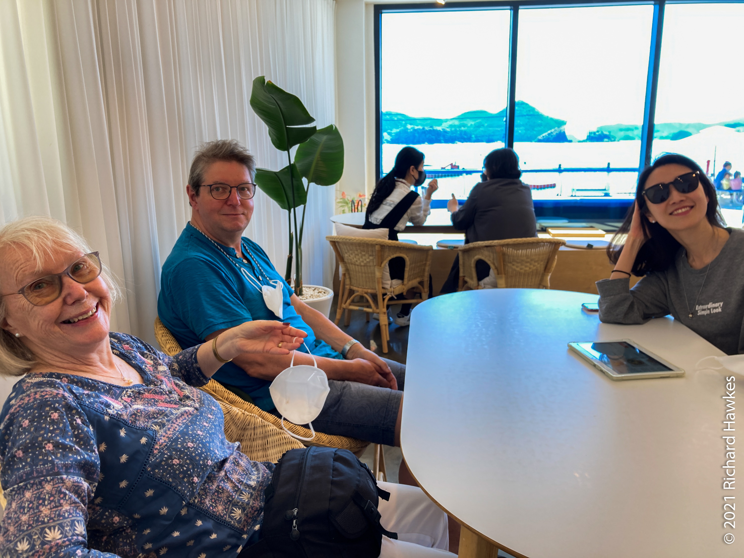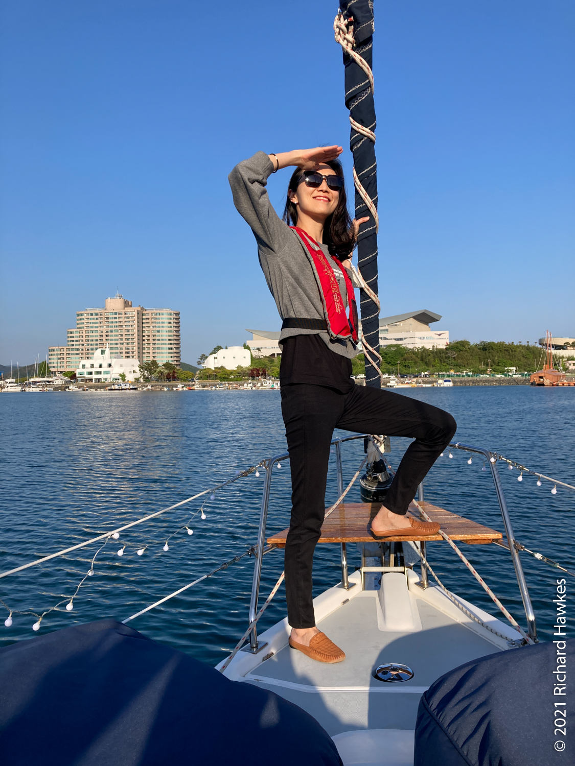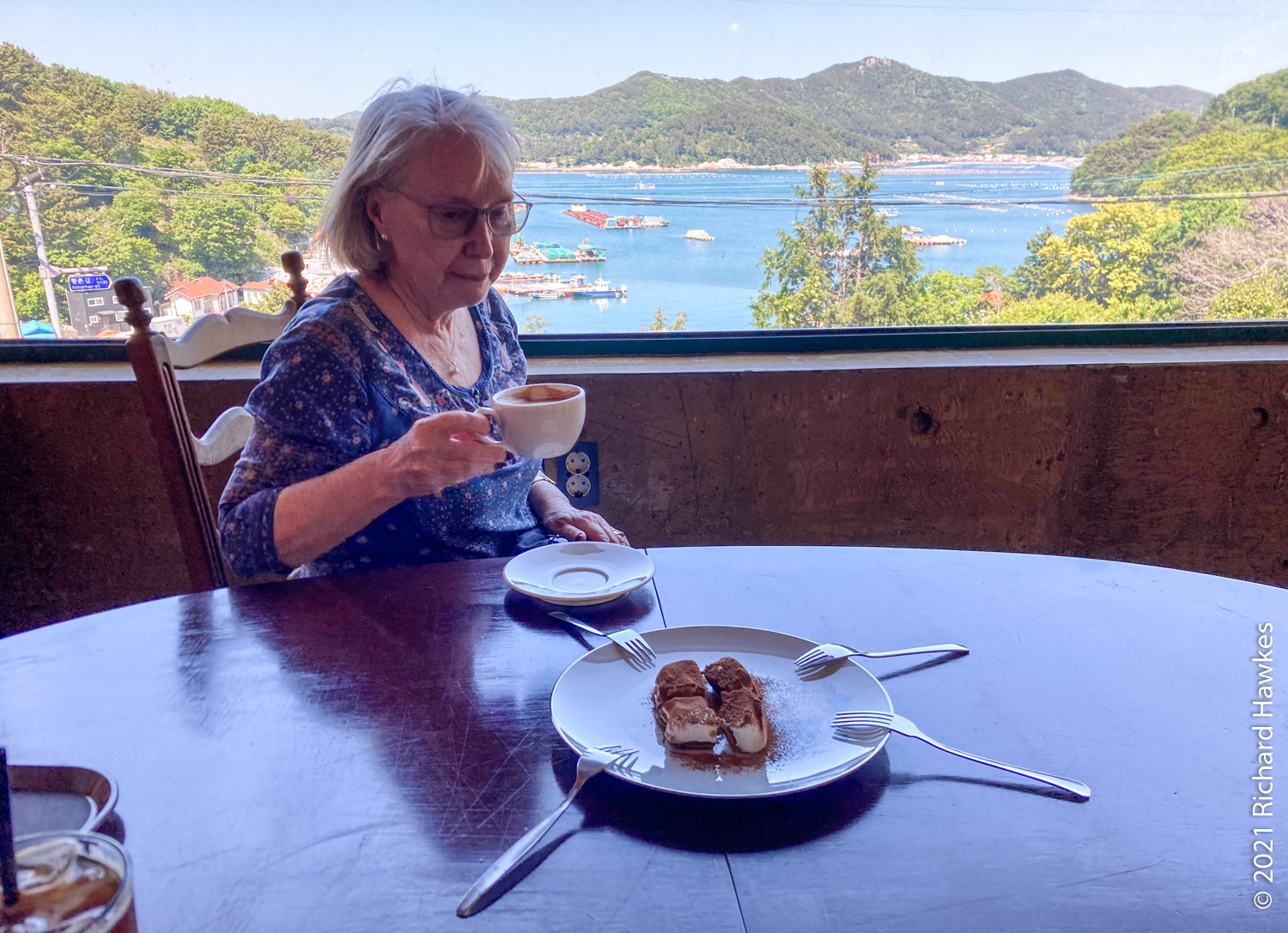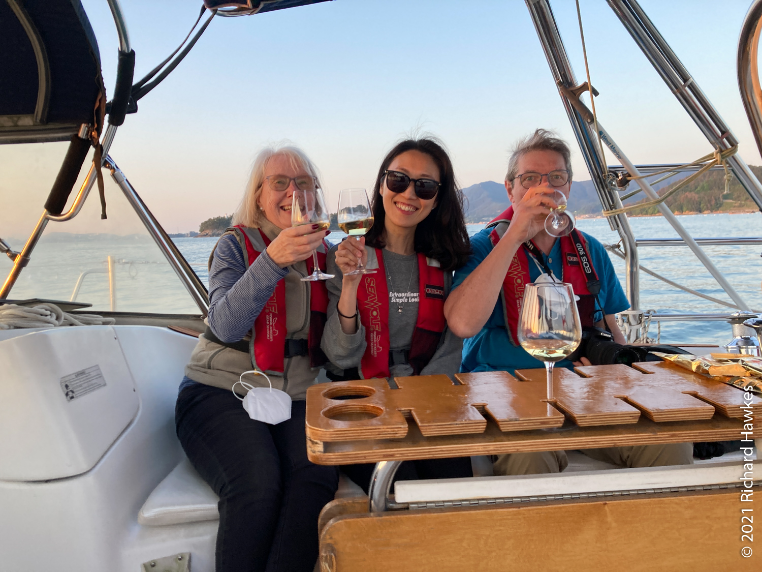 The perfectly calm weather made for an extremely pleasant trip but there wasn’t enough wind for sailing. Romana and I sat on the front deck and enjoyed the relaxing ride. Along the way there were other pleasure boats out with various levels of fun, from music and lights and drink, to calm and quiet like ours! There was also a section near the island filled with jelly fish, and also plenty of seagulls following us. Hansando looked lovely from afar and we spent a short time in the bay taking photos. The captain even broke out a bottle of chilled white wine (we paid for it) and we had a glass while sitting on the water; nice! On the way back to Tongyeong, we got to see the sunset over the hills which rounded off the trip perfectly.