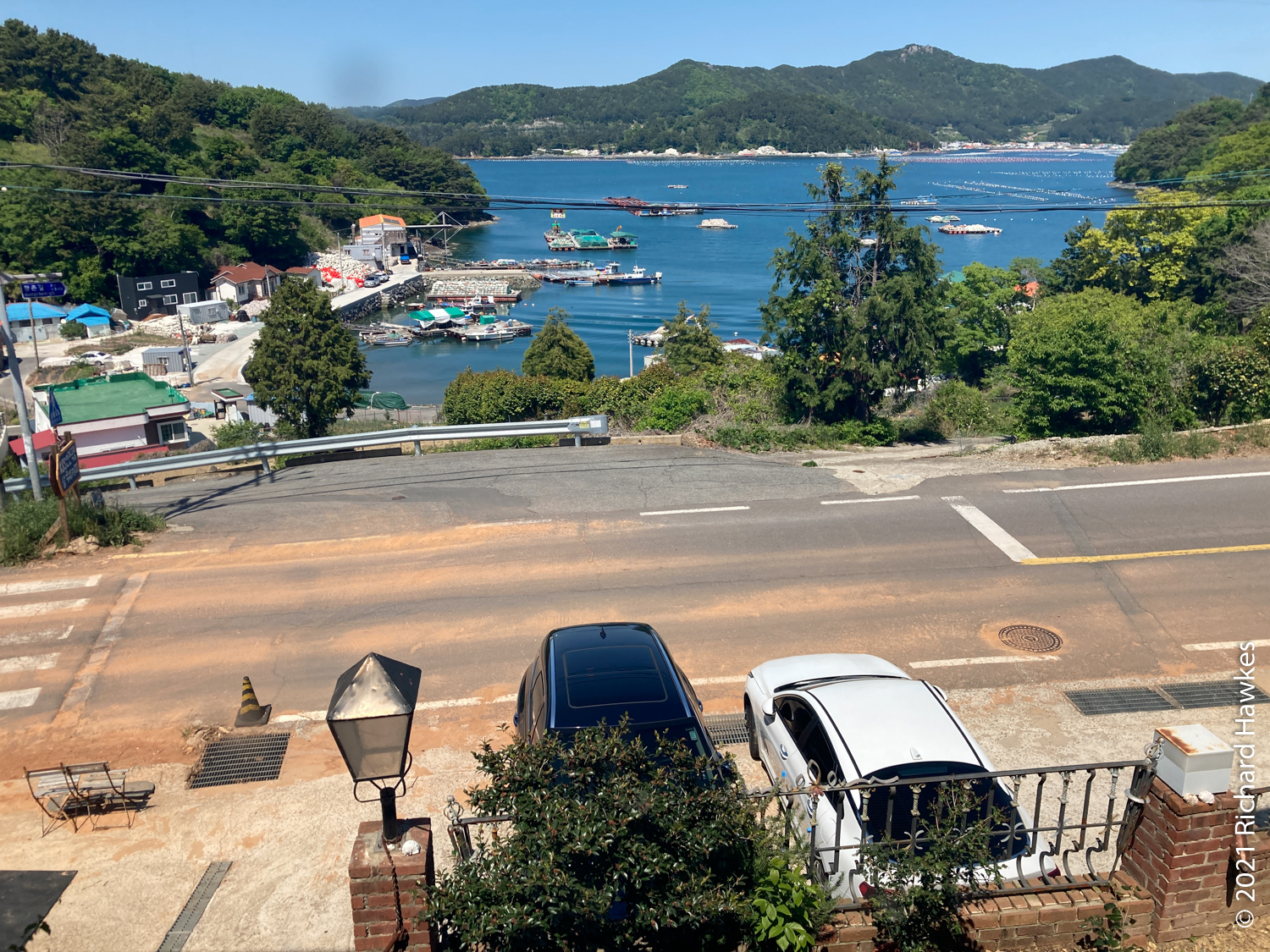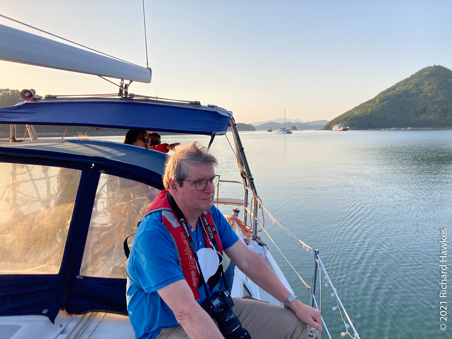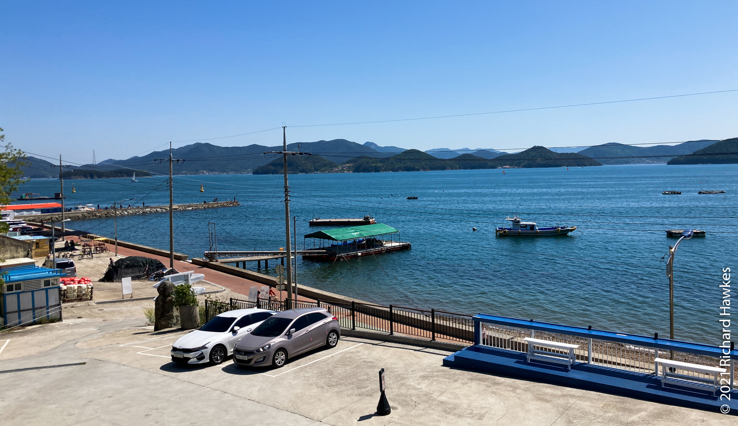 The coffee shop was right by our accommodation, so we took a short rest and a nap while Romana spent some time calling around to find us a reasonably priced sailing trip. It wasn’t easy due to this being a holiday week, but she persevered and got one. We set off in the early evening and found the boat and captain. There was us four and a couple on the trip. The captain took the boat out and piloted us to Hansando, and island that is part of the National Park and a historical place connected to the famous naval general. I’d also driven around here last year!