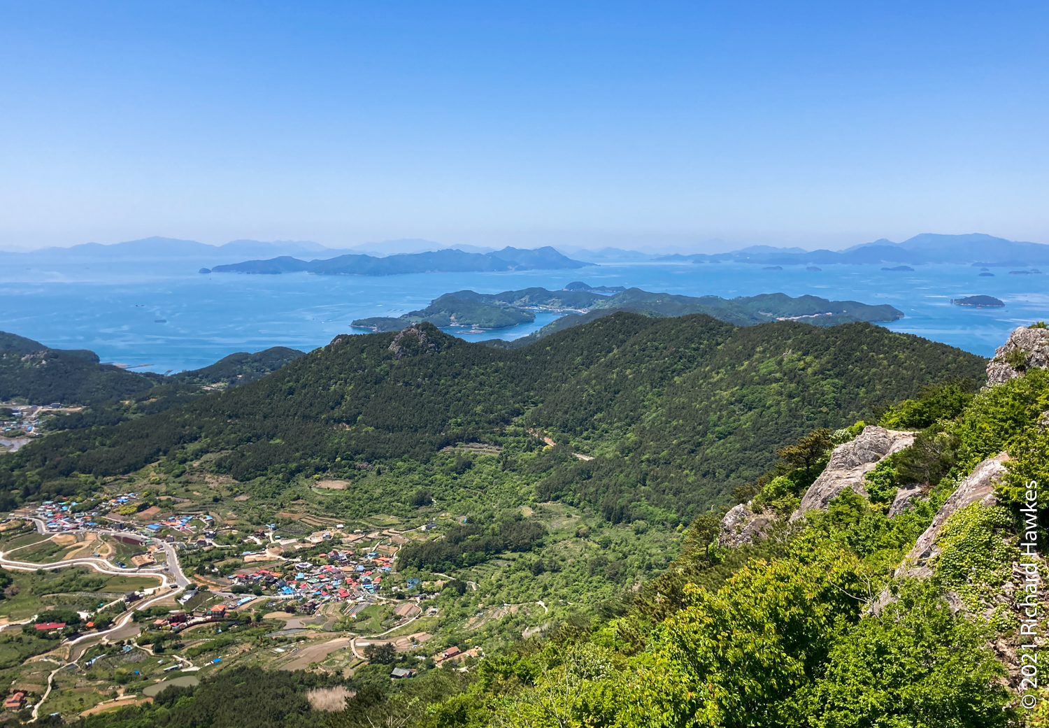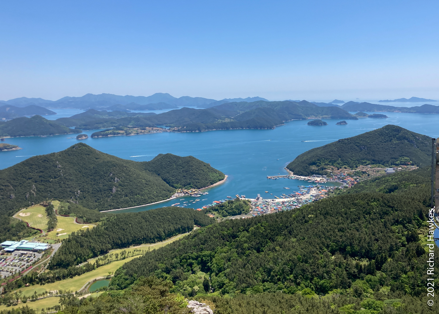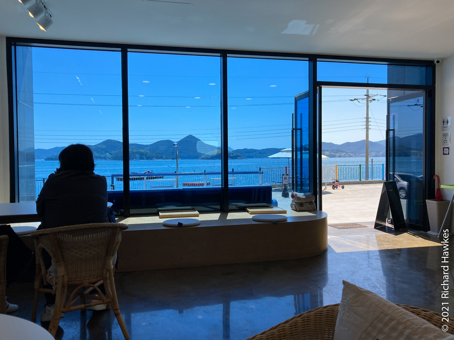 The coffee shop was right by our accommodation, so we took a short rest and a nap while Romana spent some time calling around to find us a reasonably priced sailing trip. It wasn’t easy due to this being a holiday week, but she persevered and got one. We set off in the early evening and found the boat and captain. There was us four and a couple on the trip. The captain took the boat out and piloted us to Hansando, and island that is part of the National Park and a historical place connected to the famous naval general. I’d also driven around here last year!