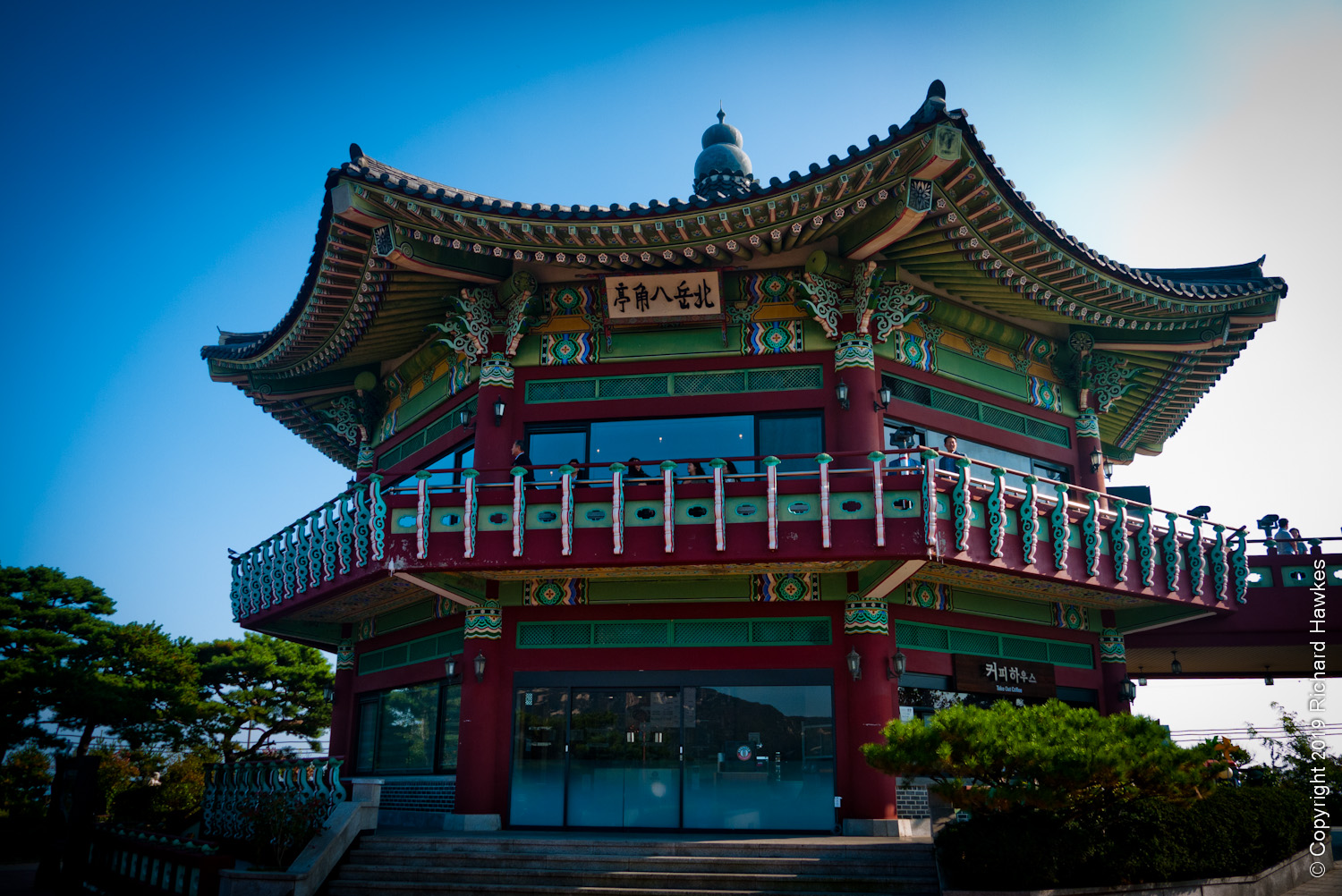 Along the way is Bugak Palgakjeong Pavilion (북악팔각정) with a garden, restaurant, coffee shop (10% discount if you show them your bicycle!) and an Emart24. There are great views north towards Bukhansan, one of the most popular and largest ranges near Seoul.