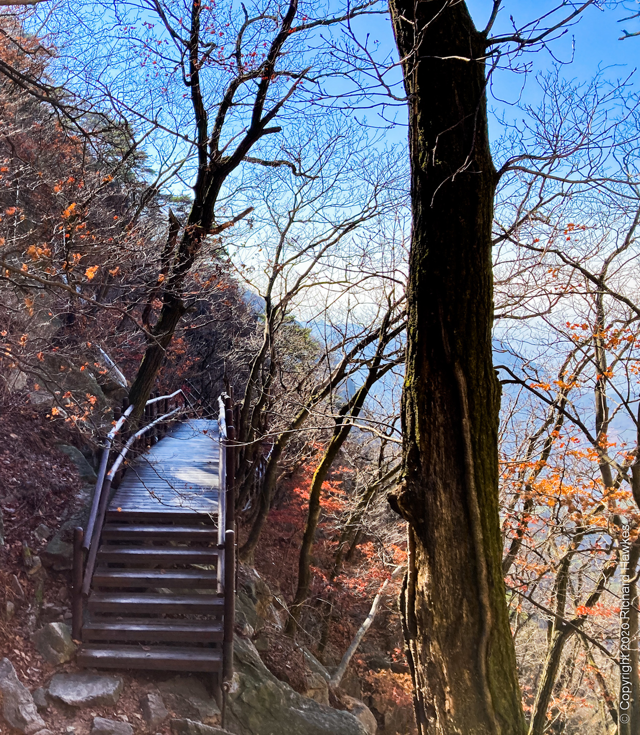 It got steeper as I got away from the stream and I was soon feeling very small looking up tall, sheer rock faces. The trail is well used and in good condition and there are some stepped parts. There is also a trails leading south at one point, and a main intersection at Baegunbongammun gate (백운봉암문) which is the intersection that takes you to north and up to Baegundae peak or further east to Uidong (우이동).