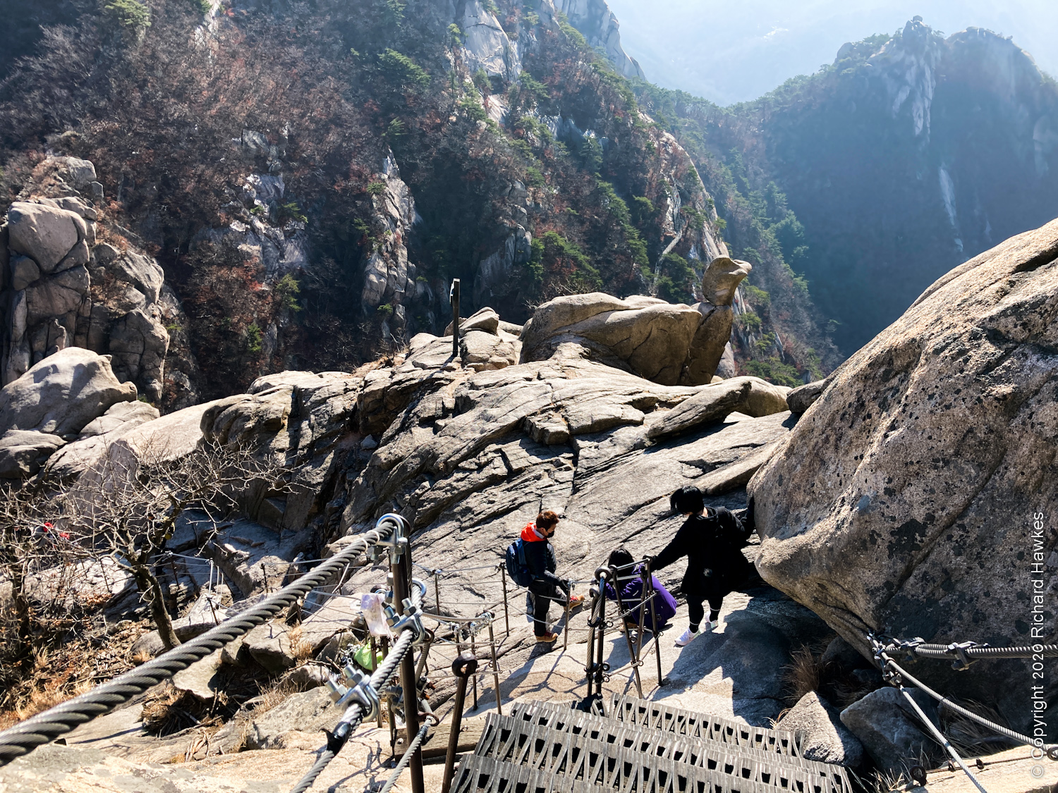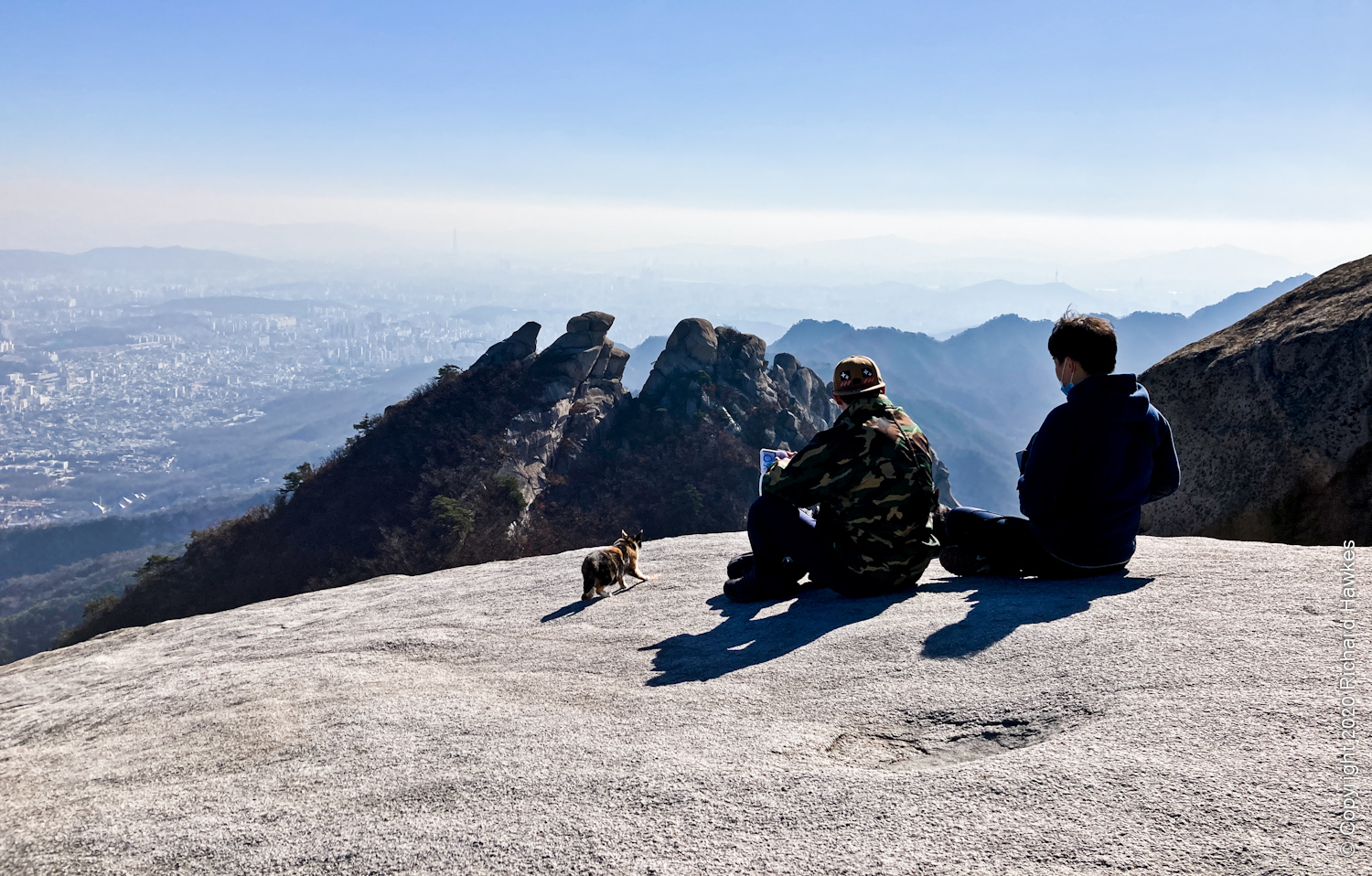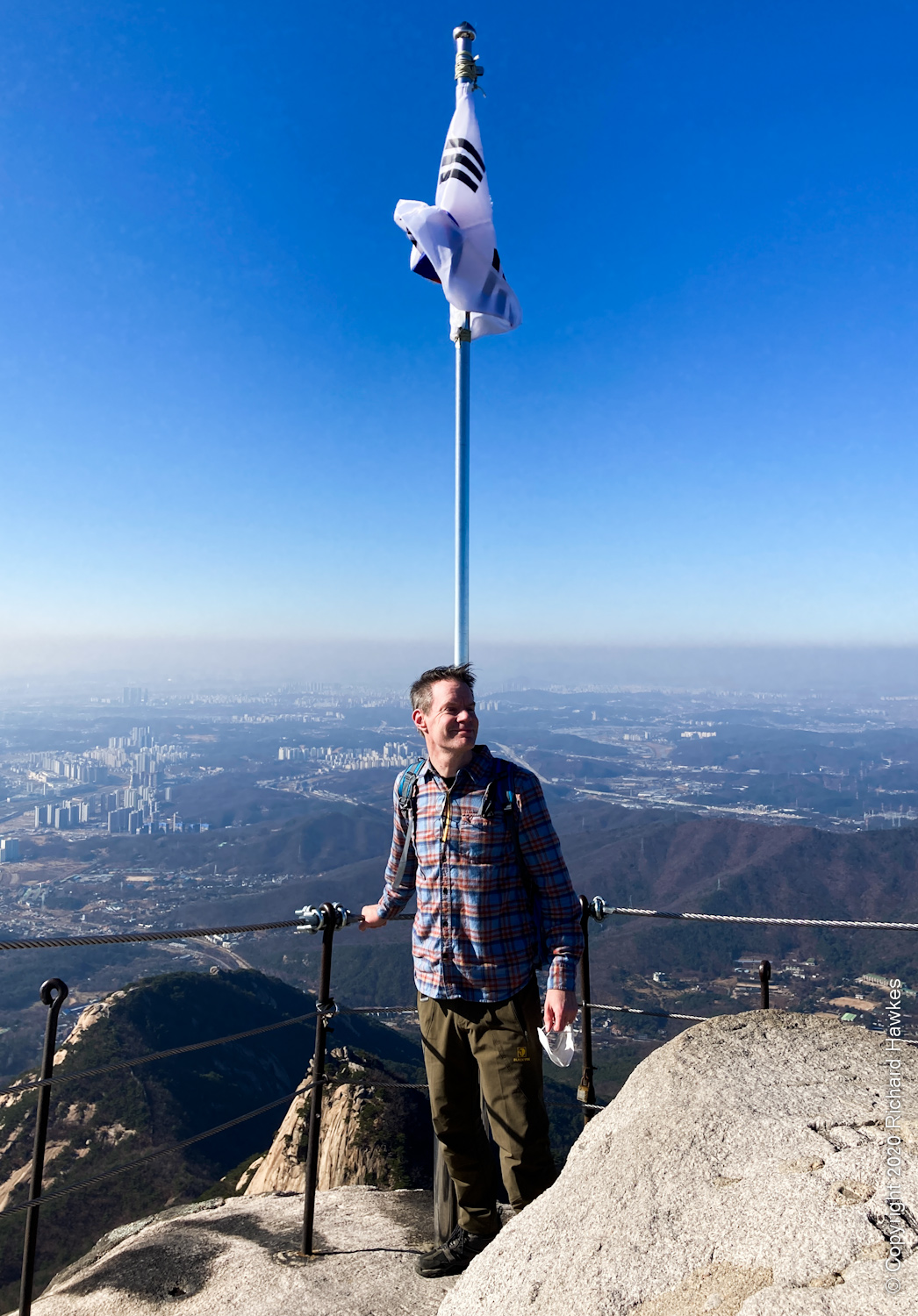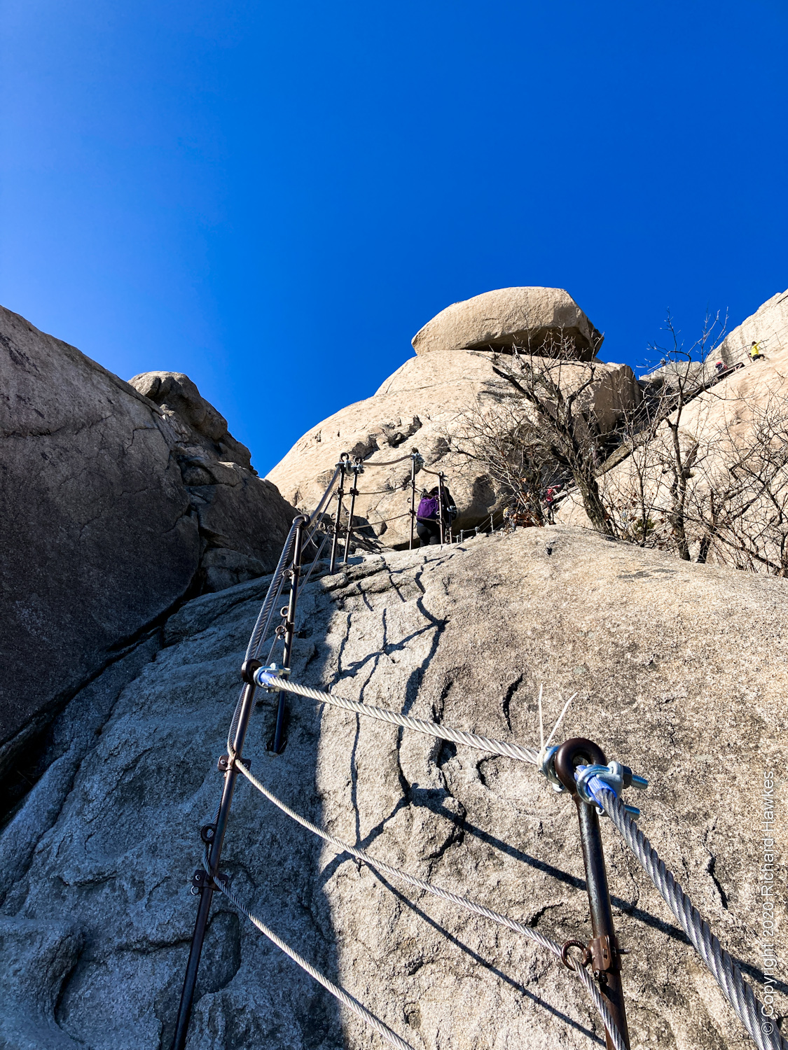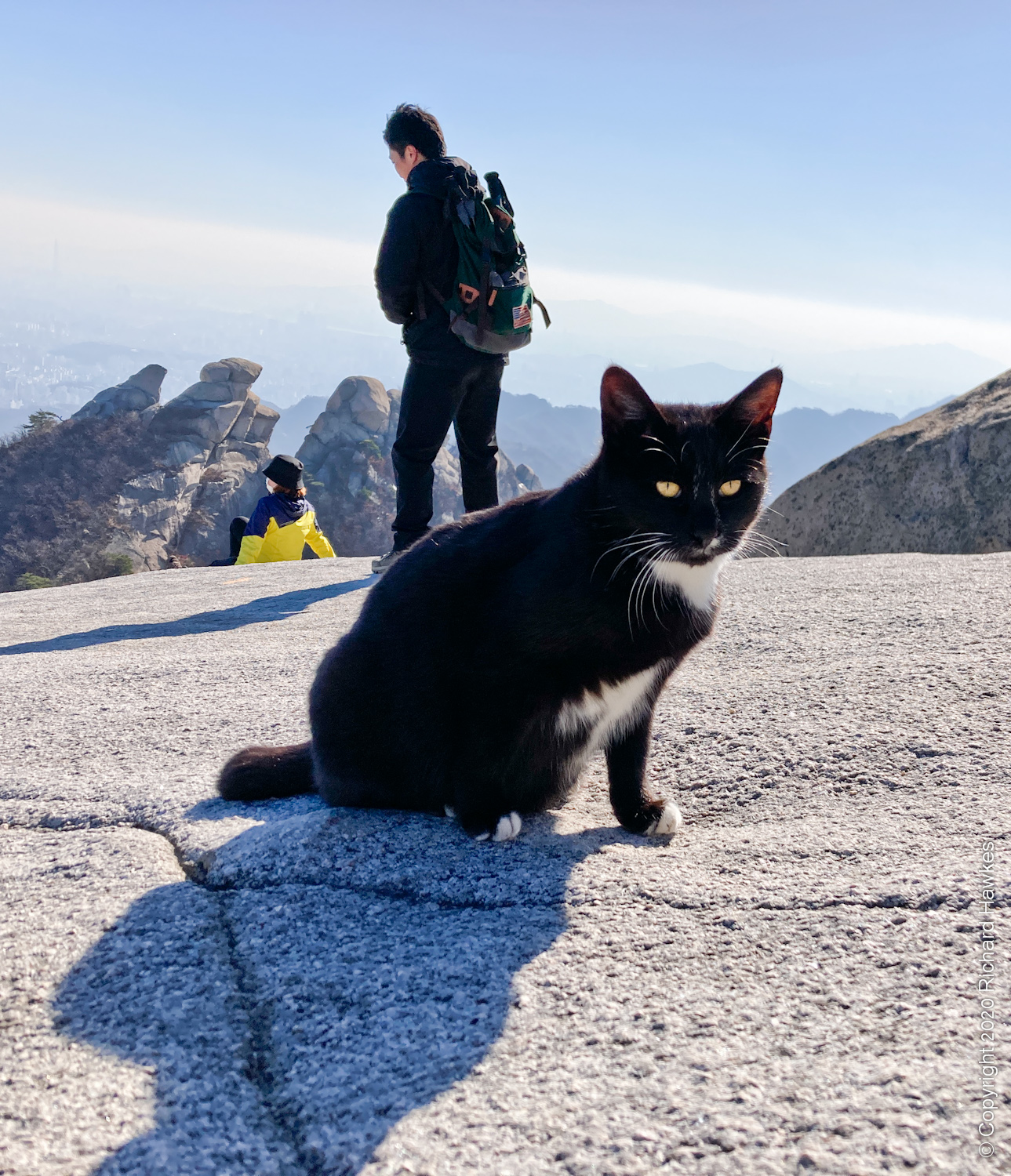 The next section is quite tough; it’s up, up, up. There are lots of steel railings at this point and a few steps. Also, due to the foot traffic, a lot of the rock has smoothed somewhat, so even without ice, it can be a bit slippery; be careful! The views are great though, and it’s no wonder why people stay up here and picnic for a bit. Looking around, you can see parts of Seoul and there’s wide plataeu area fro relaxing a bit. The peak has a few friendly kittens walking about. The actual peak has a flag and some friendly hikers took a picture of me. I rested myself with a snack and disappointed a kitty by not giving them food…