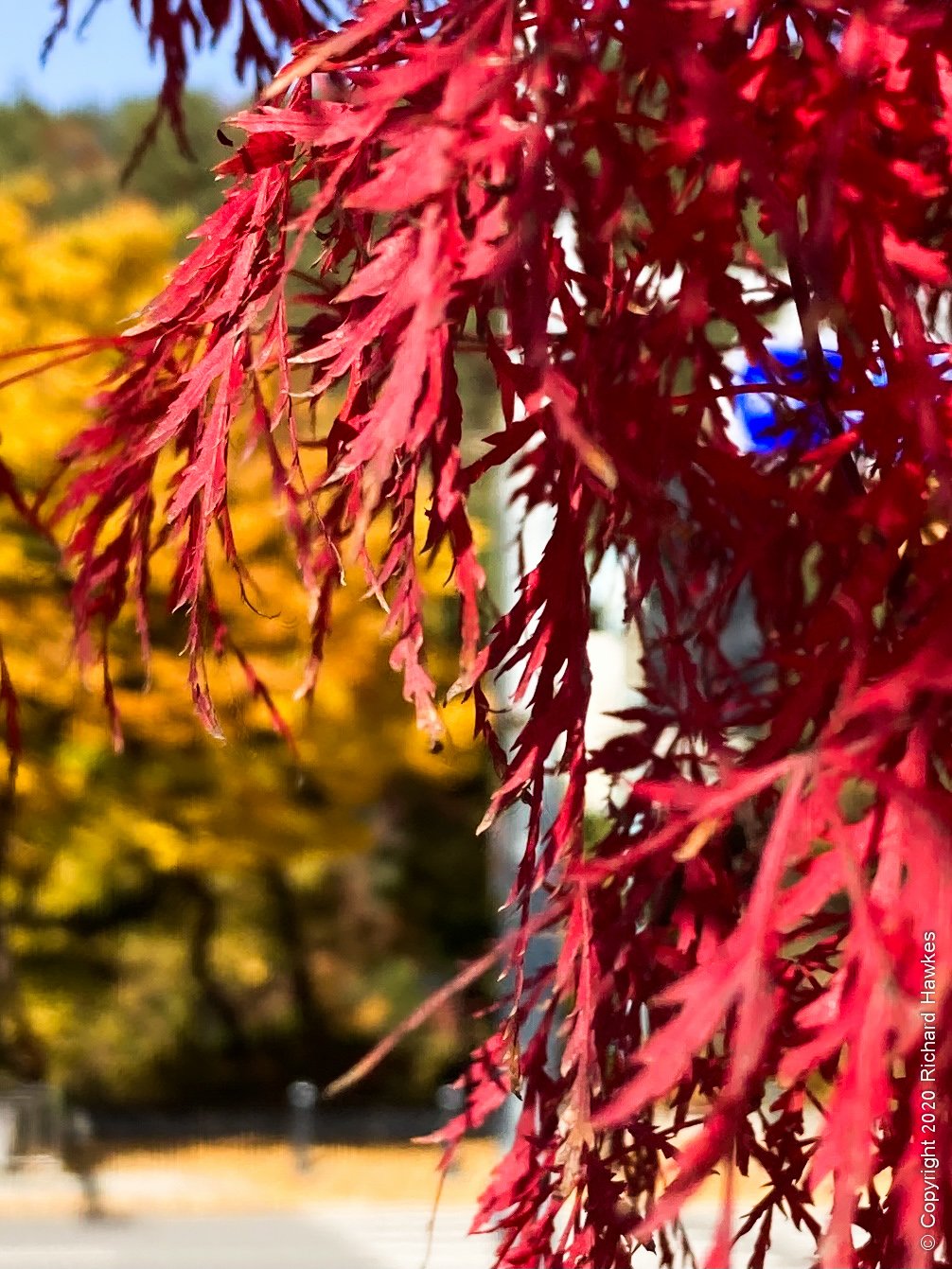 Back at the park entrance, I noted the myriad hiking shops for later then had a coffee at Maruni coffee (마루니) at a table with a great view of Nogosan (노고산?). While waiting for my bus after, I went to another stream and saw some more nice Autumn views with a different mountain in the background.