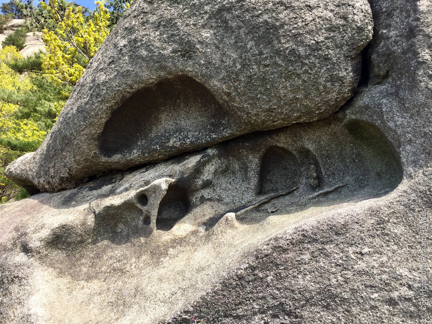 One on the trail, I really enjoyed the light green new leaves of spring. The sun was out, there was a nice breeze and not too many people on the trail. What I like about this mountain is that you don’t have to get too high before you come across real rock and granite. There are huge ‘slabs’ of it quite early on which just feel nice to walk on, even amongst the trees. I came across an interesting rock that looked a little like a turtles face. There were quite a few rocks that had rounded pits, that I assumed were from rain? Ask a geologist! I also passed the remains of Buram Fortress. Nothing there now, except a helipad and a plaque.