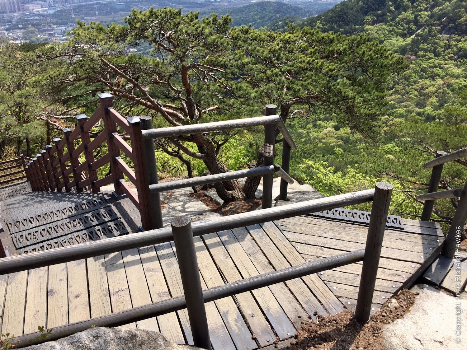 After the helipad, there was short hike downwards before getting the start of the main ascent. This is what I remember coming down back in 2018 and having to double back a few times as it wasn’t obvious what the best way was. Going up would be much more straightforward. The lovely rock is perfectly steep in that it feels nice to go up, it’s solid underfoot, and it doesn’t make you feel like you’re going to slide onto your butt. A little way up, I was on odeng restaurant in a tent, but there wasn’t anyone around; maybe next time. Across from that was my lunch spot, a slightly sloped bit of rock looking west towards Dobongsan. It was a fine location to rest before the big, steeper push to the peak.