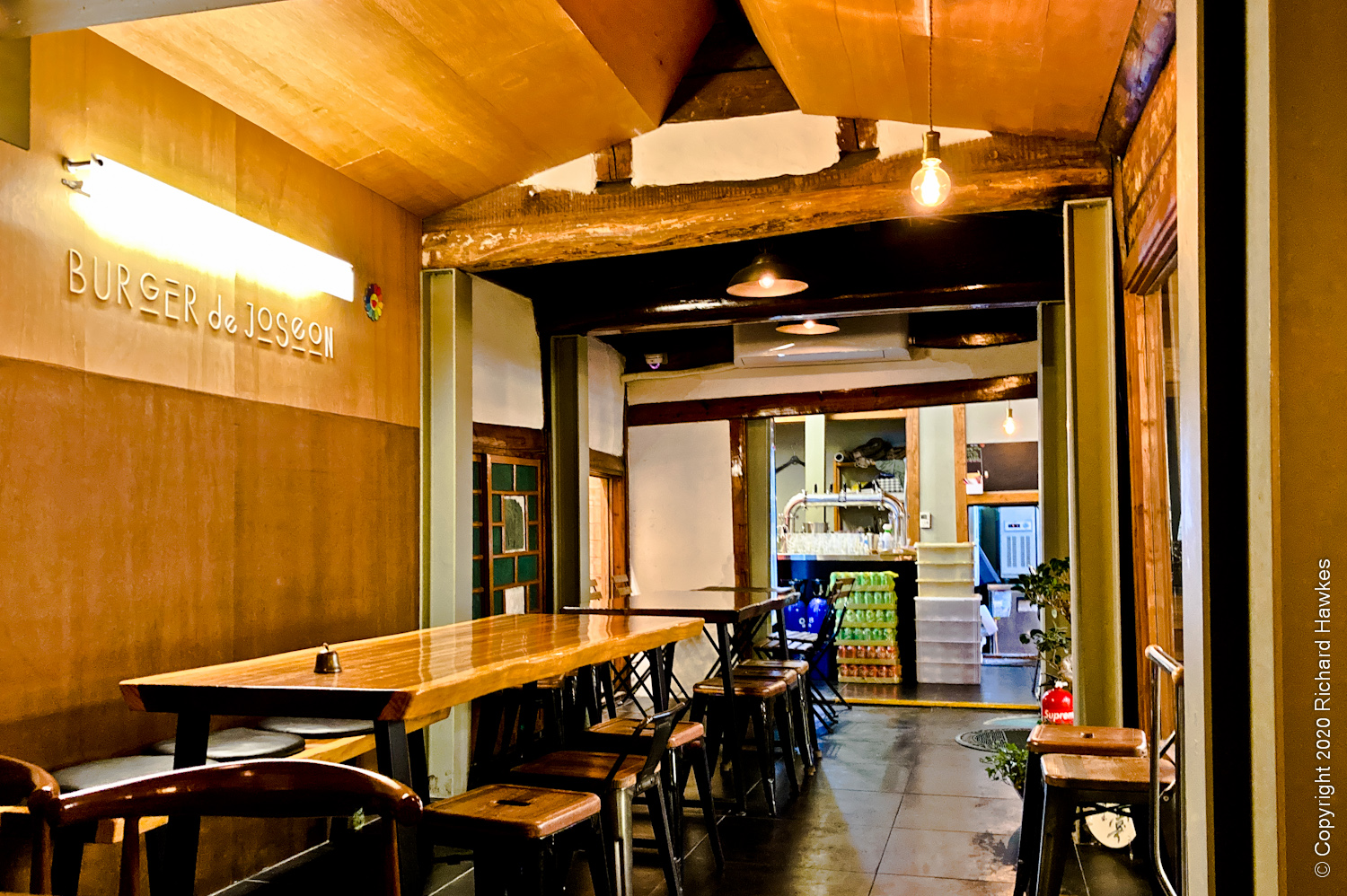 Burger de Joseon is behind a white tiled wall with a small door. Through the door, you enter a small courtyard with a few seats and the main wooden building on the left and in front of you. It really is an idyllic, quaint looking place, the type of place where you think, “yes, they did this right!”