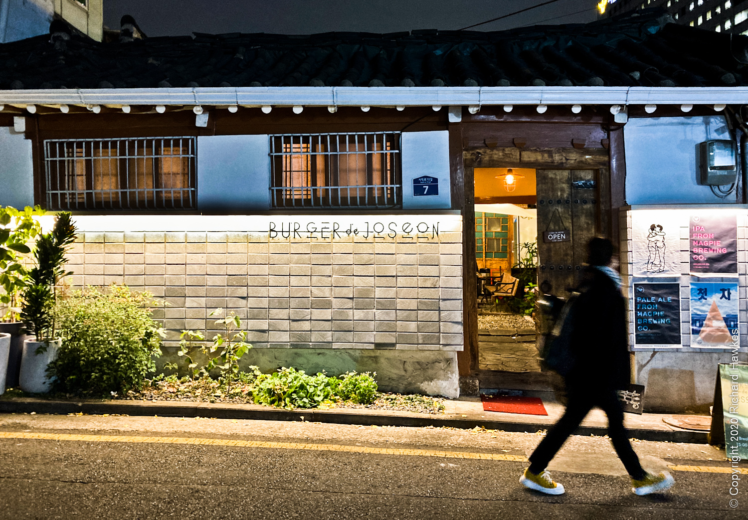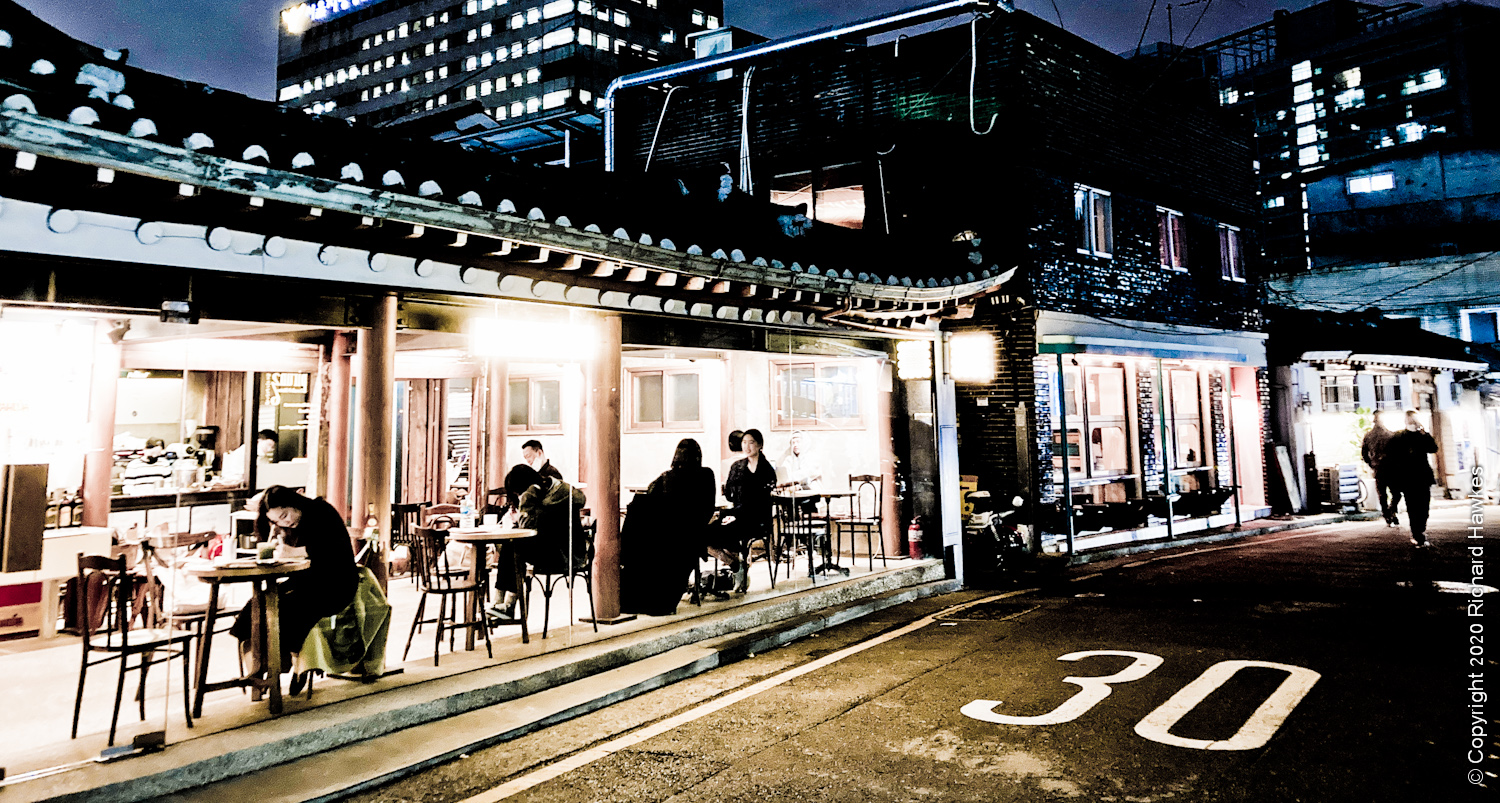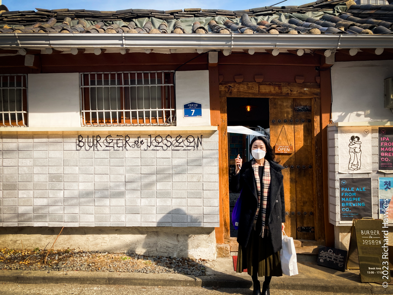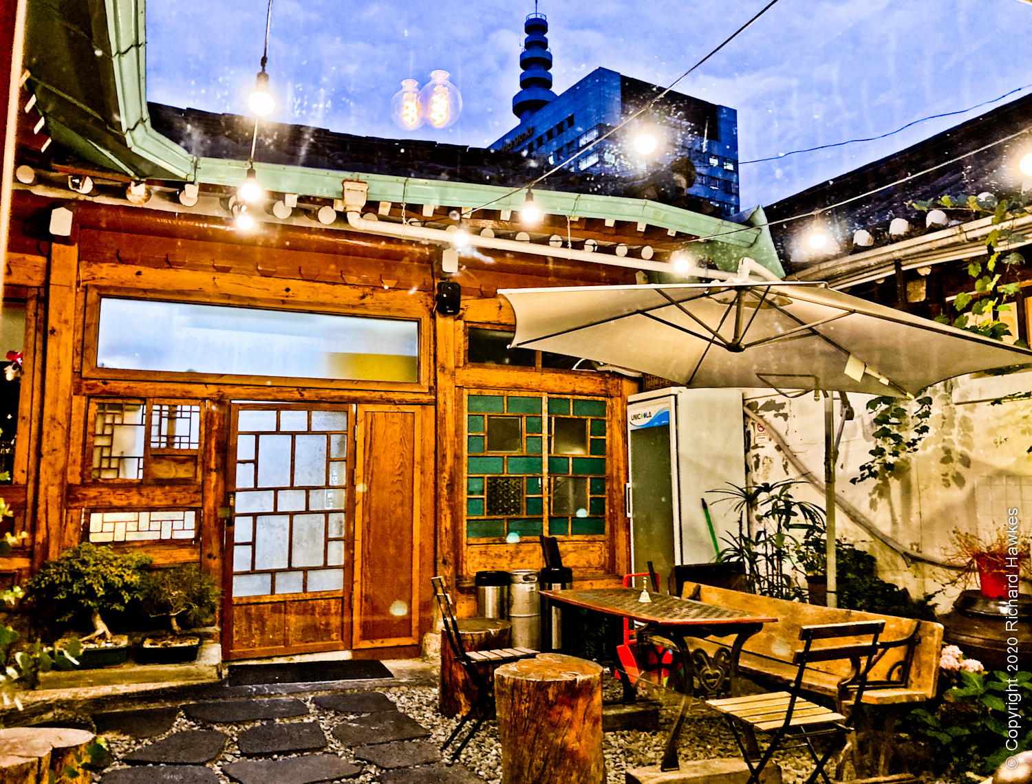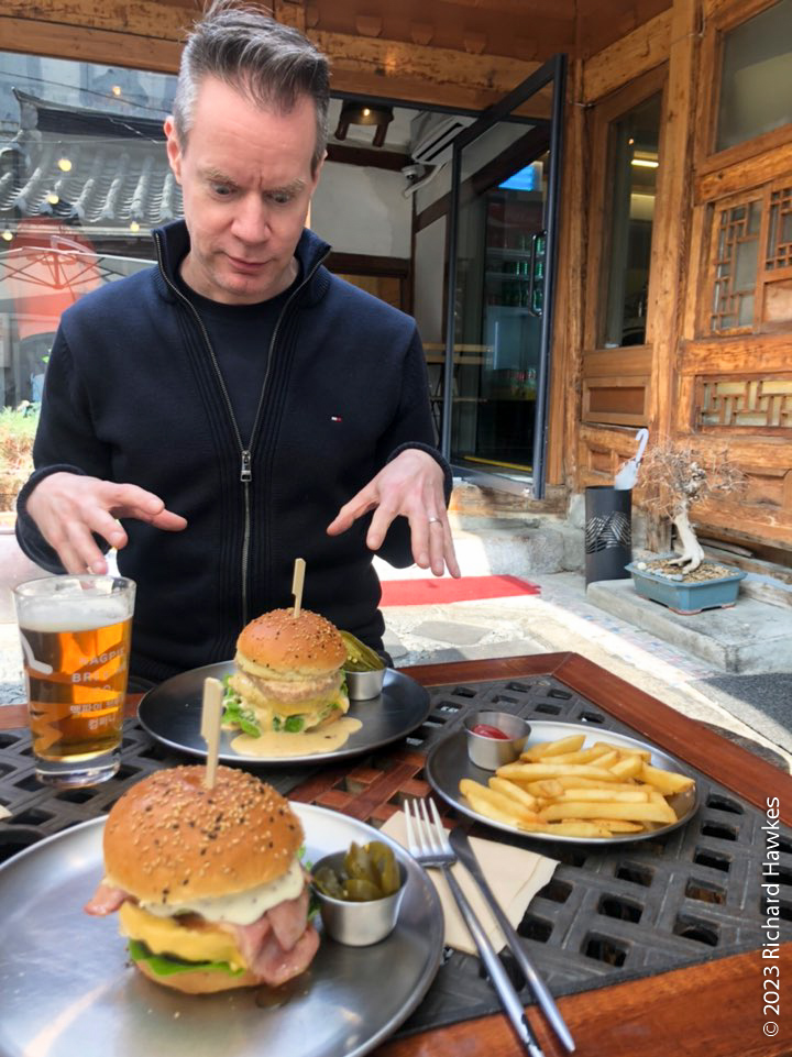 I left the house quite late to go to a rooftop I’d heard was free to go up, and has good views over Gwanghwamun Square and Gyeongbokgung Palace. Looking for something nice to eat after, I found Burger de Joseon (버거드조선). It’s a restaurant in an old traditional Korean house in an oldish part of town. This is an are where buildings are being refurbished rather than knocked down.