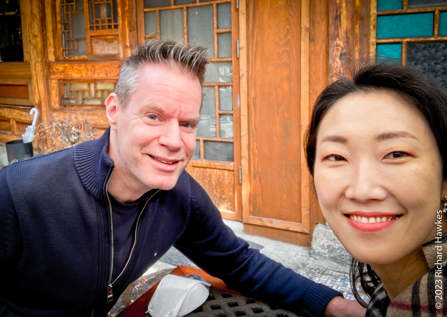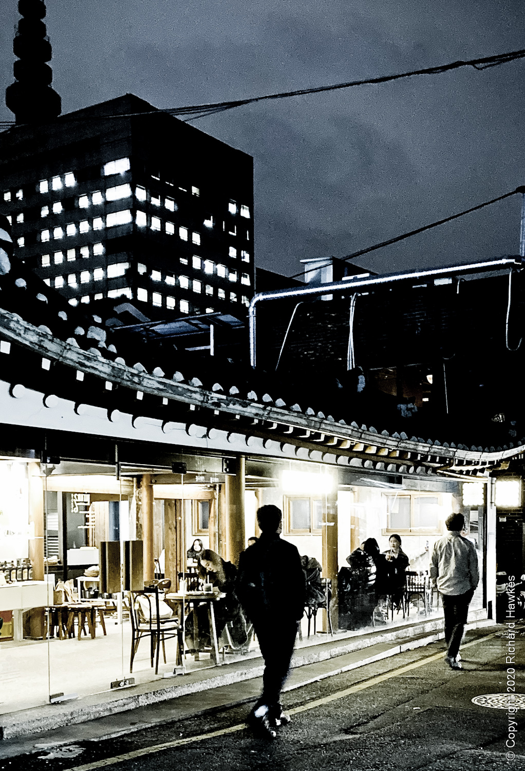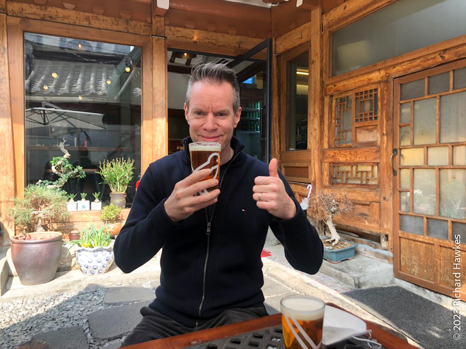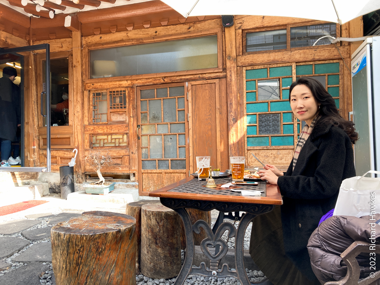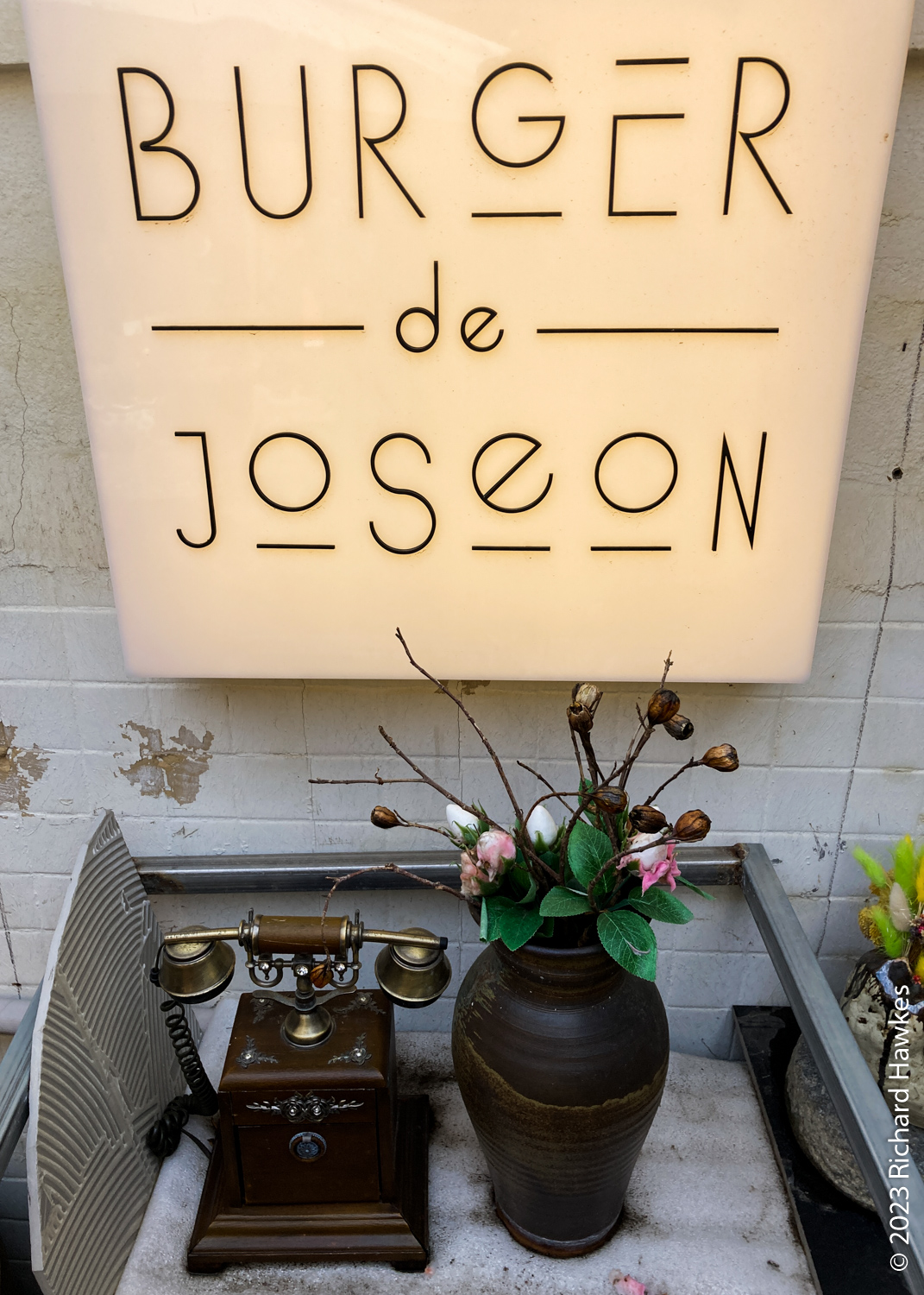 I left the house quite late to go to a rooftop I’d heard was free to go up, and has good views over Gwanghwamun Square and Gyeongbokgung Palace. Looking for something nice to eat after, I found Burger de Joseon (버거드조선). It’s a restaurant in an old traditional Korean house in an oldish part of town. This is an are where buildings are being refurbished rather than knocked down.