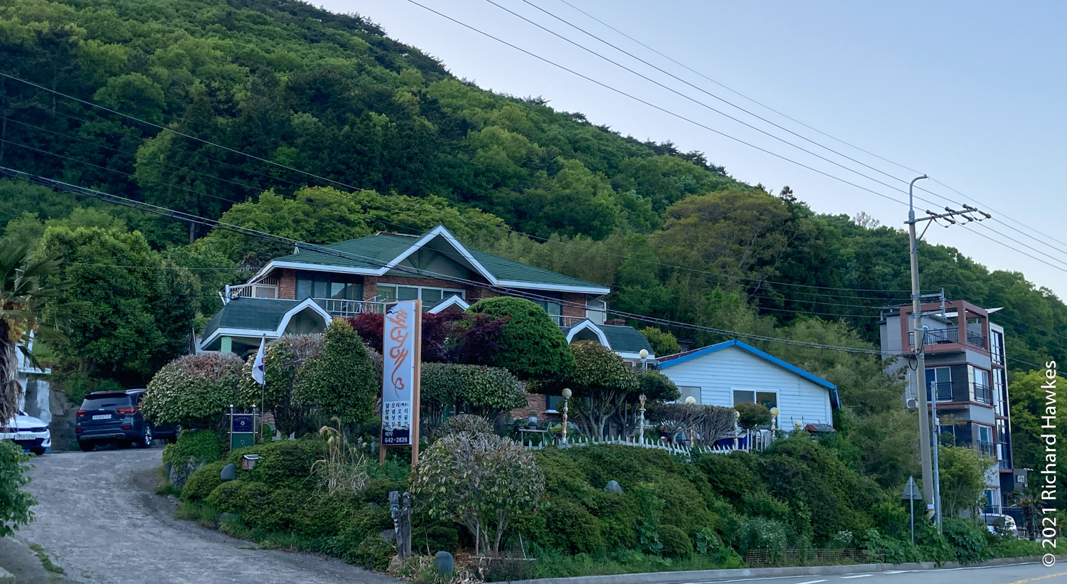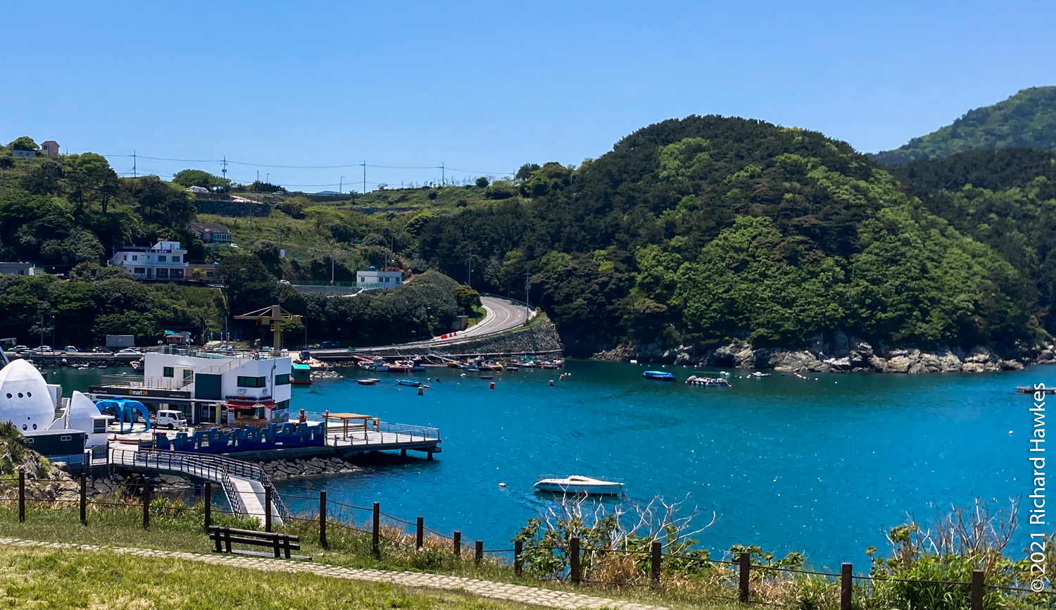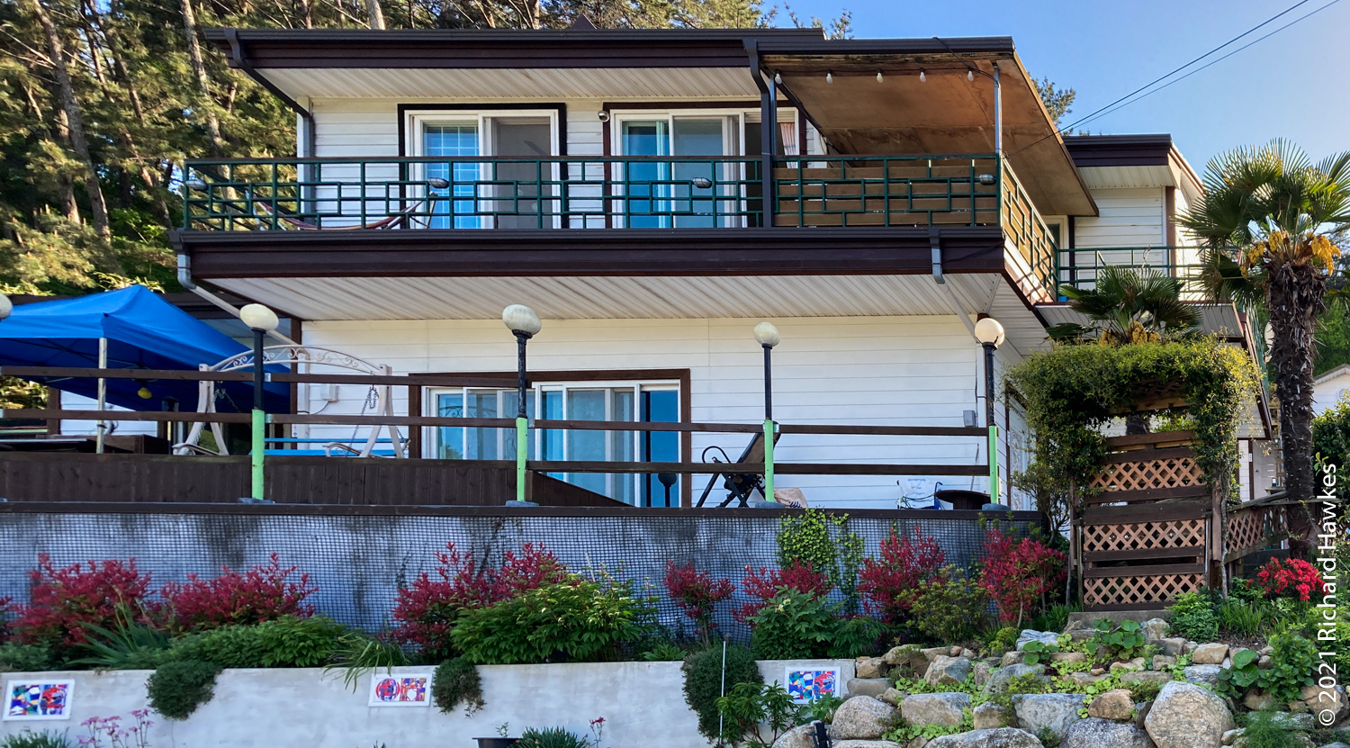 Next was the drive to Tongyeong. Our accommodation was on the western side on a peninsular, in the last house on a dead-end road in the hills. It was called Yeonji Pension (연지 펜션) and I found and booked it through Naver Maps. It was quite a lucky find as this was a holiday week. We had the second floor. There were two bedrooms, a large lounge / kitchen, and a veranda with a picnic table. The view from the balcony and lounge was lovely, looking all the way down to the sea at the end of the road. It was peaceful too; just the sounds of birds.