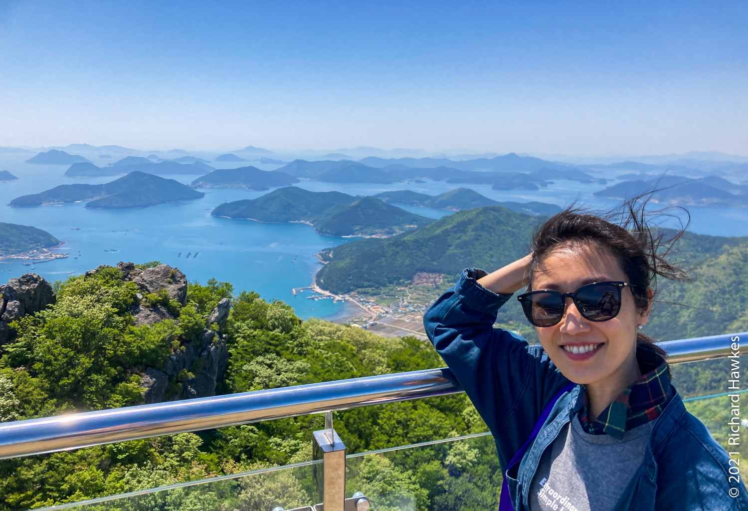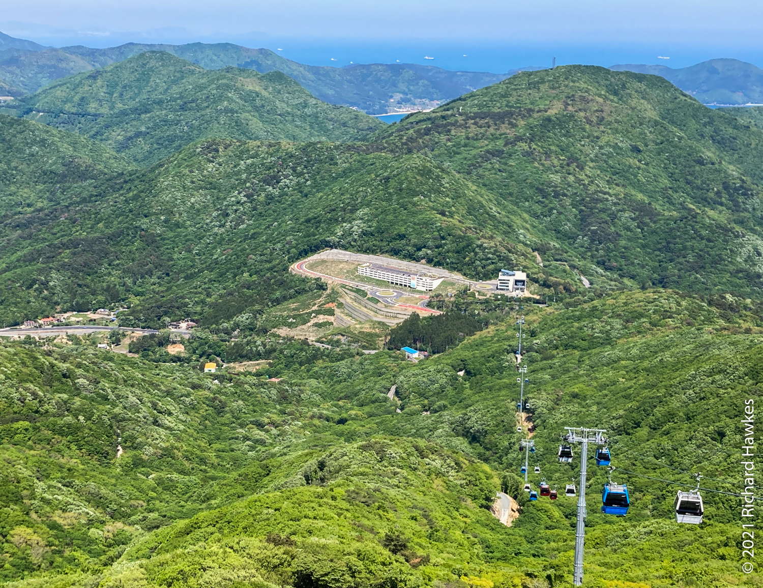 Next, we drove farther south to Sinseondae Rocks to explore the rocky coastline, then to Windy Hill by a fishing village. I’d visited this area alone almost exactly two years ago. The rocks were still rocky and the hill was still windy! We had a brief ice cream break before deciding to head to Tongyeong. We’d all noticed a cable car I had no idea existed till that moment, so we decided to go. It is the Geoje Panorama Cable Car (거제파노라마 케이블카) and it was brand new. I expect we were some of the first visitors. The top and bottom had plenty of places to eat and drink, and the car park was huge–they’re probably expecting huge crowds one day.