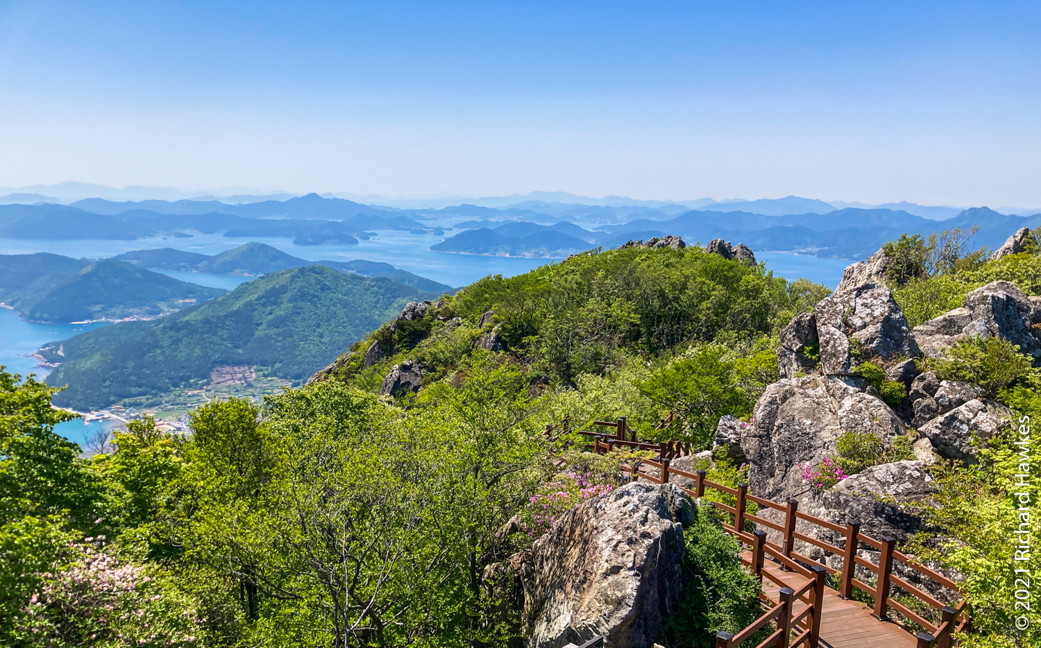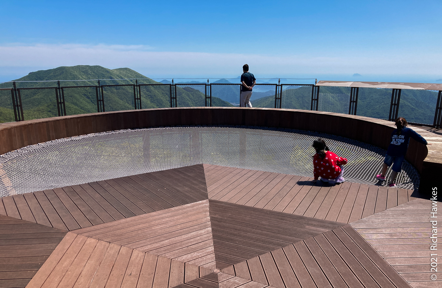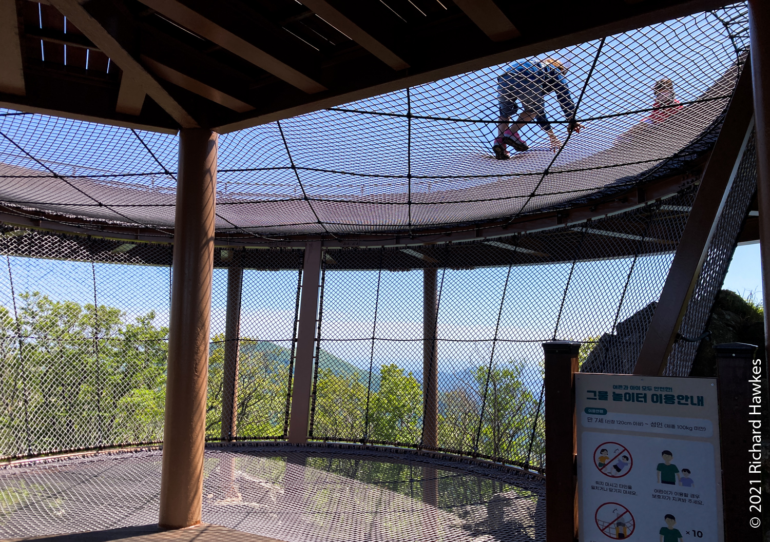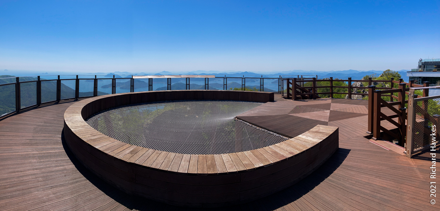 It was extremely windy at the top but the views were stunning. Romana and my parents were impressed with the views of the islands of Geoje and Tongyeong dotted out as far as the eye could see. I wandered up a short walkway to another platform on another piece of rock. There was an odd choice of a bouncy, climbing web contraption for kids to play on, on two levels. I can’t really explain what it was, so look at the photos! I walked on it and couldn’t really see the point of it, but the two kids on it seemed to be having fun. The views of the island in the sea, again, were amazing.
