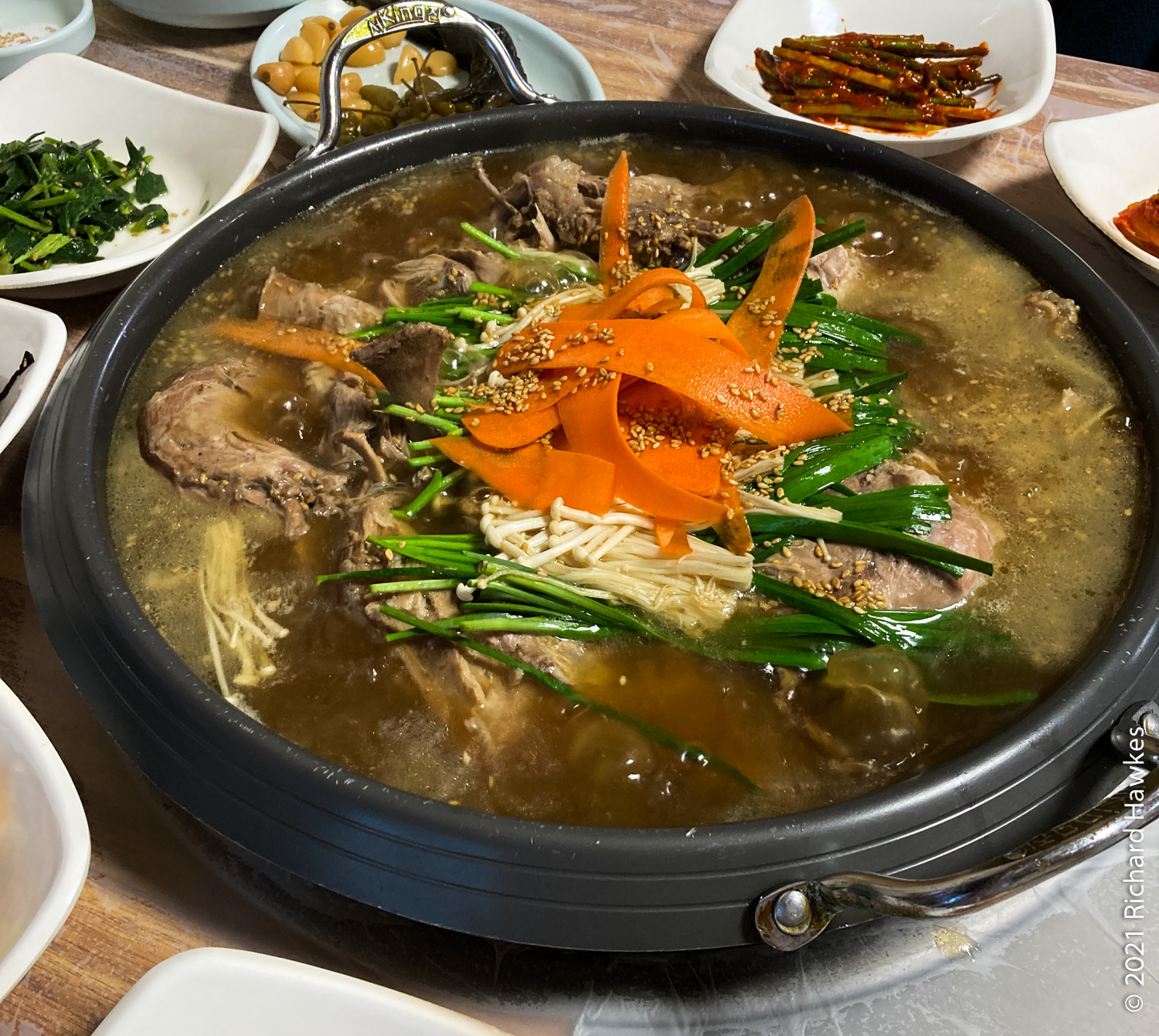 After a rest, we went out to pick up some food supplies, and then went to a duck soup/stew restaurant called Tongyeong Ae (통영애), quite close to our accommodation. The dish was actually ori baeksuk (오리백숙), a hearty, chunky soup made with a whole large duck; this was my first time having the duck version (I usually get the chicken version). At this restaurant, they added local medicinal ingredients which gave it a unique (good) flavour. The old couple who ran it were very nice. The man had pieces of his art put up around the rooms, made with shiny pieces of shell similar to mother of pearl.