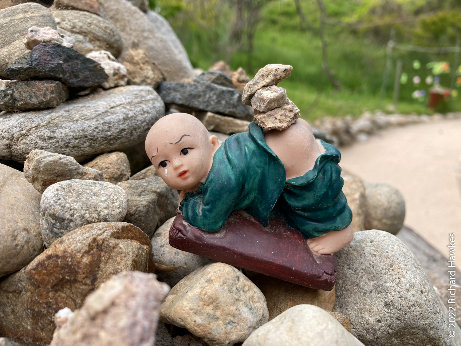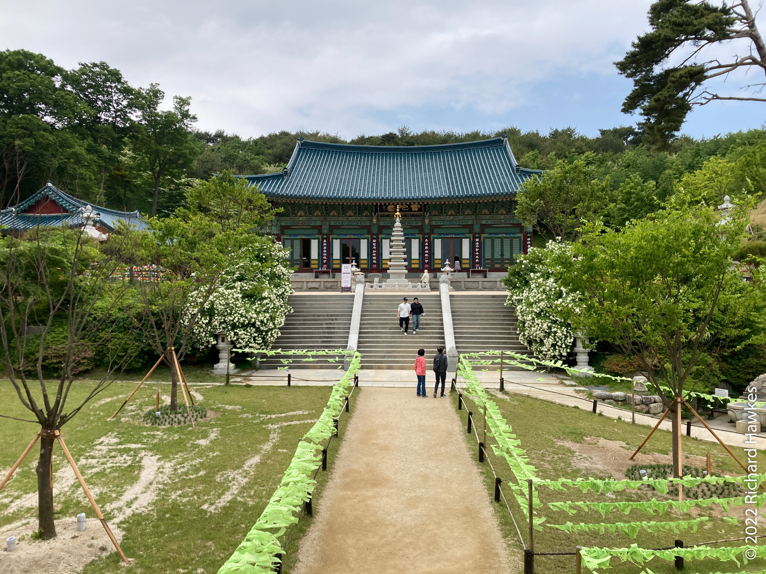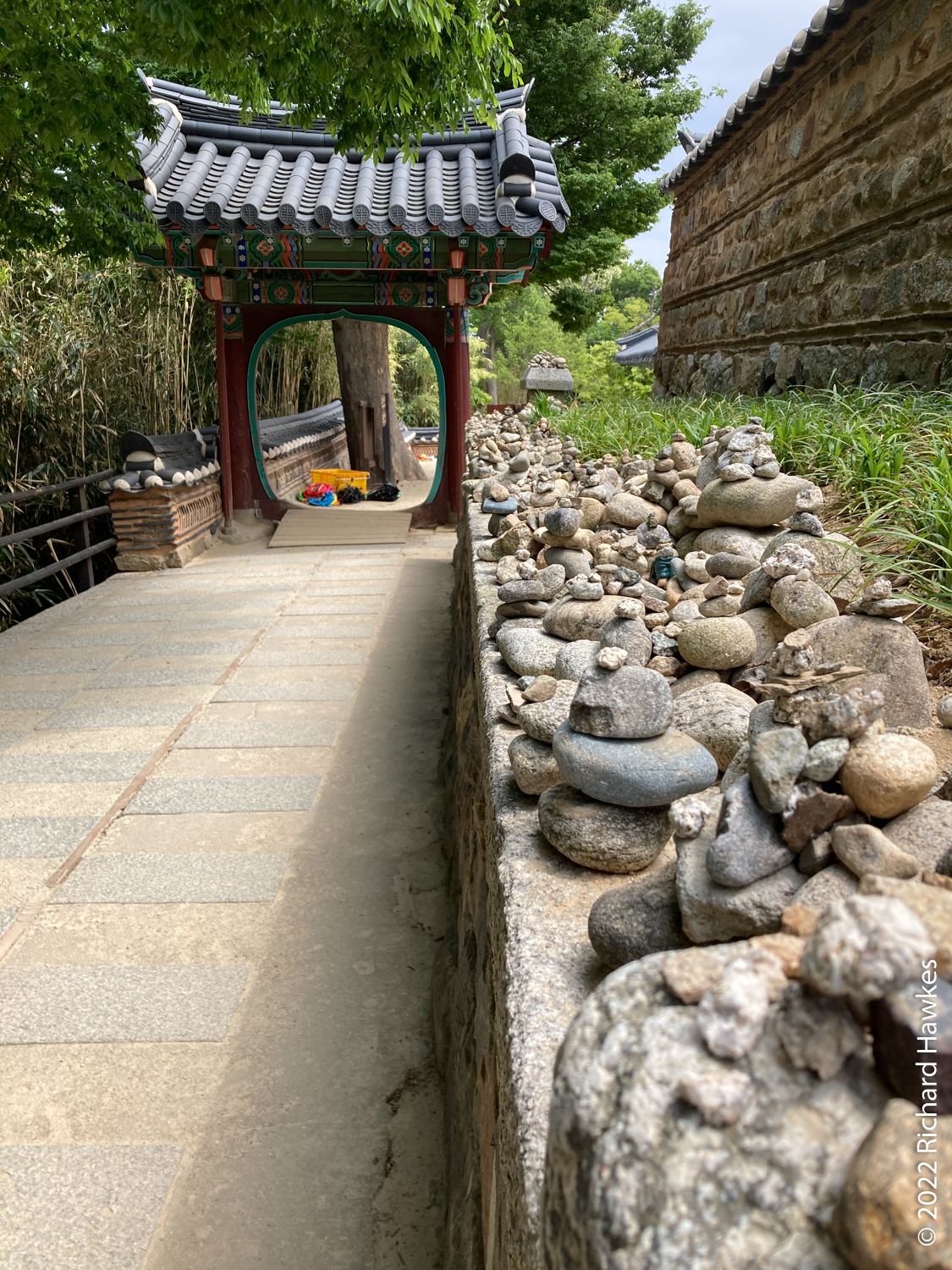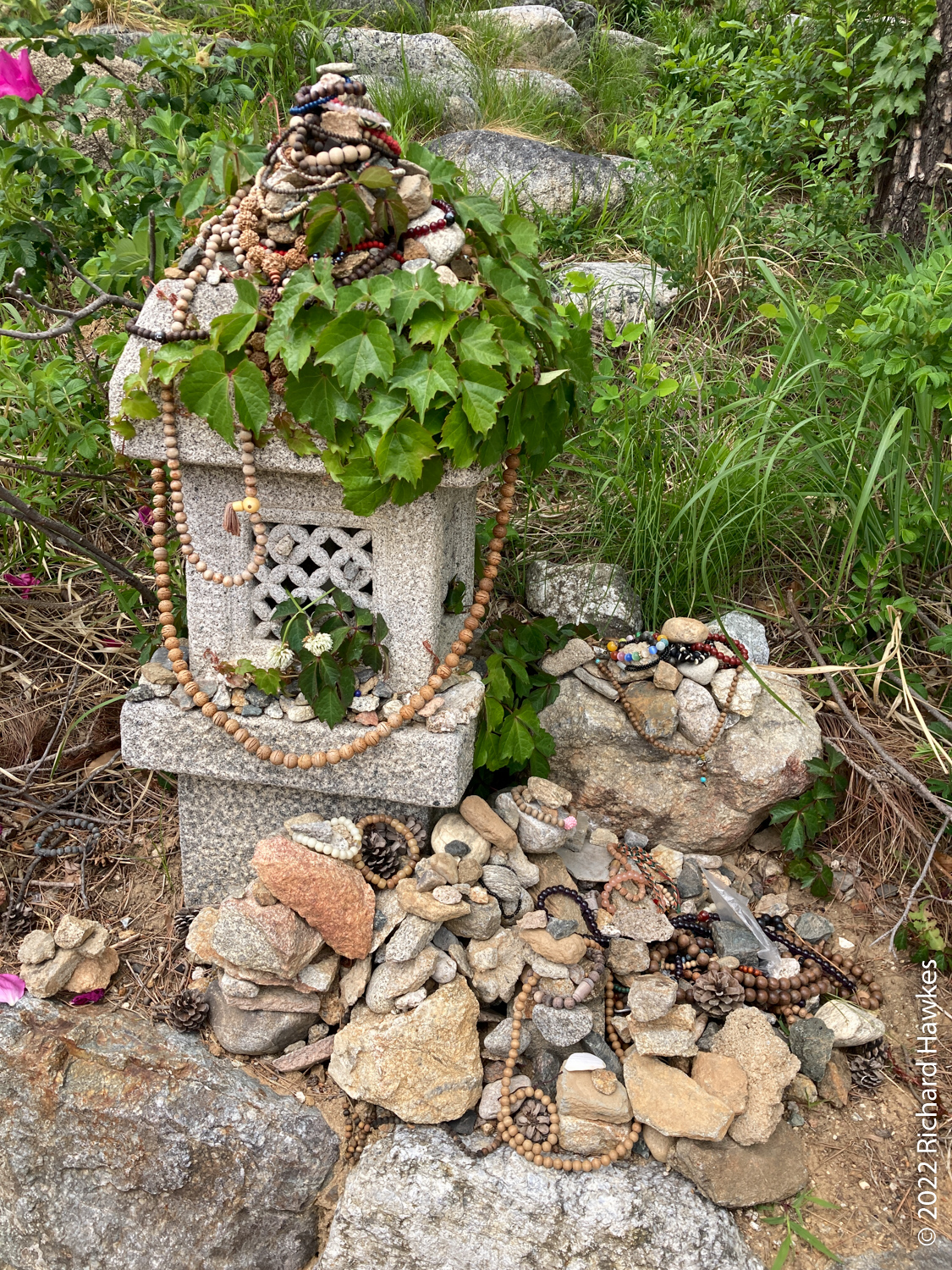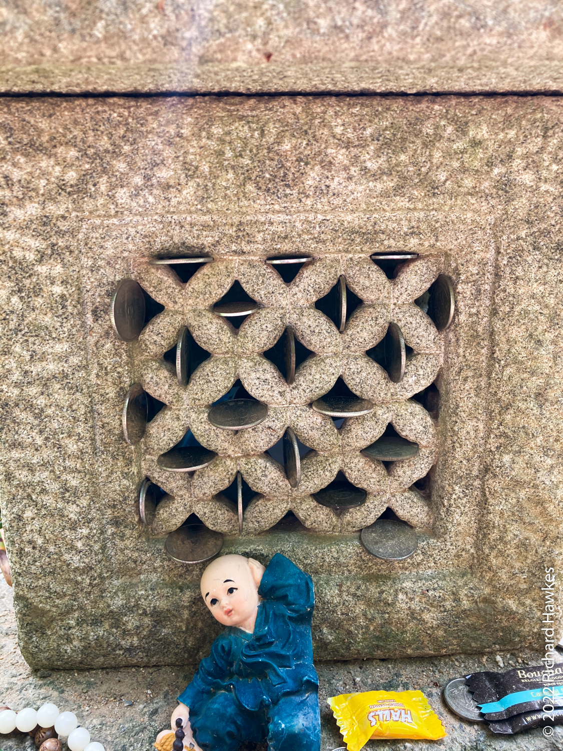 Inland a bit was less windy and we wandered up and around the area exploring various temple halls and statues. There was also a place where visitors have left small stones and a few coins amongst many miniatures of Buddha in various poses.