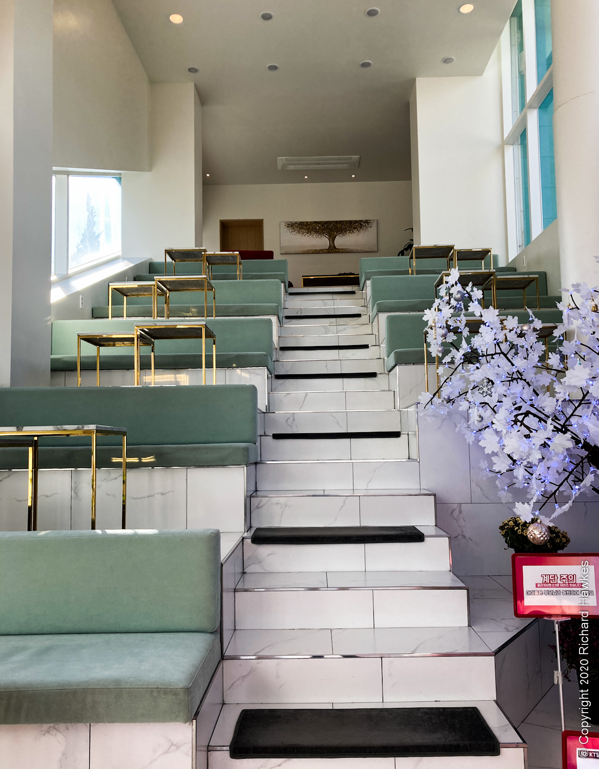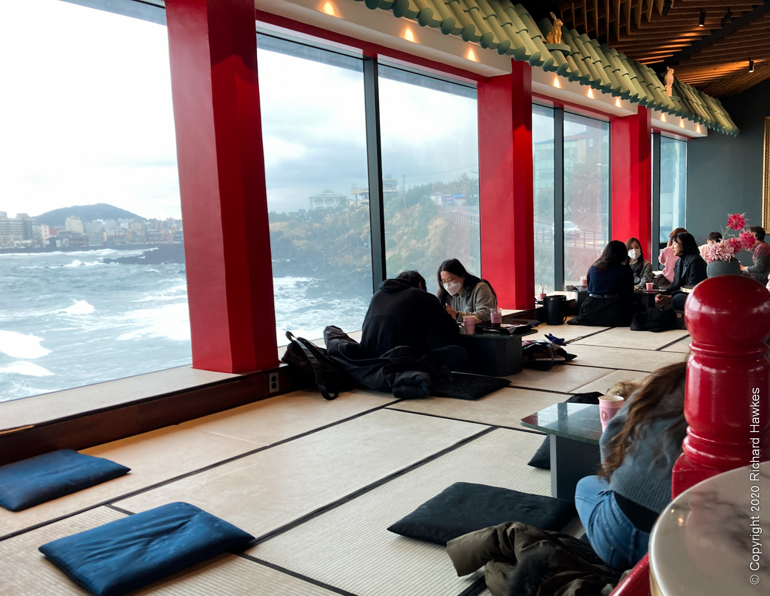 I went to Antoinette, (앙뚜아네트 용담점, the Yongdam branch) a bakery cafe I’d noticed on my way out of Jeju city. It turns out they have a few locations. It’s located right on the edge of the rocky coast and I got lucky with the last available parking spot! Its interior is a mixture of European cafe and Japanese temple, with tatami floors! In the basement was a casual wine bar area with more windows looking to the sea. The sea was rough with waves splashing the windows sometimes. I went for a pulled pork burger and coffee, both nice. While sitting here, I wished I could bring Romana; spoiler alert, we in part two of this trip.