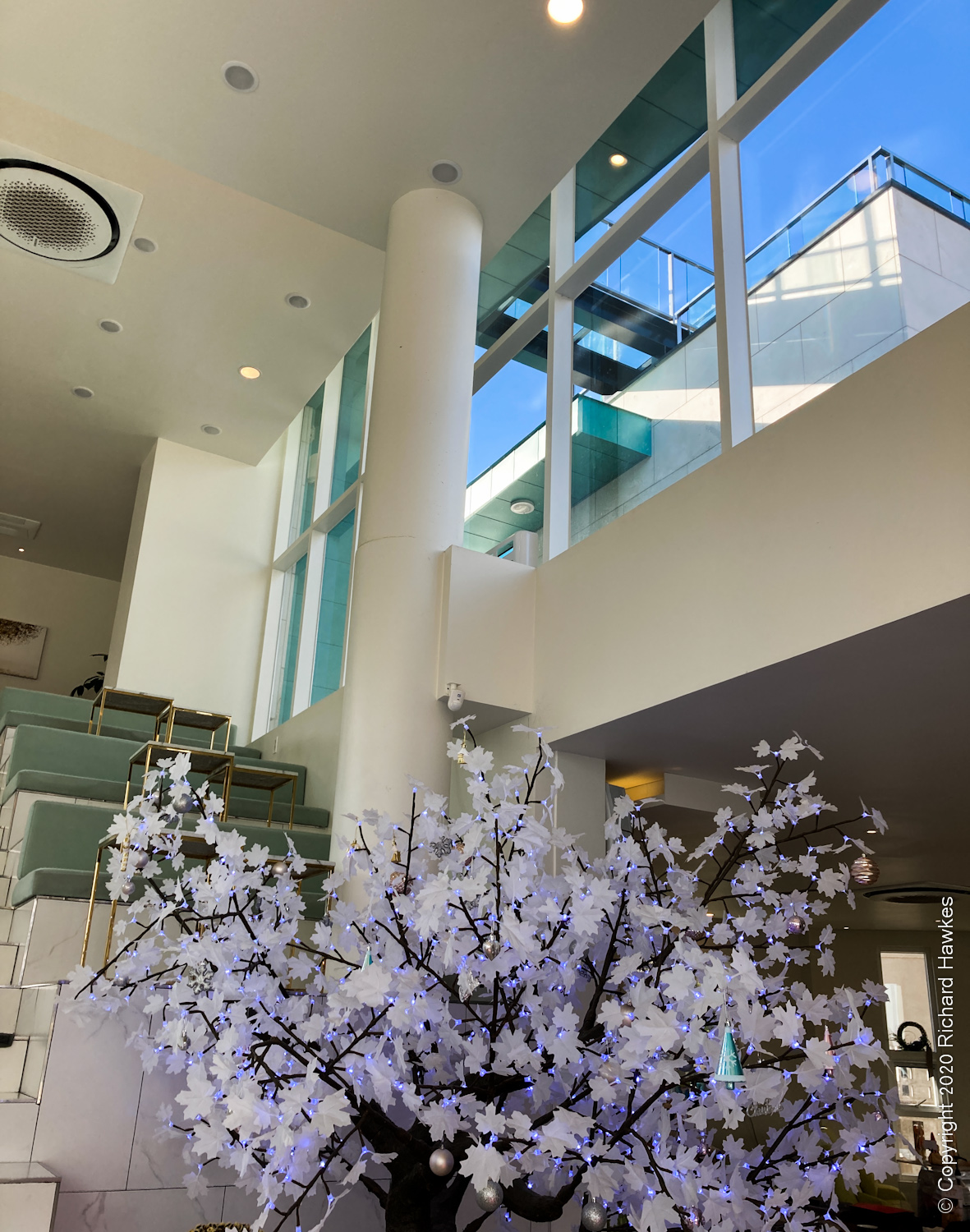For breakfast, I did a little map-app search and found a place that showed eggs Benedict in the photos! Off I went. Not all locations on the map-apps are as open as they indicate (it can be quite seasonal) but I was fortunate in this case. It was called Cafe Blossom in a modern building with interesting interior and great views from the roof spaces. After ordering, I spent some time wandering around. Most the indoor seating was on a terraced step. It was very bright inside but I would have preferred some better windows and views from inside considering the location.