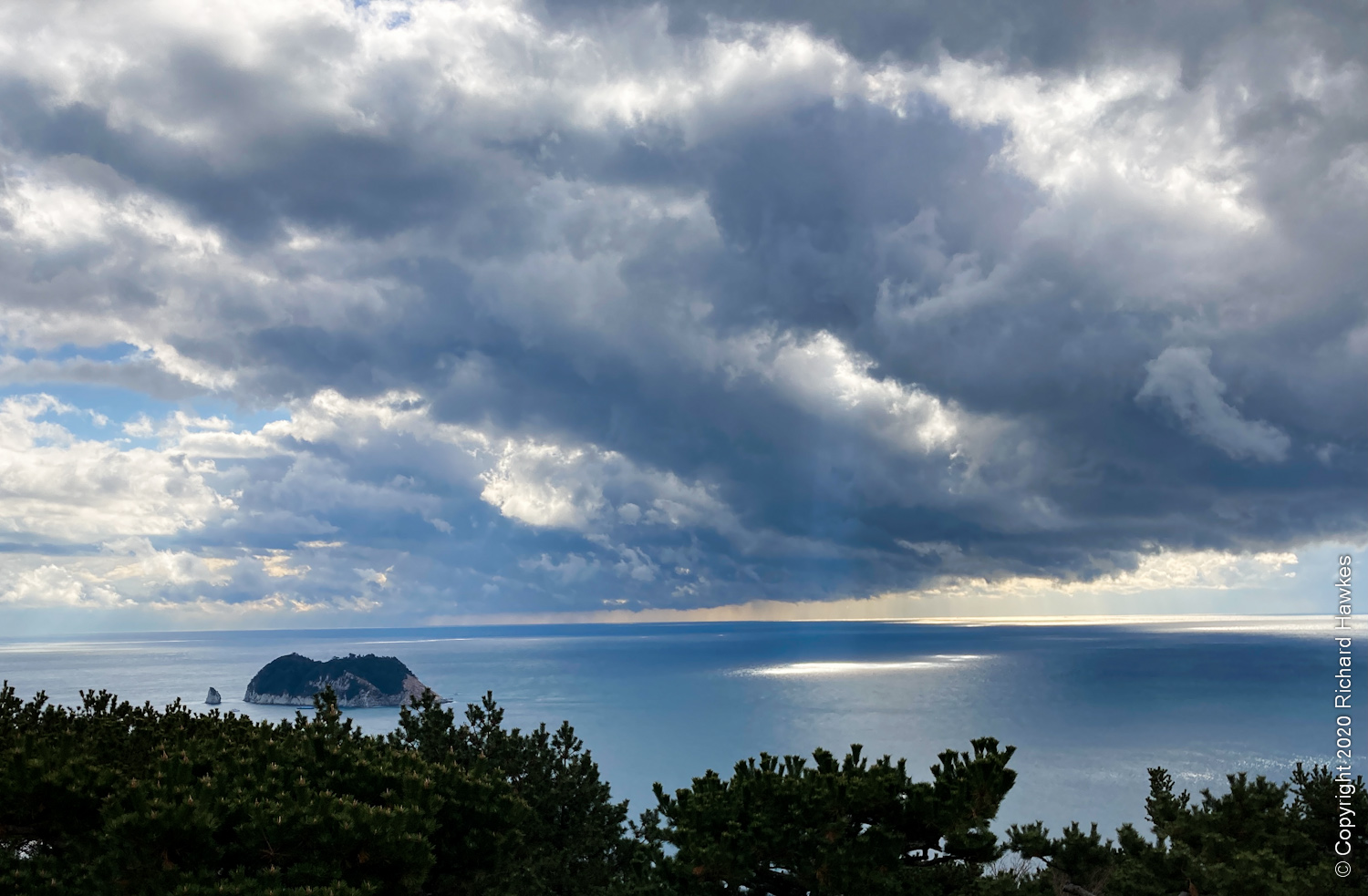 When I got back to the hostel, I went up to the roof for a last look around and noticed a huge wedge of white in the distance that seemed to be slipping eastward from Hallasan; the mountain wasn’t visible and there was perfectly clear, blue sky above it. It looked really cool and quite strange! I guessed this was some kind of fog or snow storm.