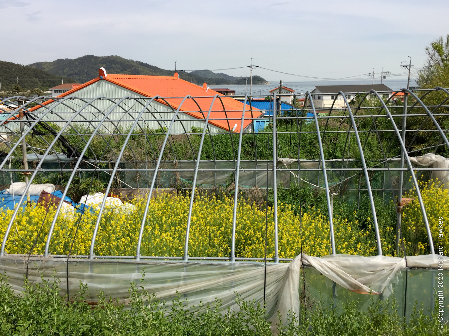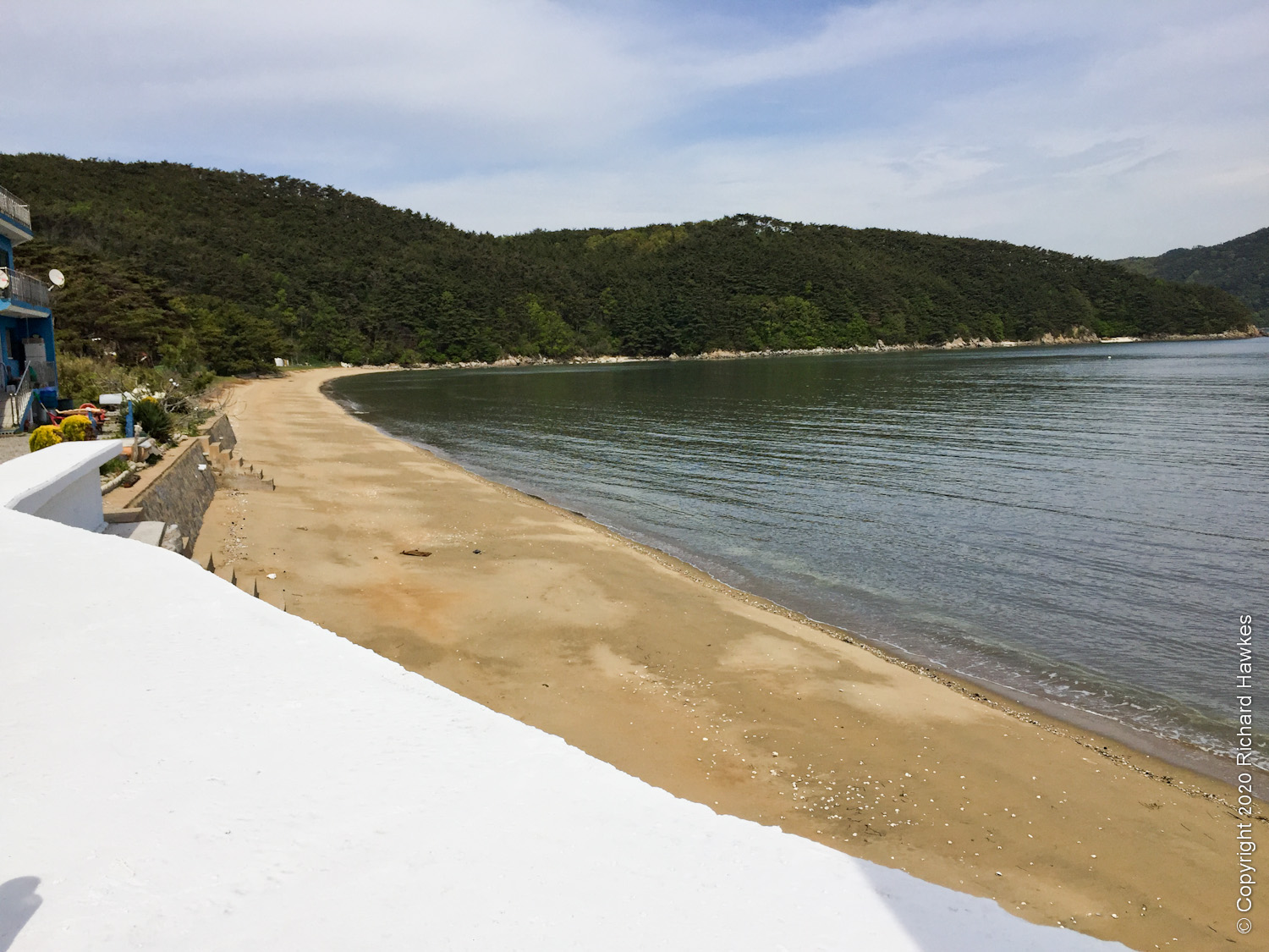 Next I strolled around the nearby roads and scouted for supplies and restaurants. There was a CU convenience store and one tofu restaurant. Everything else was shut! I asked a lady at another mart/restaurant when the restaurant part of her establishment opened. She said “summer!”. The whole village seemed in shutdown mode, and the sun beating down added to that sleepy island vibe. Not being a fan of tofu particularly, I bought a few snacks and water and headed back to the beach.