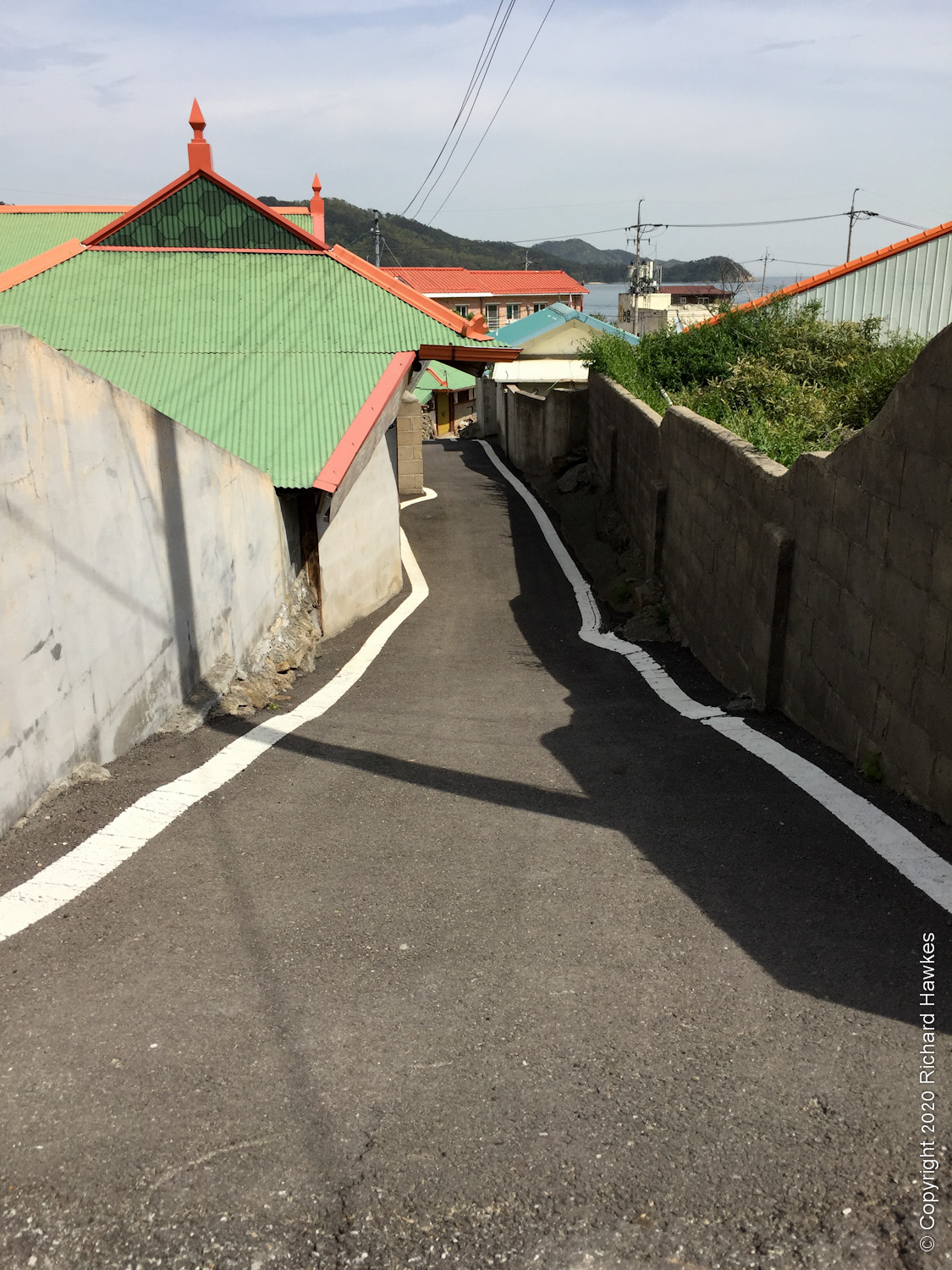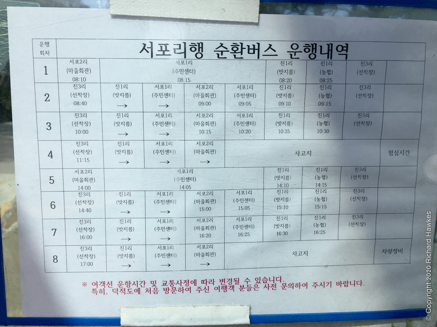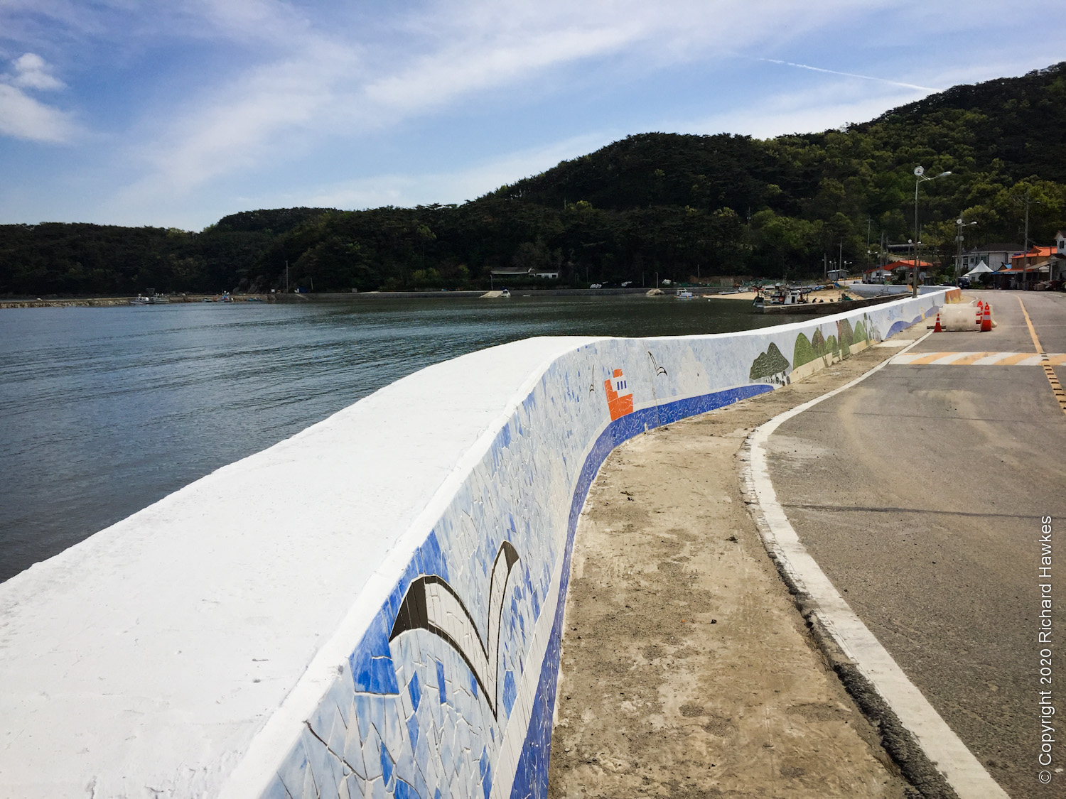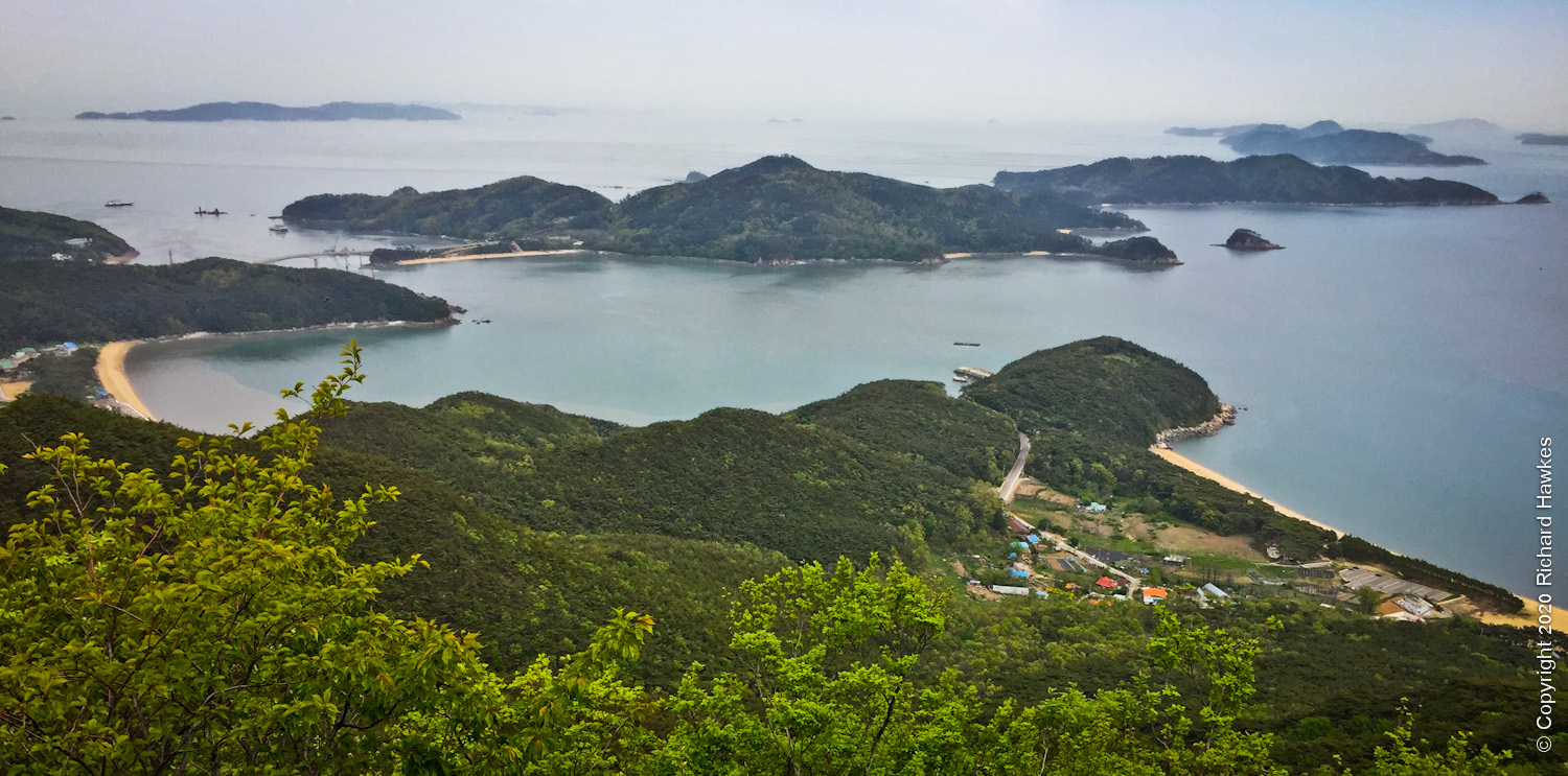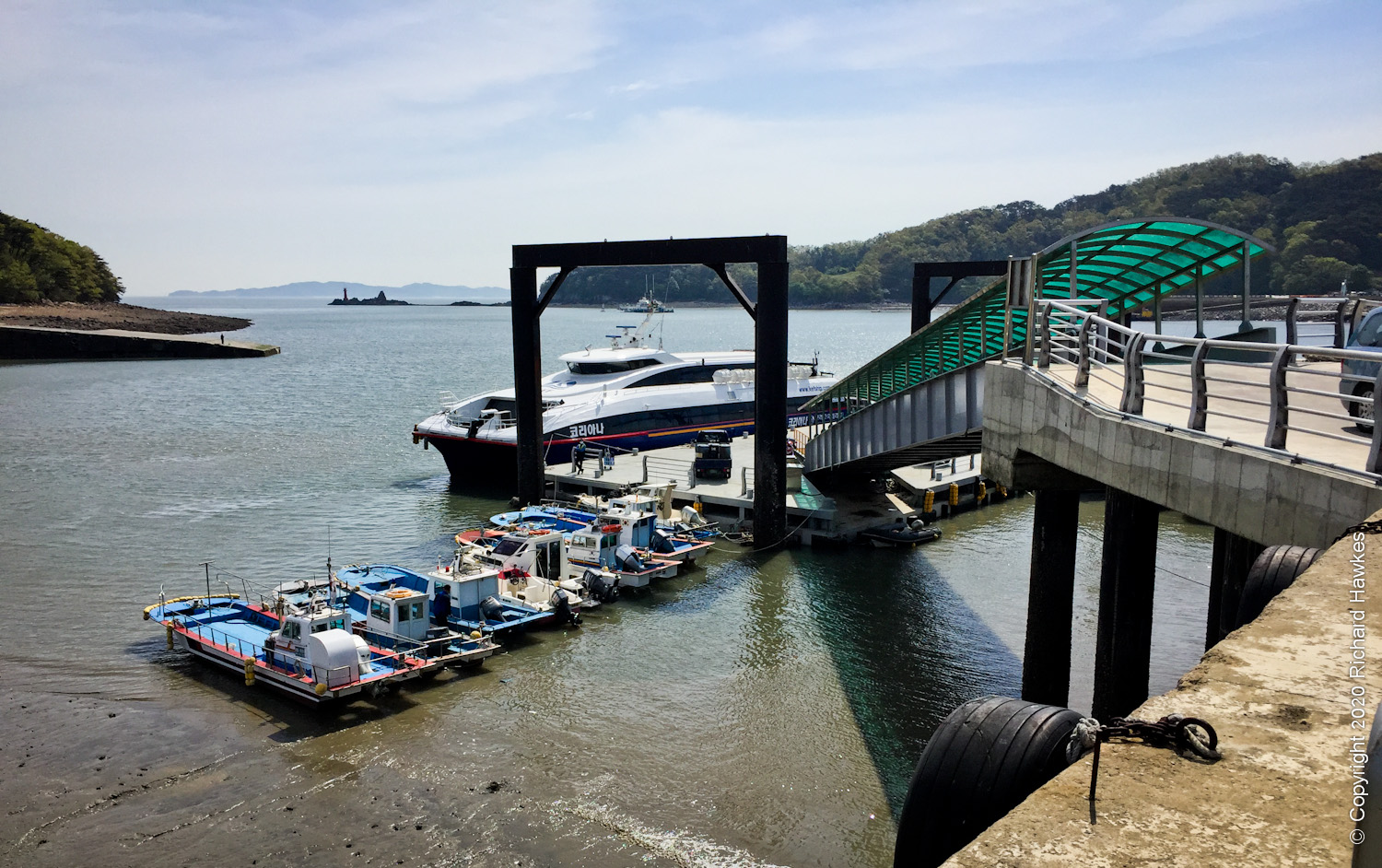 The ferry was an enclosed catamaran, with no outside stroll possible; you’d need to take the car ferry for that. This was doubly concerning considering the current coronavirus pandemic. I had a pair of seats to myself and had uneventful ride over. The ferry stops at an island 100 metres(?) south of Deokjeokdo, then moves to the Deokjeokdo port of Jinri (진리). The islands are now connected by a road bridge at that point so I’m wondering why the double stop is necessary now…