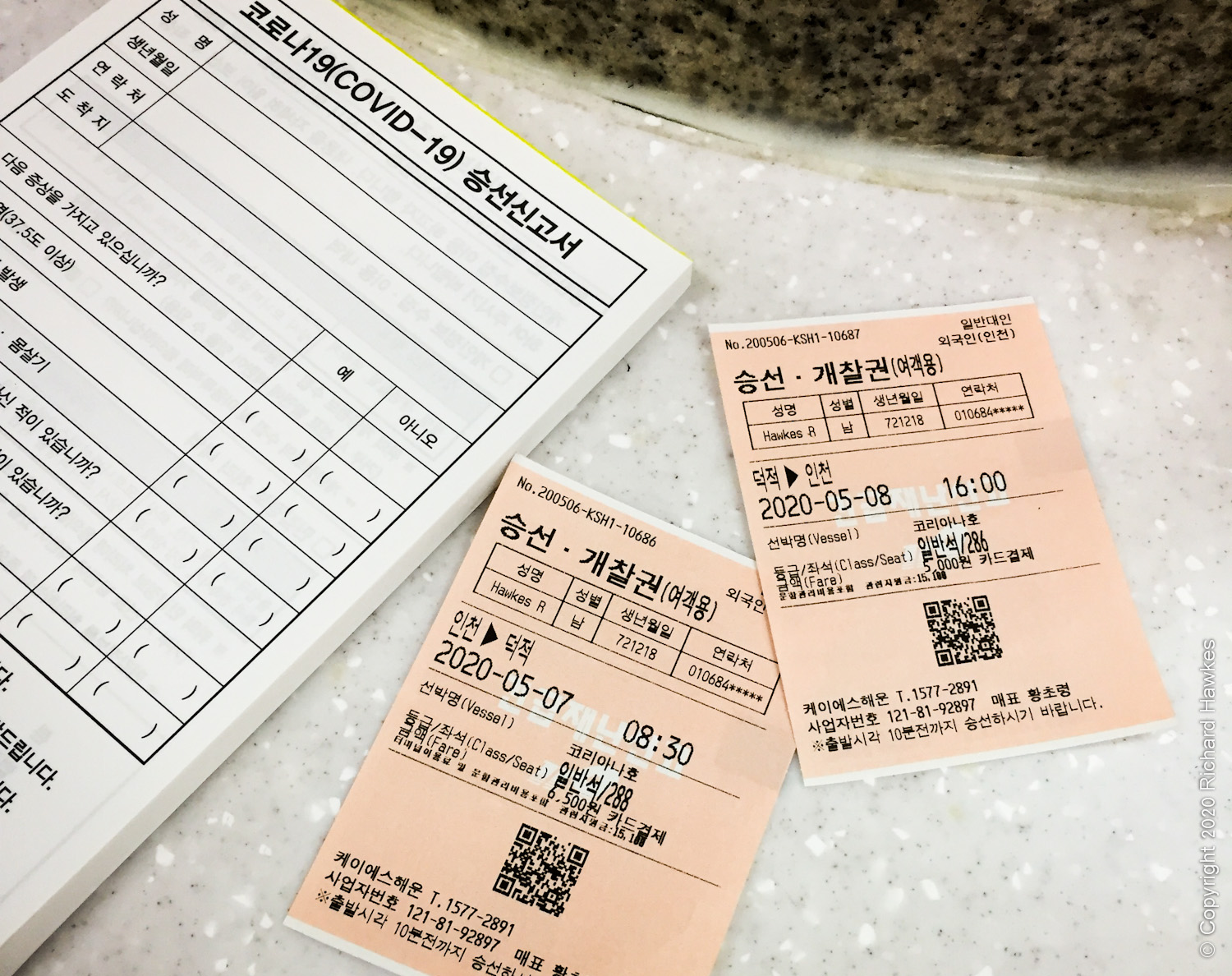 I managed to get a good deal on a round-trip ferry ticket by using this website and fumbling around with Google Translate and then, ultimately, with help from my wife. Tickets are usually about 23,500 each way, but getting them in advance was about 13,000 total-nice! Don’t ask me how to use the site; I don’t remember… Getting to the ferry port is a bit of a pain: taxi to Line 1 (Namyeong in my case), train to Dong-Incheon, and a packed bus to Incheon Yeonan ferry terminal (인천항연안여객터미널).