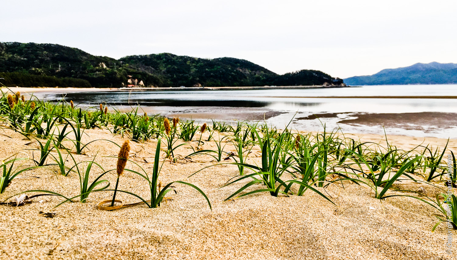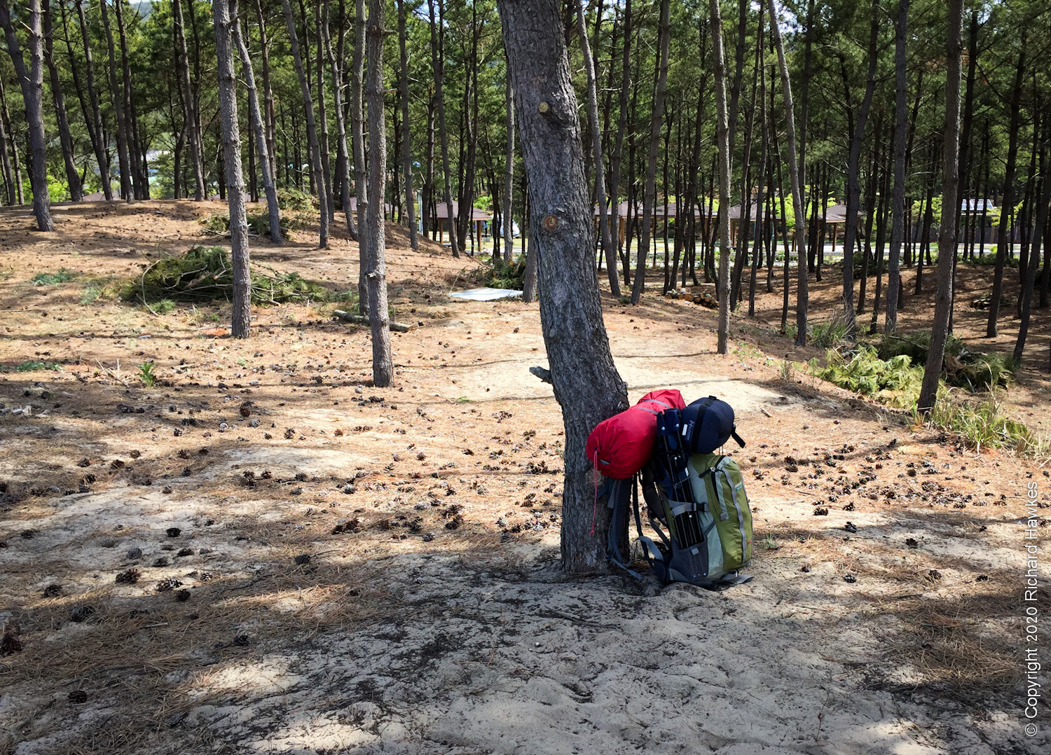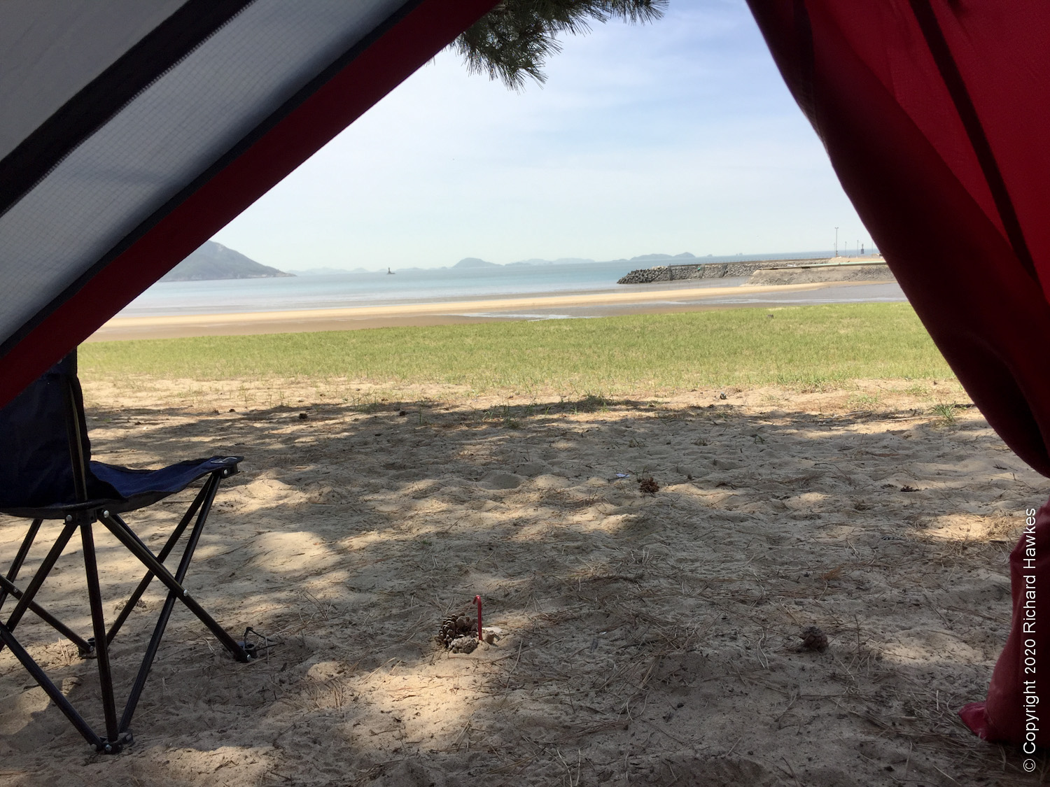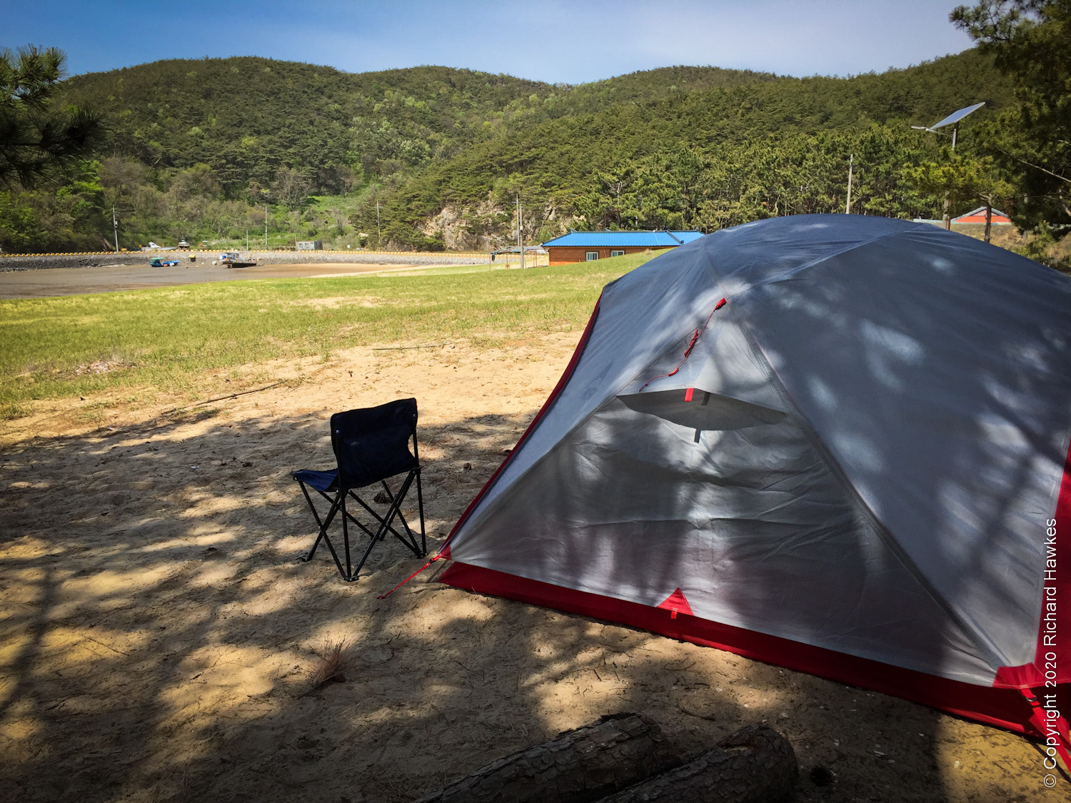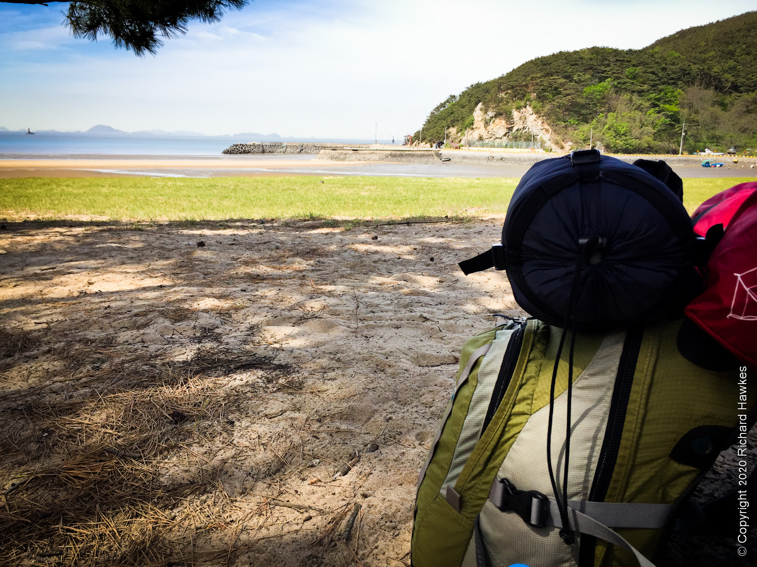 There’s a 1,000 won bus at the the terminal which pretty much only goes one route. It takes about 15 minutes to Seopo-ri (서포리), a small, beach and pine forest focused village. At Seopo-ri, I went straight to the beach and checked signs for anything that seemed to ban camping. Nothing. Unfortunately, the shower block was locked till ‘proper summer’, but the toilets were at least open, clean and functional. The beach was deserted and the weather was perfect. Last time I was here, it was a sandy beach. The only difference I noticed was that the beach had grass on it. I wonder if this stays throughout the summer (peak travel) season or if the beach-goers change it back to sand with their stomping around. I found a nice spot on the north end of the beach. There were two other tents set up there so I set up in the general vicinity under a shady group of trees with a view straight to the sea. Perfect!