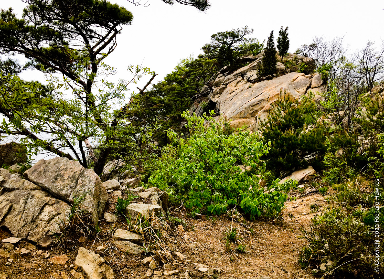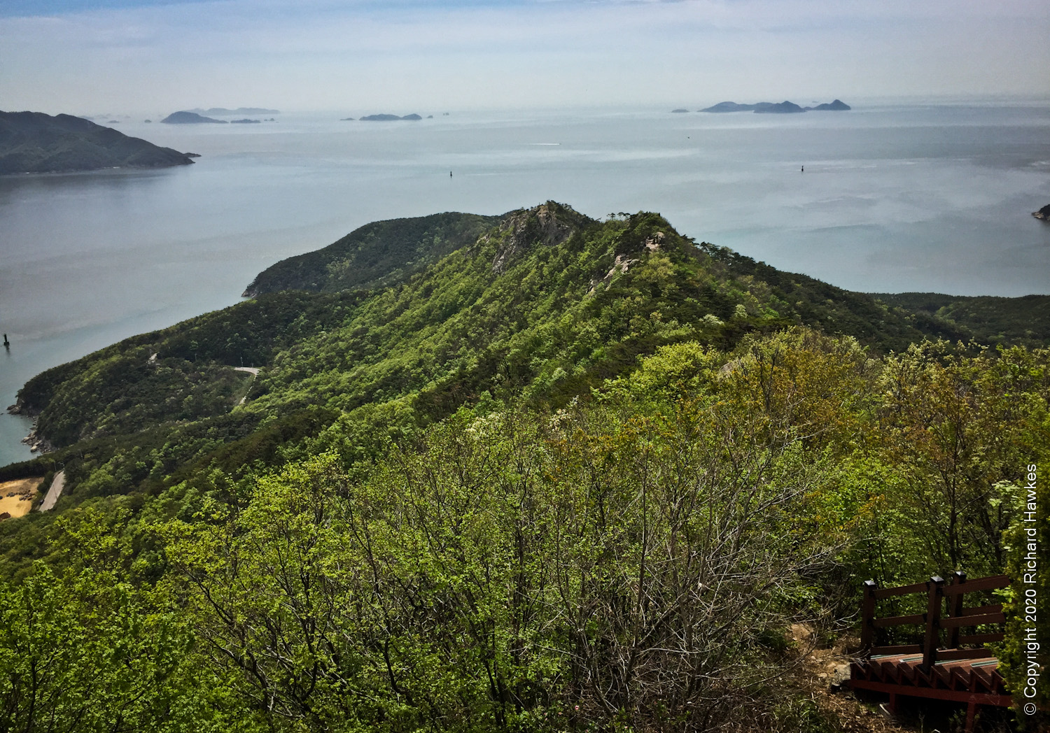 The trail goes up quite steeply and steadily, and I got to the ridge in good time. There were great views back to the sea and the beach, plus some distant islands. Deokjeokdo’s mountain has a three-way ridge and I was hiking from the west to the peak. Once at the ridge, I could see quite a way in all directions. The peak was left and up some more, with a scary moment when I tried to kick away a root that was half attached to the ground and I thought I’d trip and slide down the lovely mountain…