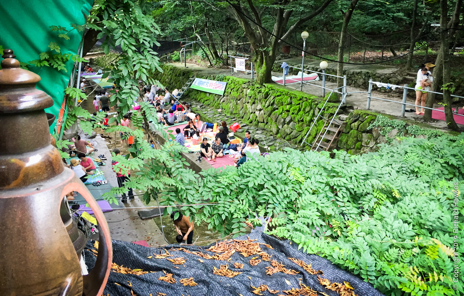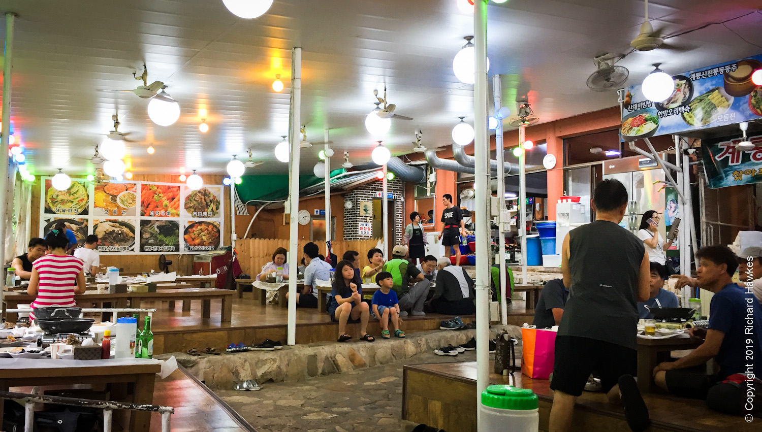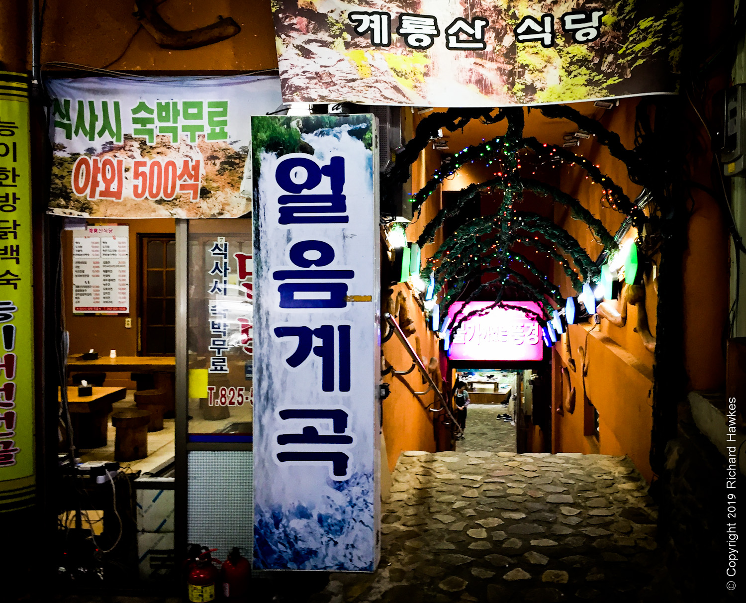 Walking back from Donghaksa, we spent a lot of time trying to pick a place to eat. I wanted lively, usually a sign of good food. However, with literally dozens of entrances to choose from, it wasn’t easy; the restaurant interiors weren’t visible from the road and in most case, you had to go through a little tunnel and steps or ramps down to the restaurant, where a whole world of people, chatter and eating would appear. Amazing really.