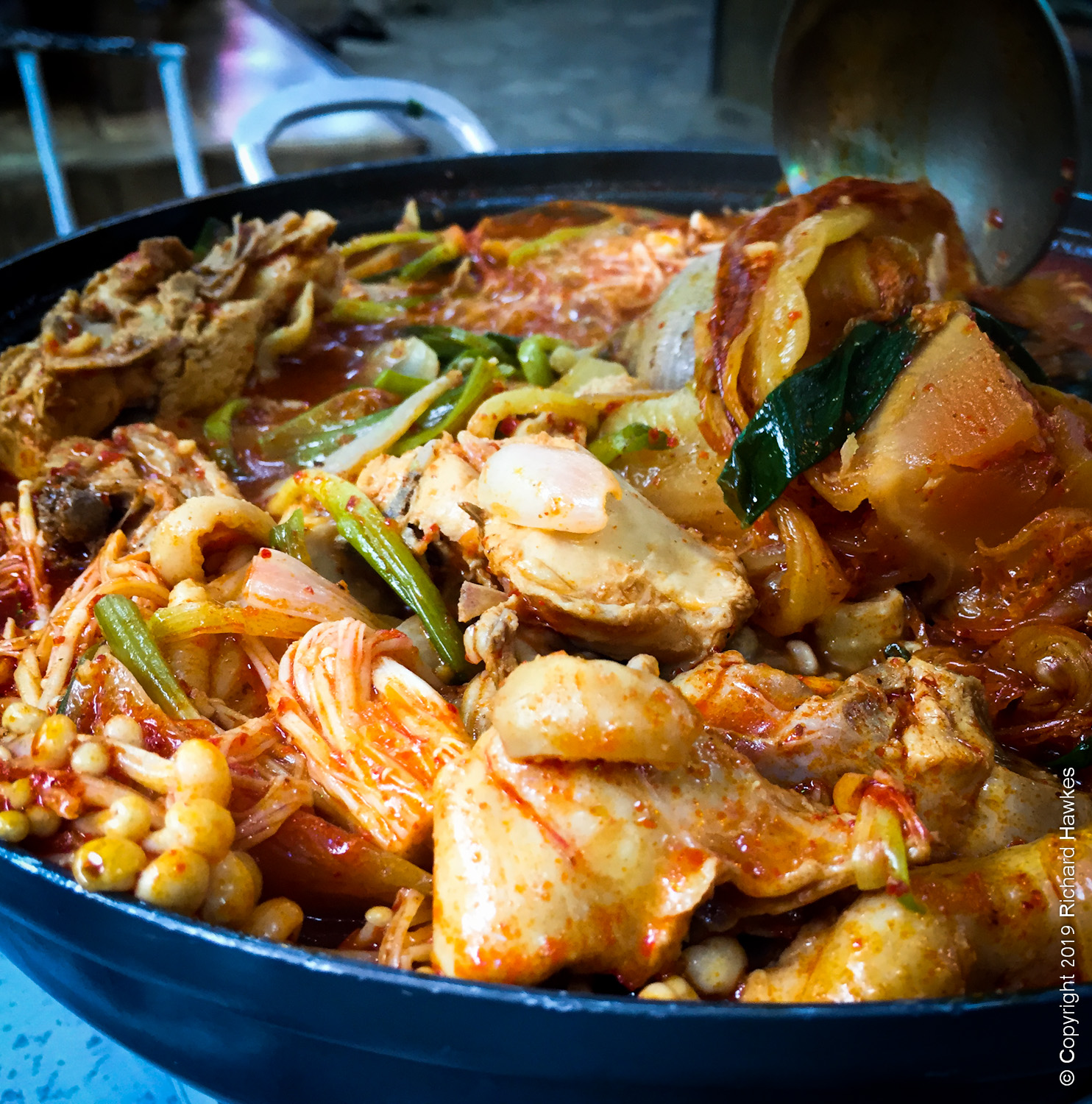 We went for dakdoritang (닭도리탕), a large dish of spicy chicken soup, and a few bottles of makgeolli, traditional, fresh Korean rice wine.