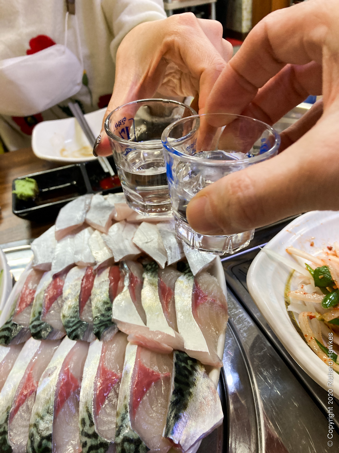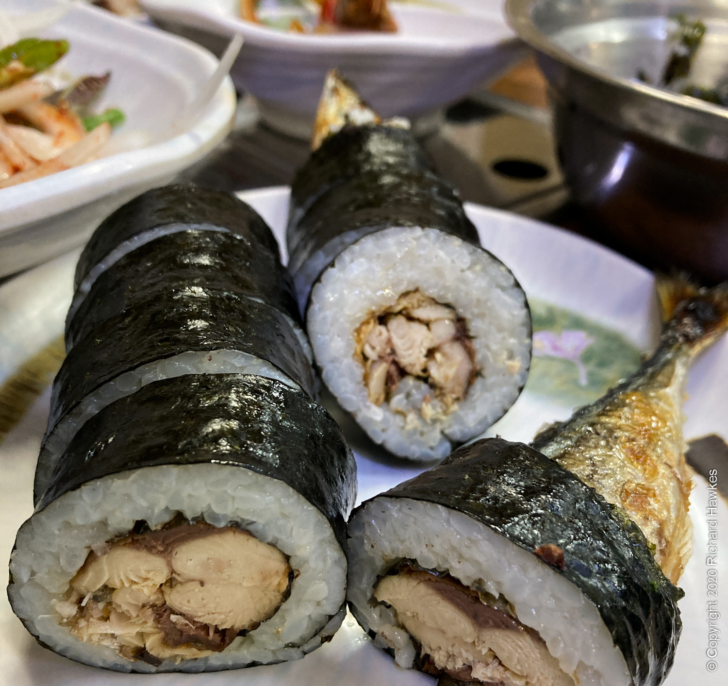 Next, we needed a place for our hungry asses, so home for a rest then a stroll back to the market for some seafood. This time we went to one of the showier places called Ujeonghoejjib (우정회센타). I think the owners had bought up few properties in the market. The had a couple of staff aoutside making a show of killing a fish on the pavement in front of a small crowd. We paid about 60,000 for a plate of mixed raw fish, including mackerel, and some interesting side dishes. This was my first take of hard-shelled shrimps (딱새우), and a whole fish inside a kimbab! We even ‘went crazy’ and bought a bottle of Jeju Hallasan soju, which I enjoyed!