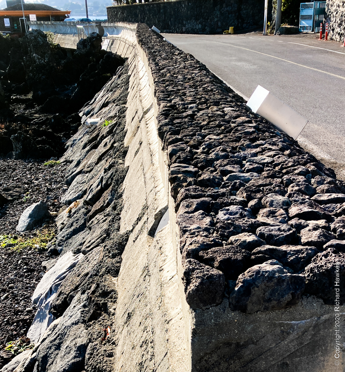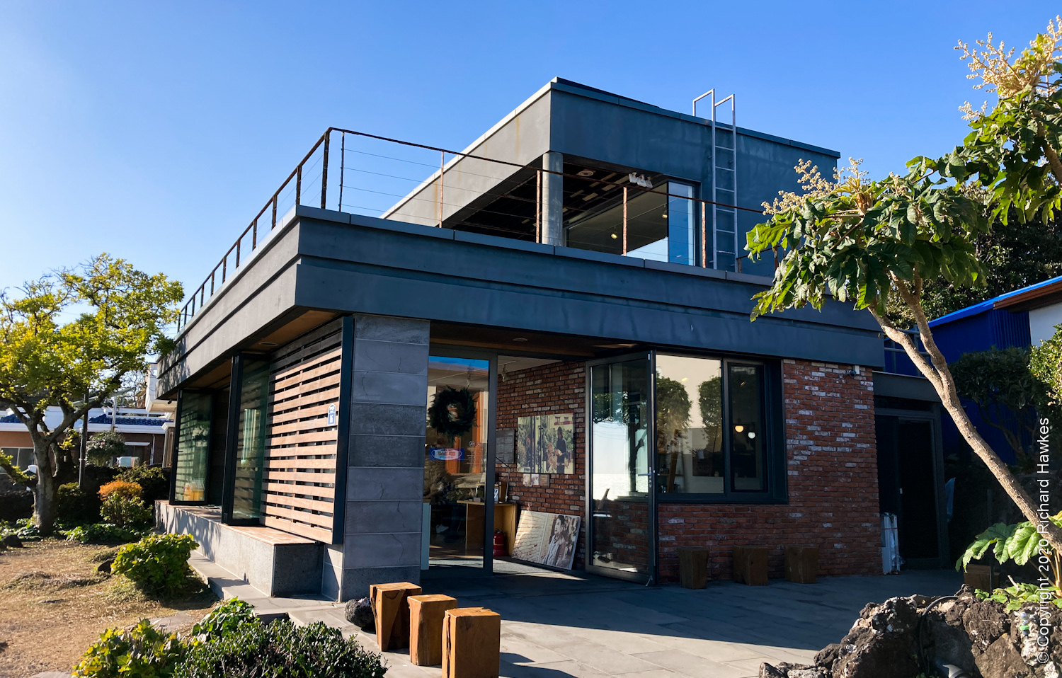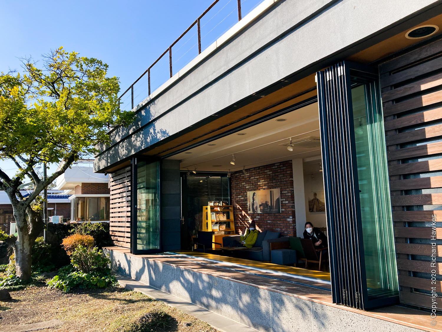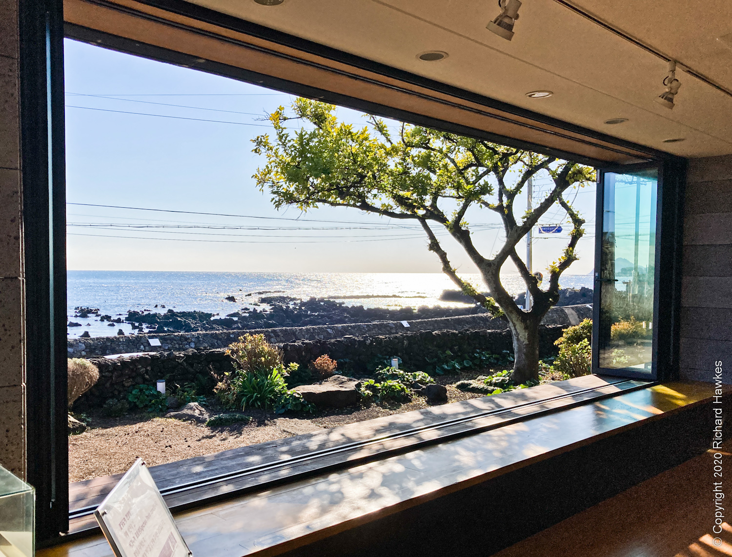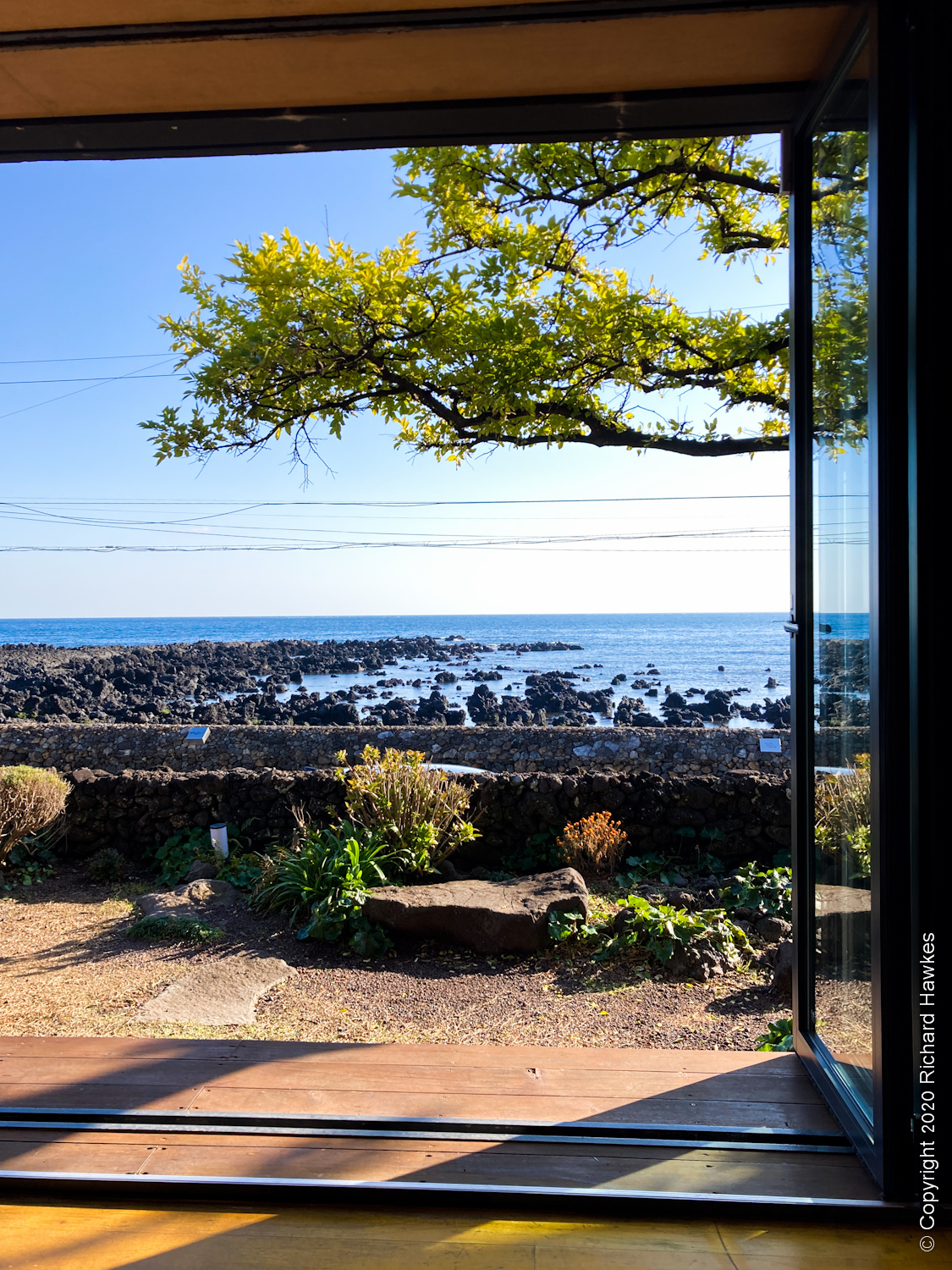 After our busy morning and lunch, we drove to the south coast to Cafe Seoyeonui House (카페서연의집). This is in a remodelled (rebuilt?) building right on the rocky coast on a quiet road. The place was featured in a Korean film (Architecture 101) a few years back; I watched a bit of it, not understanding anything(!) but the house and location really appealed to me.