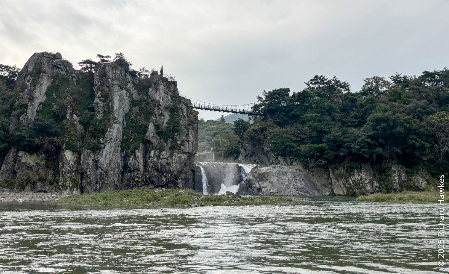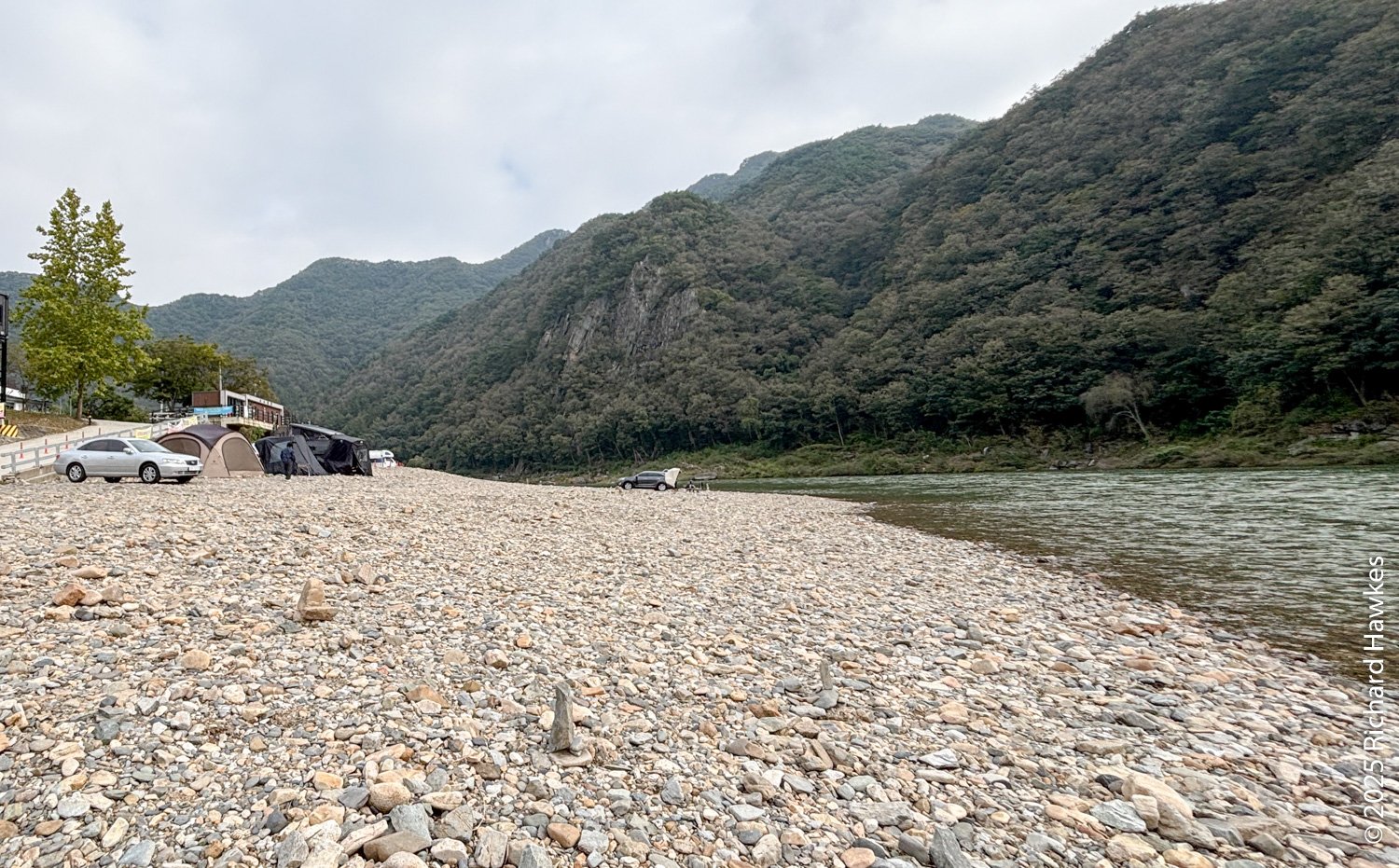 Soon after I got to a section of riverside with a pebble beach and people car-camping. Across the water was a waterfall between a small gorge with a bridge running over the top. Cool. I walked to the water’s edge to take photos.