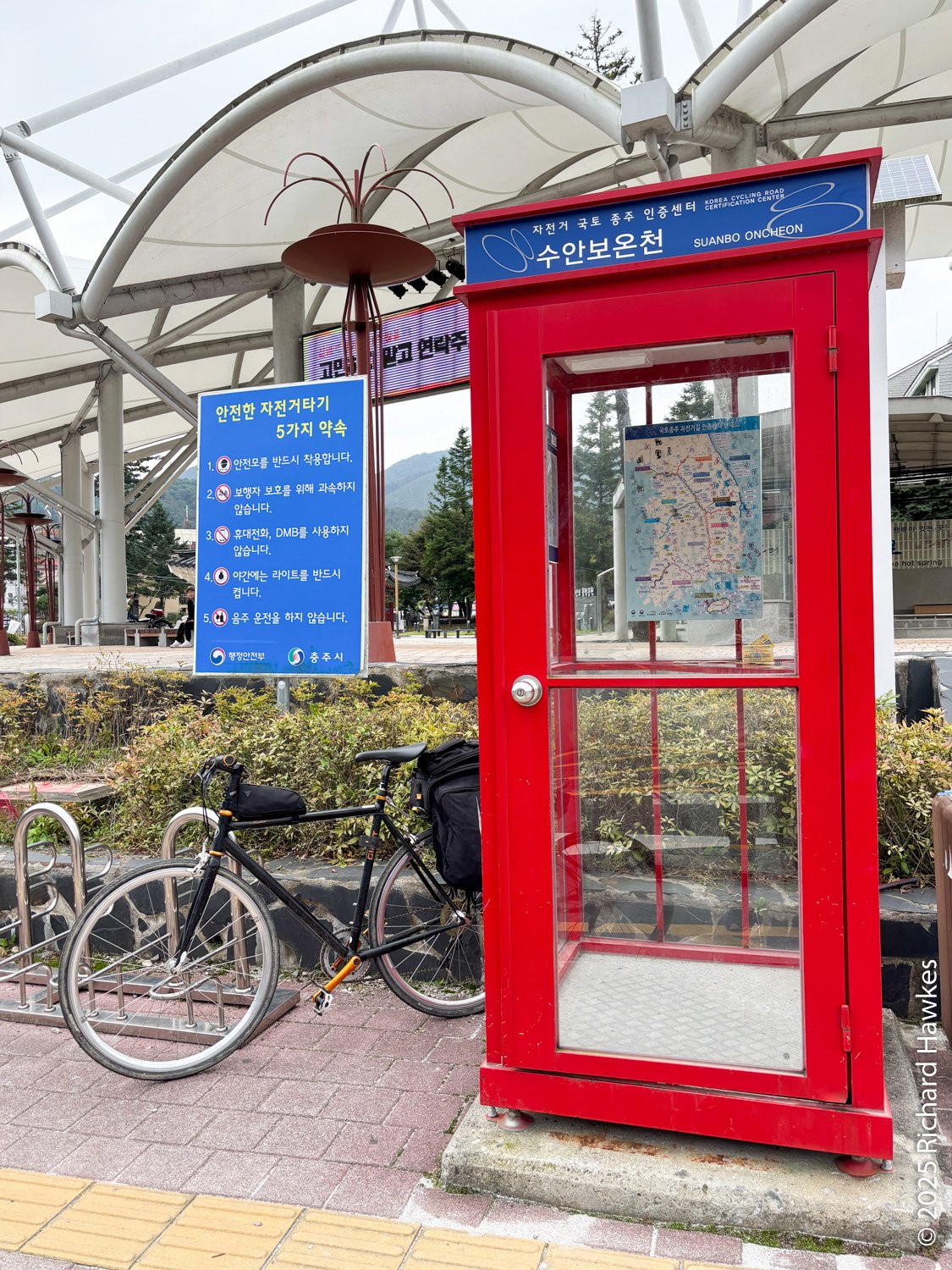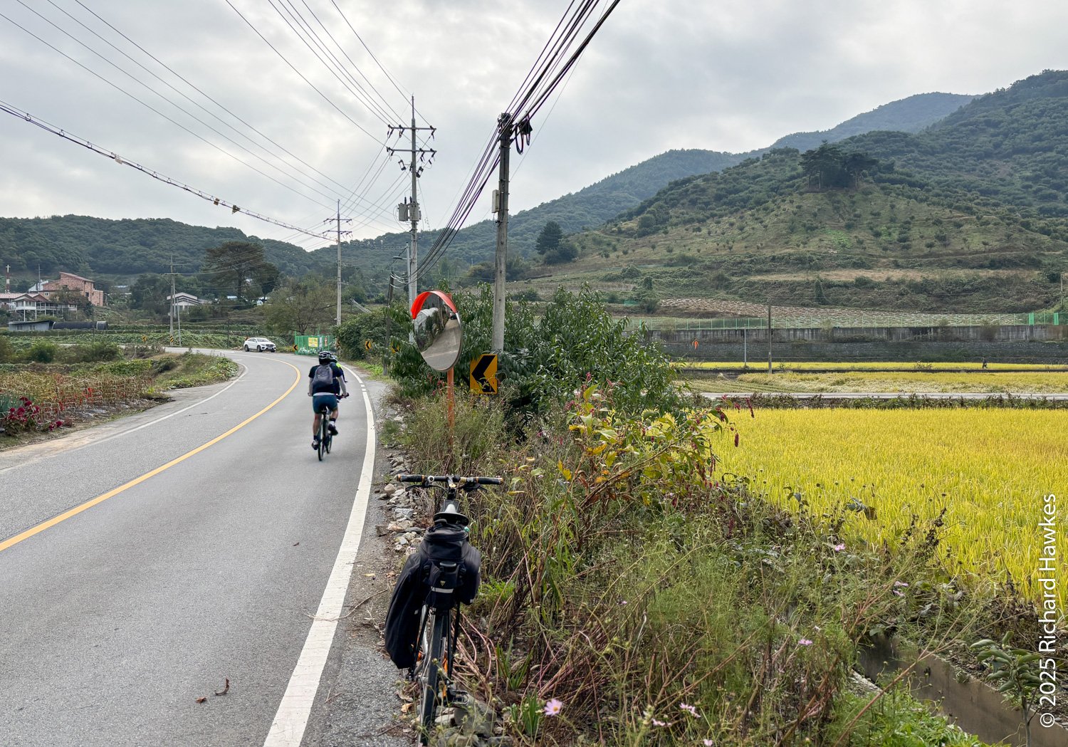 After the rice paddies I got to the first stamp booth of the trip at Suanbo. This was about 10:30. I took a longer break here and had a sandwich. There were a couple of cycling groups resting and chatting. A few minutes later, I had a quick chat with three people travelling from Germany; a mum, dad and their daughter. Their bikes were fully loaded for the long ride!