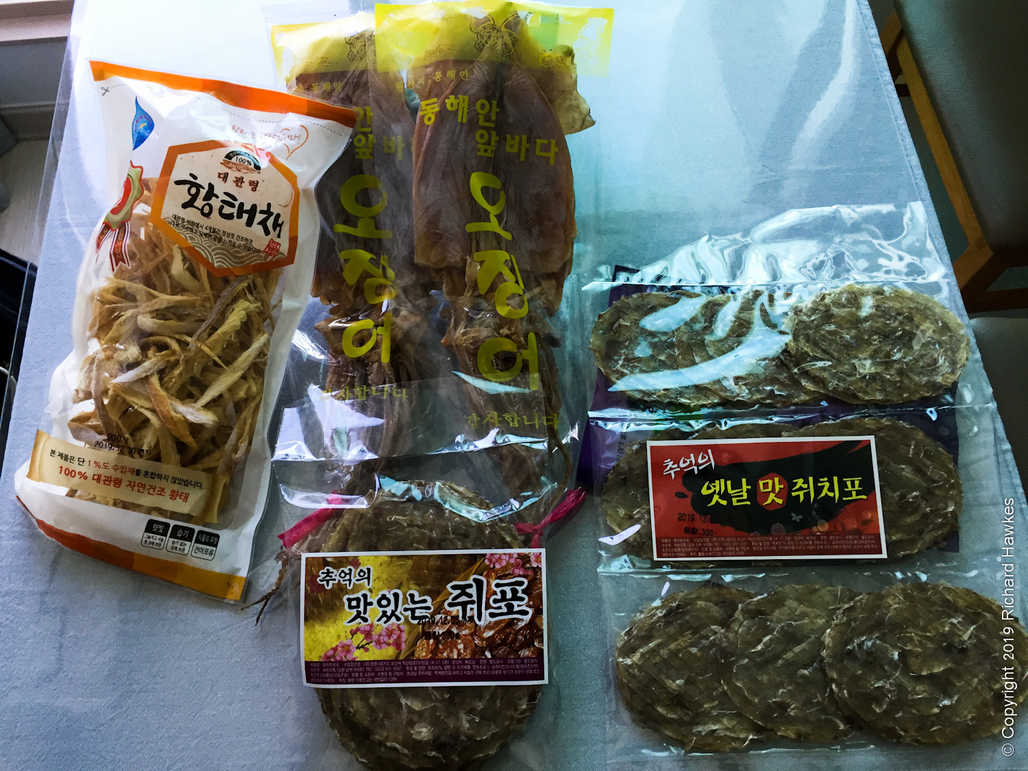 Back in Jumun, I stopped to get some dried fish I’d seen yesterday. These would be gifts for my family in Seoul. I got back to the Airbnb at about 4:30, rested and cleaned up before walking around some of the back streets nearby as an alternative route to the fish market. This time I had a couple of grilled fishes, extremely filling. And I can’t remember their names, so lets call them Jeff and Susan. A fun, but tiring day.