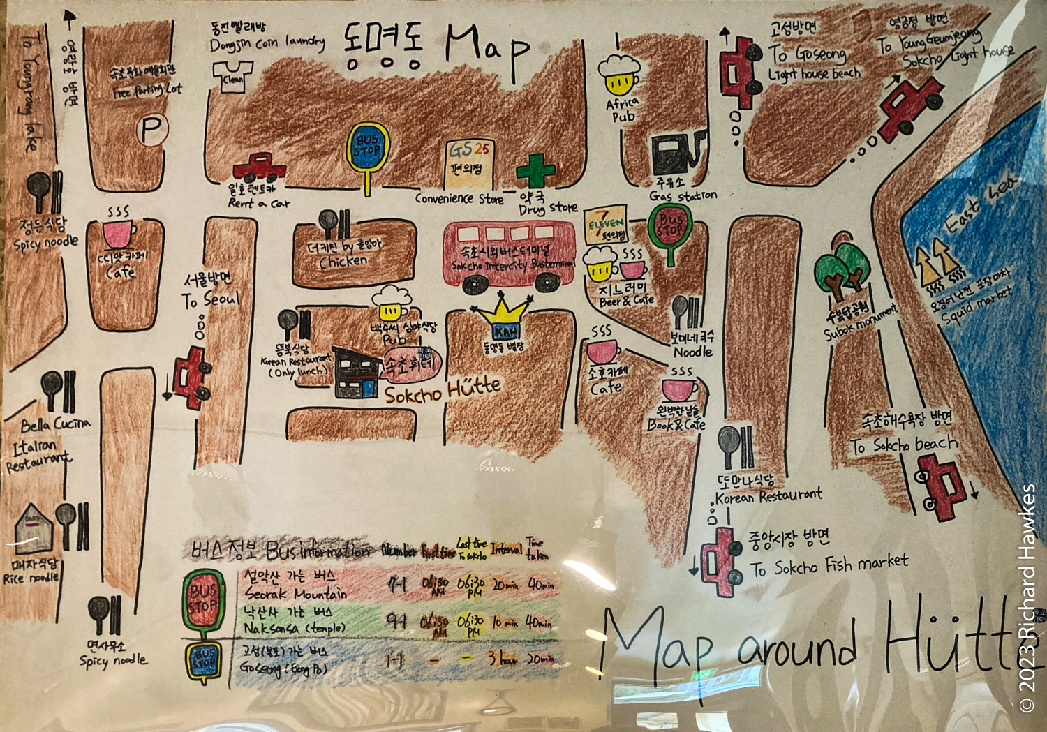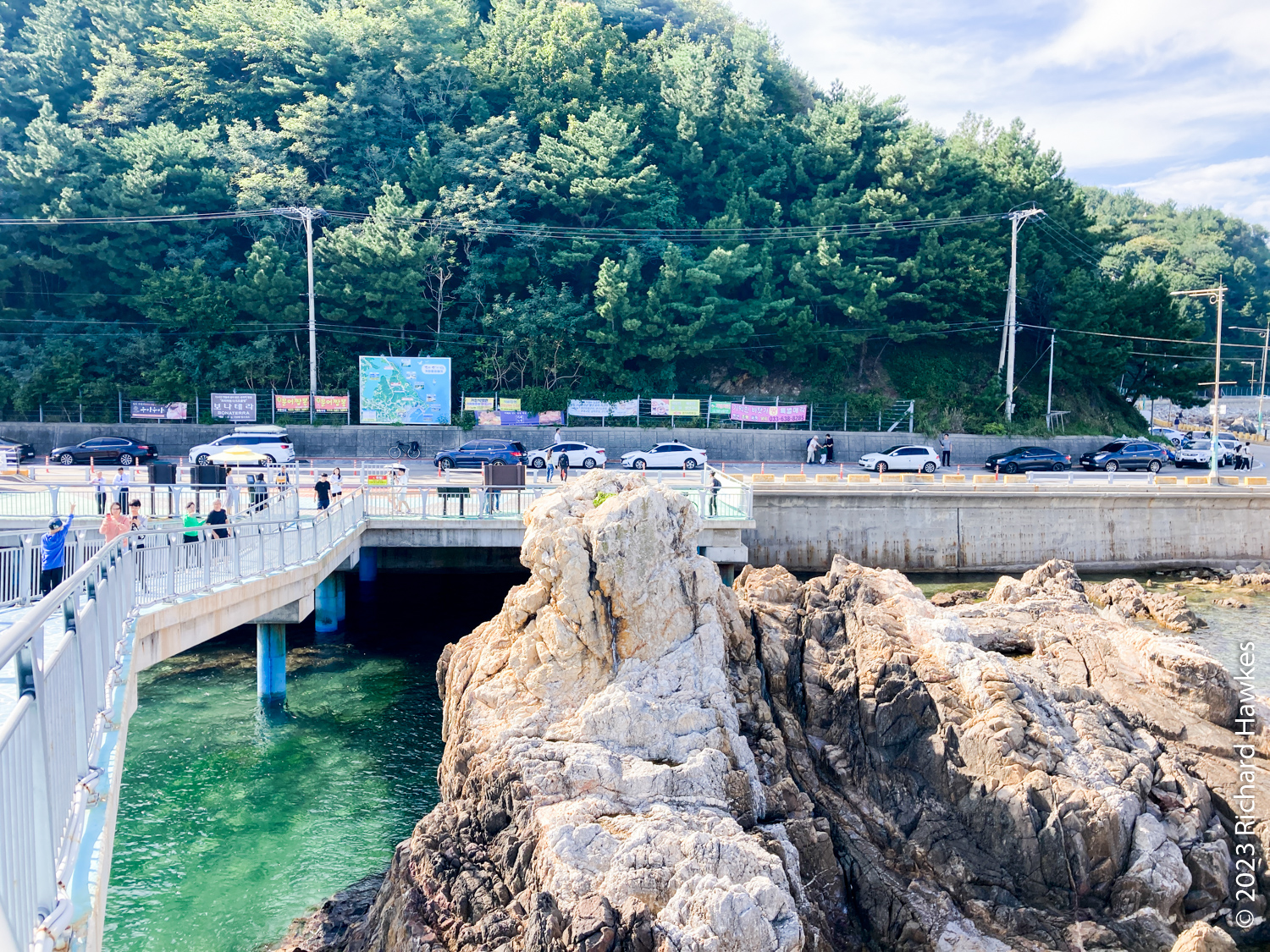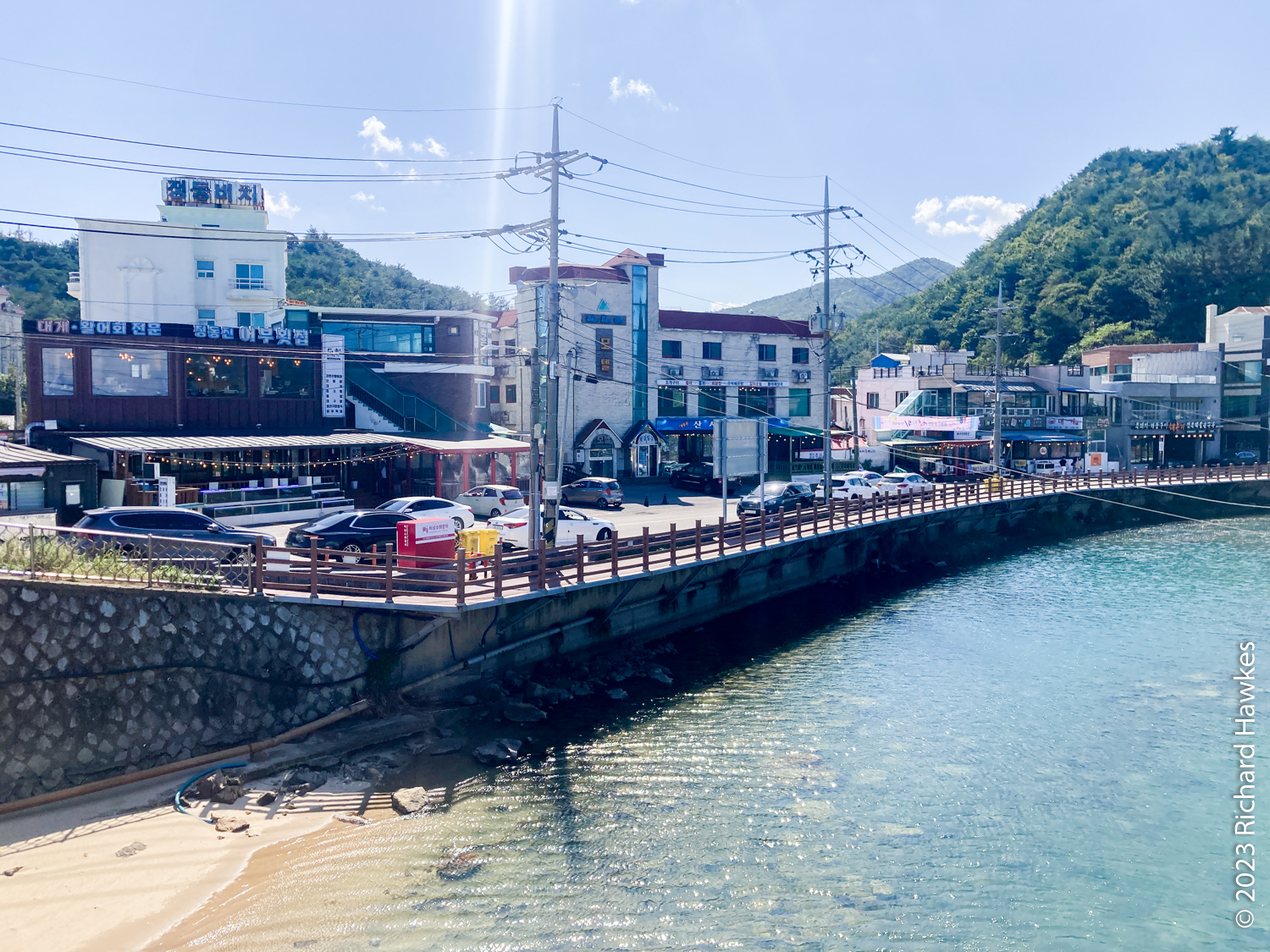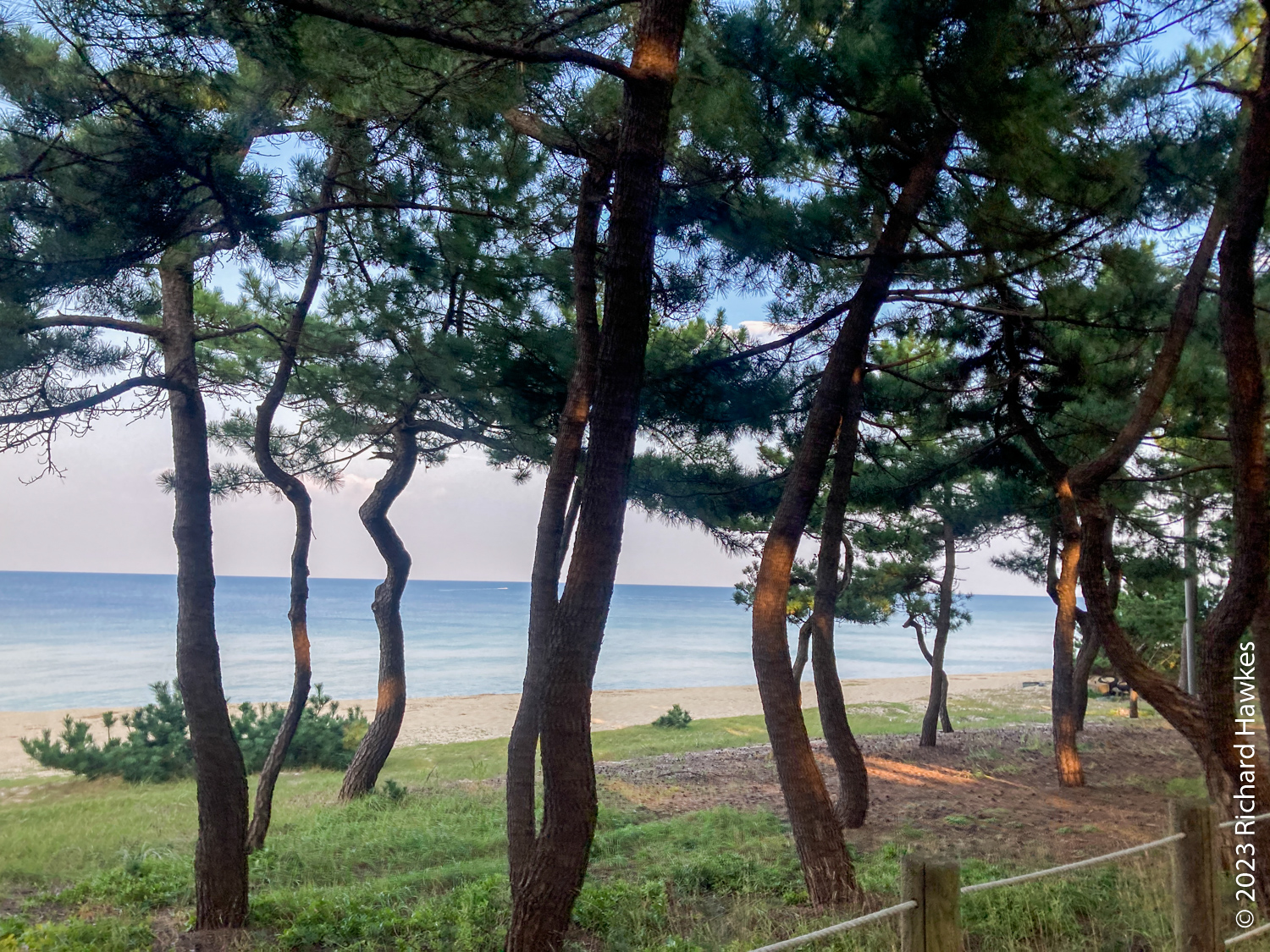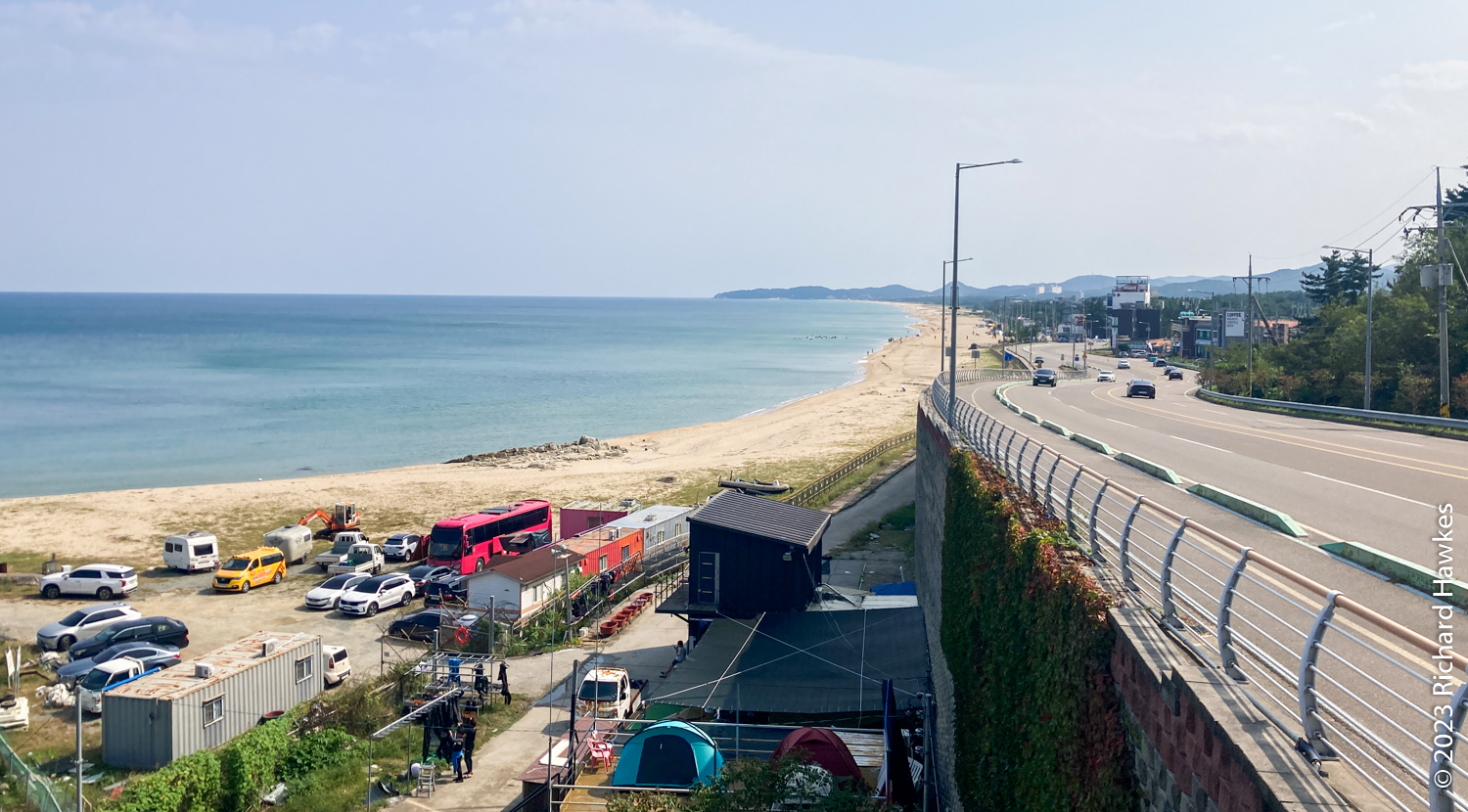 I got a quick breakfast in the kitchen area at about 8:30; the host was making breakfast for all the other guests. The German couple did a double-take between themselves when they got their egg and cheese toast with jam! There were quite a few European guests actually. We left then cycled about 30 minutes to a cafe for a coffee. We were properly on the road by about 10:30. The route was mainly beach front, with a few inland sections and village detours. One such place was a huge ugly intersection area where we got some pretty rank tasting beef dish… We had some drink and ice cream stops at beaches, and some lovely beach pine forests. All in all, a (mostly) pleasant ride. I actually did part of this route when I cycled from Jumun to Gangneung in 2018.