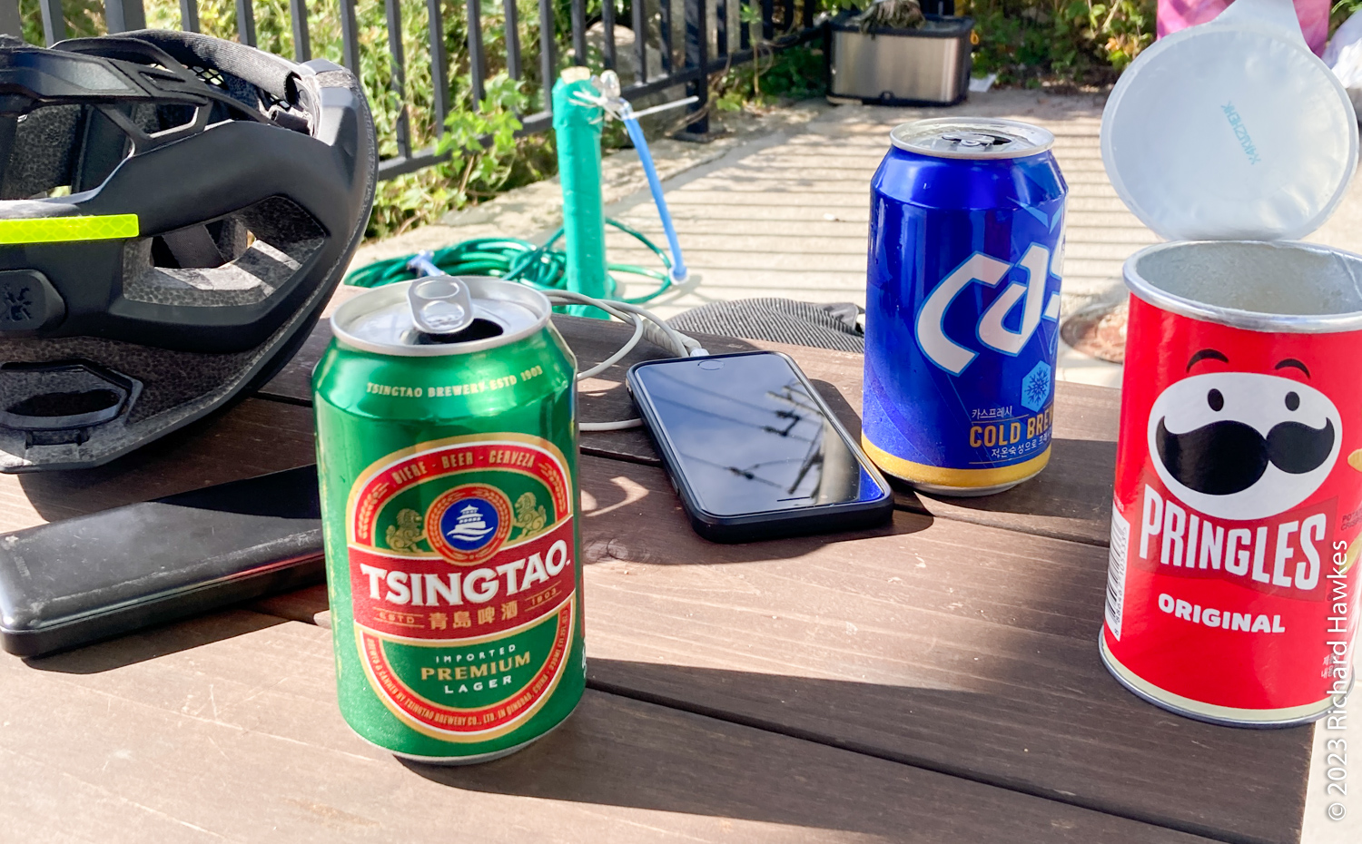 Now we were fully on the road and really enjoying the scenery. The weather was sunny and cool and the sea looked inviting. There a few great bits of rocky coastline that we stopped at. We cycled inland a bit, around a large lake then continued south along the coast. There were a few smallish towns we had to navigate through; the along the trail, you’re looking for a blue line on the road, plus signs saying 동해안 자전거길 (Donghae-an Cycle Path) and these are not always easy to see. We had a beer break near some apartments after one of these harder to navigate areas.