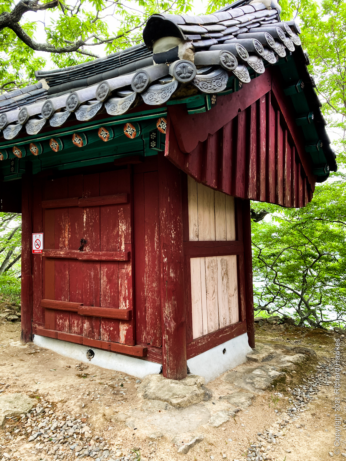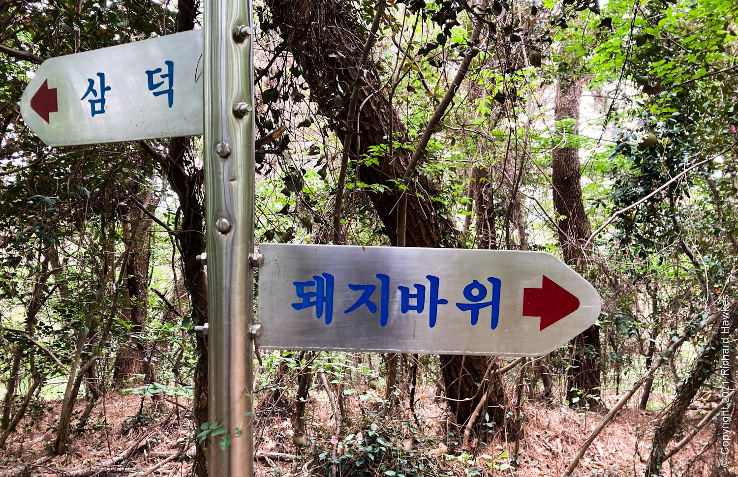 The problem was I couldn’t find a trail to keep going on; I was heading for Pig Rock (돼지바위) and had to get down from the shrine area and double back a bit. As I left I noticed another rope going straight up a sheer part of the rock I’d just been on. Was that the way ahead? Nope, not for me! I followed a trail l into the forest and found more rock, and the trail went up to rockier and rockier part. There were no signs here so it was a lot of guess work and there were a few sketchy moments when I thought I’d have to go back (worrying moments when I’m hiking alone!) but didn’t take too many risks. The most dangerous parts for me was heading down through the forest again; the trail was covered in dead pine needles and old, dry leaves and was quite slippery!