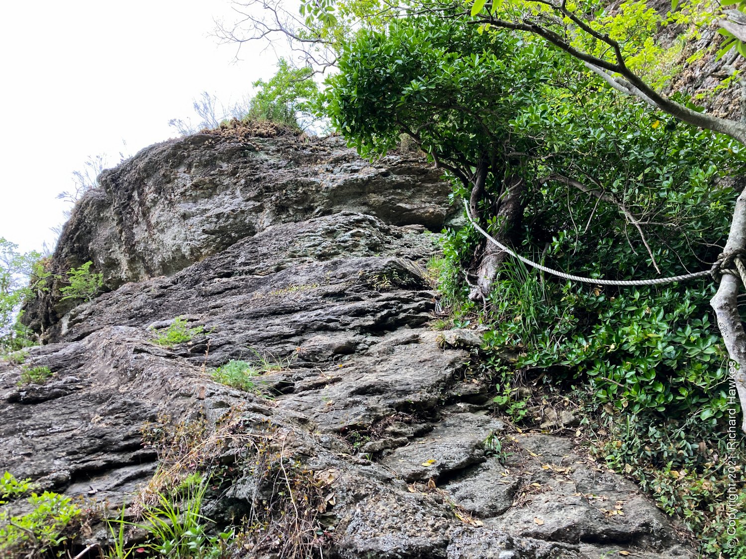The next trail started west out of the village and I thought it’d be short and easy; sort, yes, easy, no! The trail had old signs and seemed little used, and when I finally got to some rock, there were immediately ropes. I went up and found some kind of village shrine for a nearby harbour. The access point was a little tricky to get to, but okay so far.