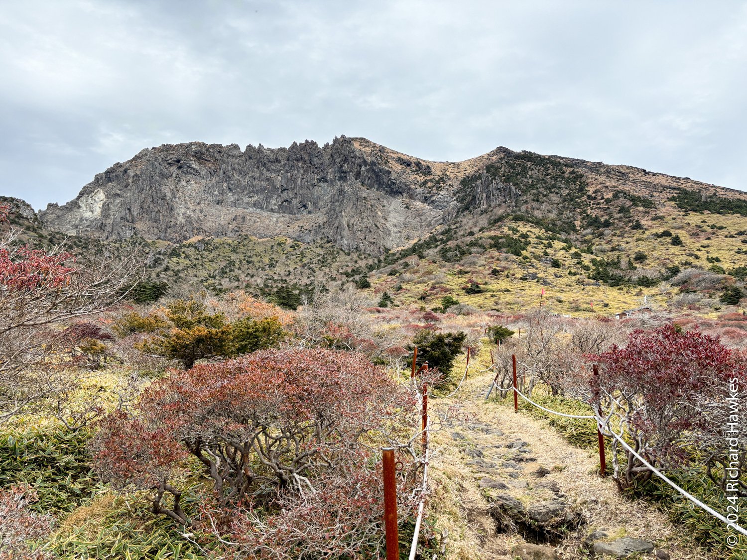 I reached the south wall of the crater at 11:10. There’s a wooden observation deck and ranger hut there, with signage about continuing on to another trail; this is where you’d be sent back if you’d arrived later than 14:00, too late to continue on. From here you can hike past the south west of the crater to Witsae Oreum then the three-way intersection that will take you either along the Yeongsil or Eorimok trails down to the ends, both of which I did on previous trips. My next trip to Jeju, I will probably hike from the Yeongsil or Eorimok trailheads, then down the Donnaeko trail to Seogwipo.