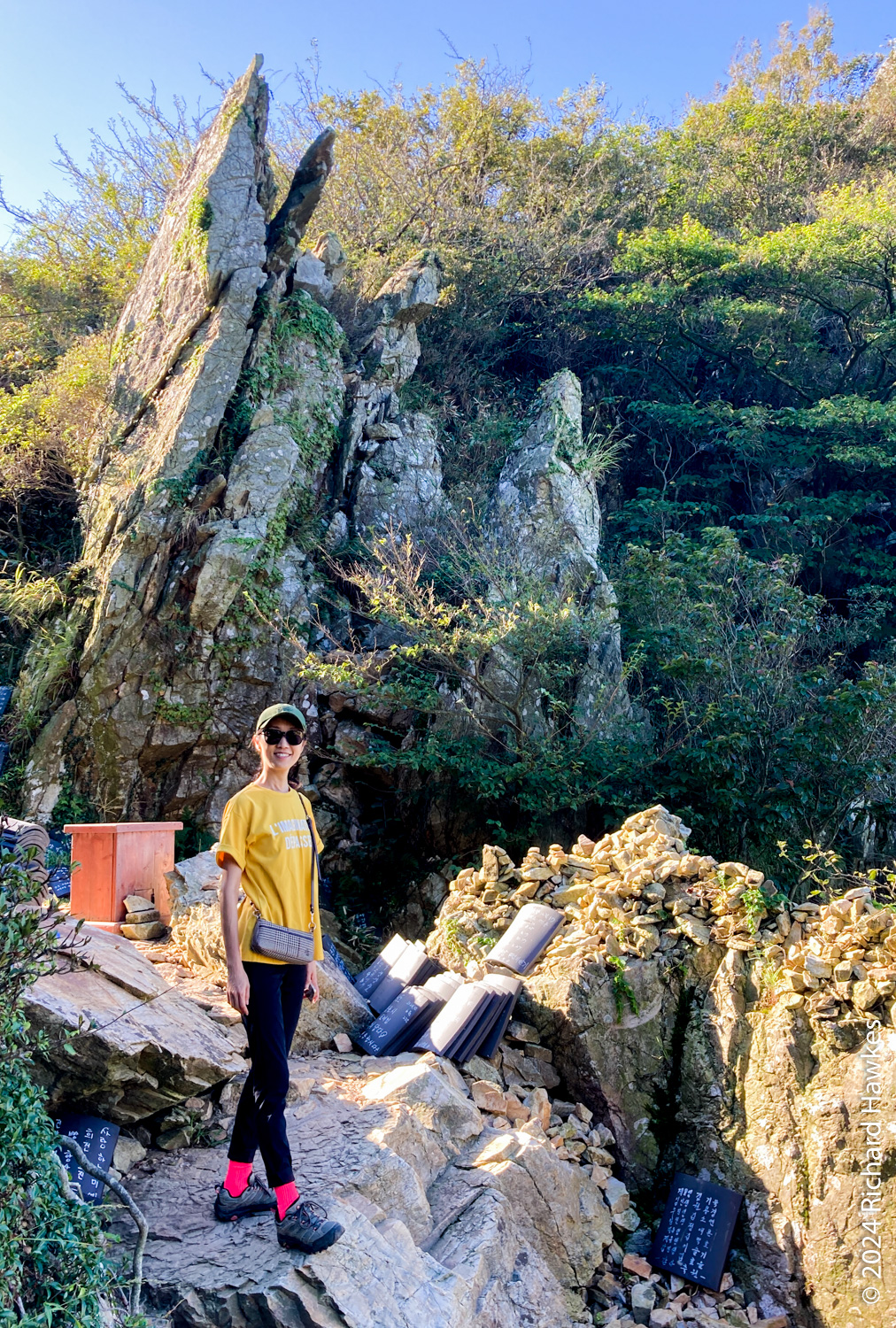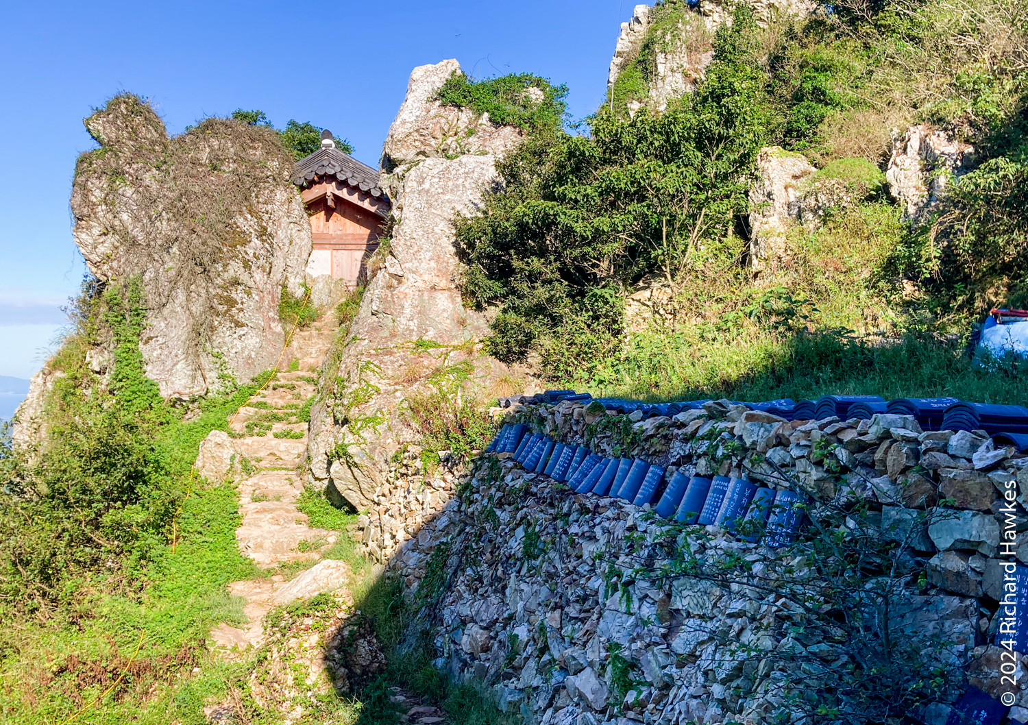 Eventually you reach an intersection which leads to Dosolam Hermitage. It’s a tiny place somewhat hidden between two columns of rock. First, you need to walk down some rock steps to an area reserved for lots of roof tiles; these are tiles people purchase for use by the temple. There is writing on them that might be prayers or some other messages for the person who donated the money.