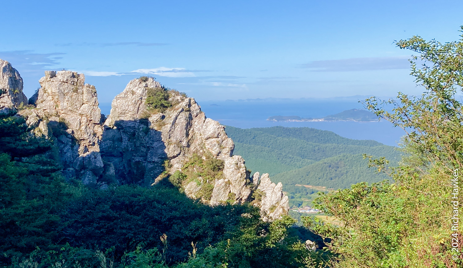 We then walked back to the car. We could feel the heat beginning to come and it was only 9am! On the way, we met a man who said he was responsible far planting lots of trees up here. At the carpark were a two more cars. I waled to where the road was blocked to the public and saw the sign and tire-shredding nails! I was feeling a bit sleepy and had a tiny headache, perhaps from yesterday’s heat and the early start this morning? Anyway, I moved the car into a shady spot, put the aircon on and took a short nap. After about thirty minutes I felt a bit better and we drove to the Ttangkkeut coast and stopped at few view view spots on the way.