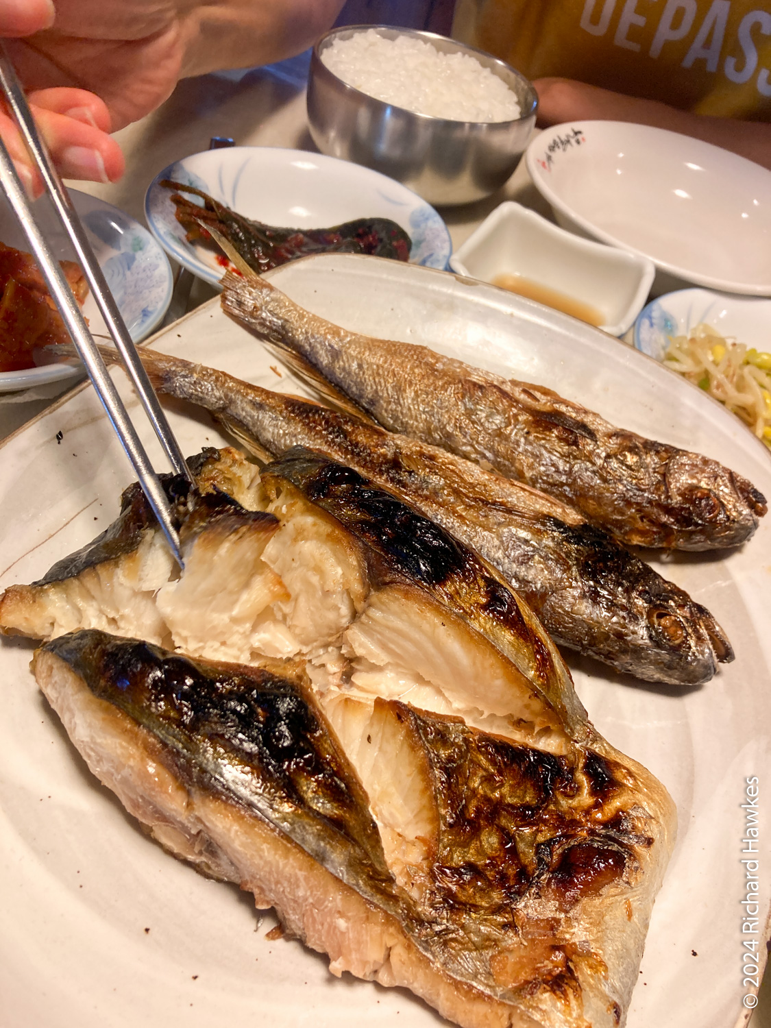 At Ttangkkeut coast, we had drinks at Cafe Sijak (카페시작) where I had another nap…sorry Romana! By about 1pm we were getting hungry and we wandered around the village. We needed our umbrella because of the extreme heat. We went to Jeollado Gajeongsik Baekban (전라도가정식백반) for lovely grilled fish. It was in a nice looking cottage-style house.