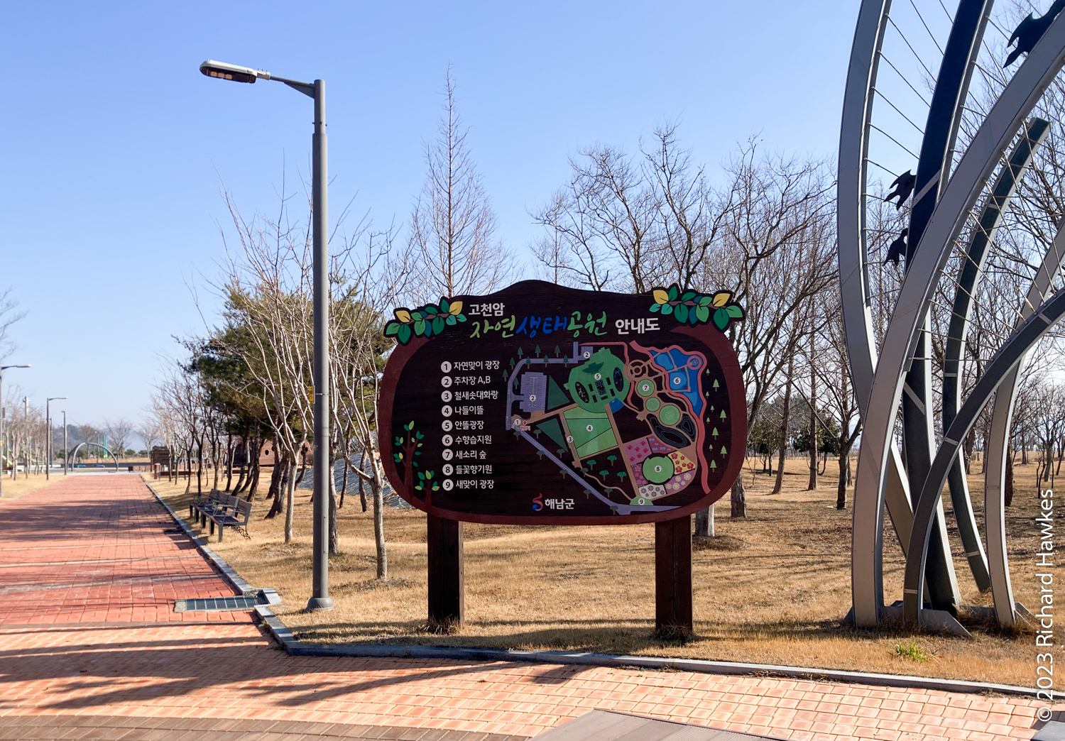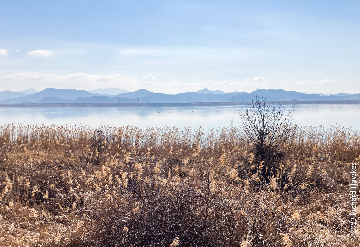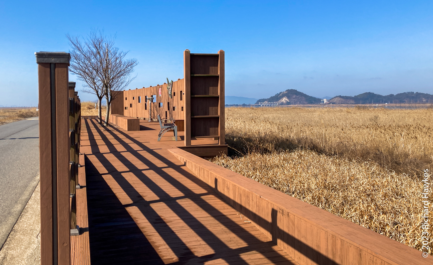 I started off early and collected my SOCAR from Mokpo train station, and headed straight to Haenam. I’d heard there were vast fields of reeds on flood plains at Gocheon (고천암갈대밭). Photos I’d seen of the area looked gorgeous, but when I got there, the lush green reeds had all been harvested! There was still a somewhat bleak beauty to the area, though, and I spent a while walking around. I’d love to come back when it’s lush and green. I also took a quick walk around the Eco Park (고천암자연생태공원).