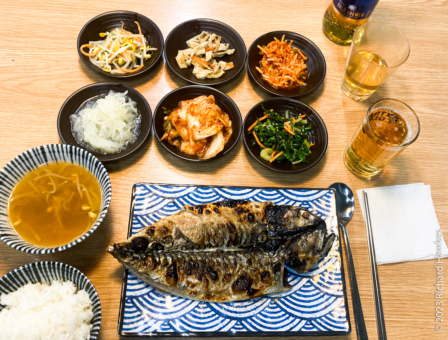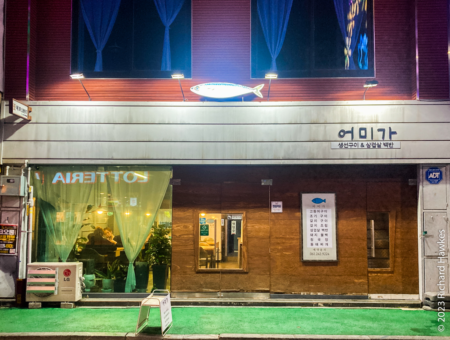 Back at Mokpo, I parked up the car and went for some grilled mackerel at Omega (어미가). It was really good.
