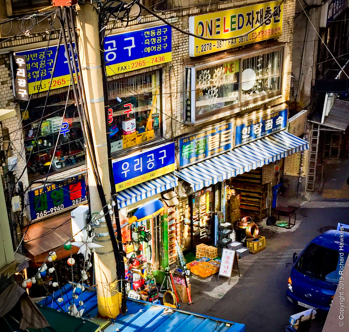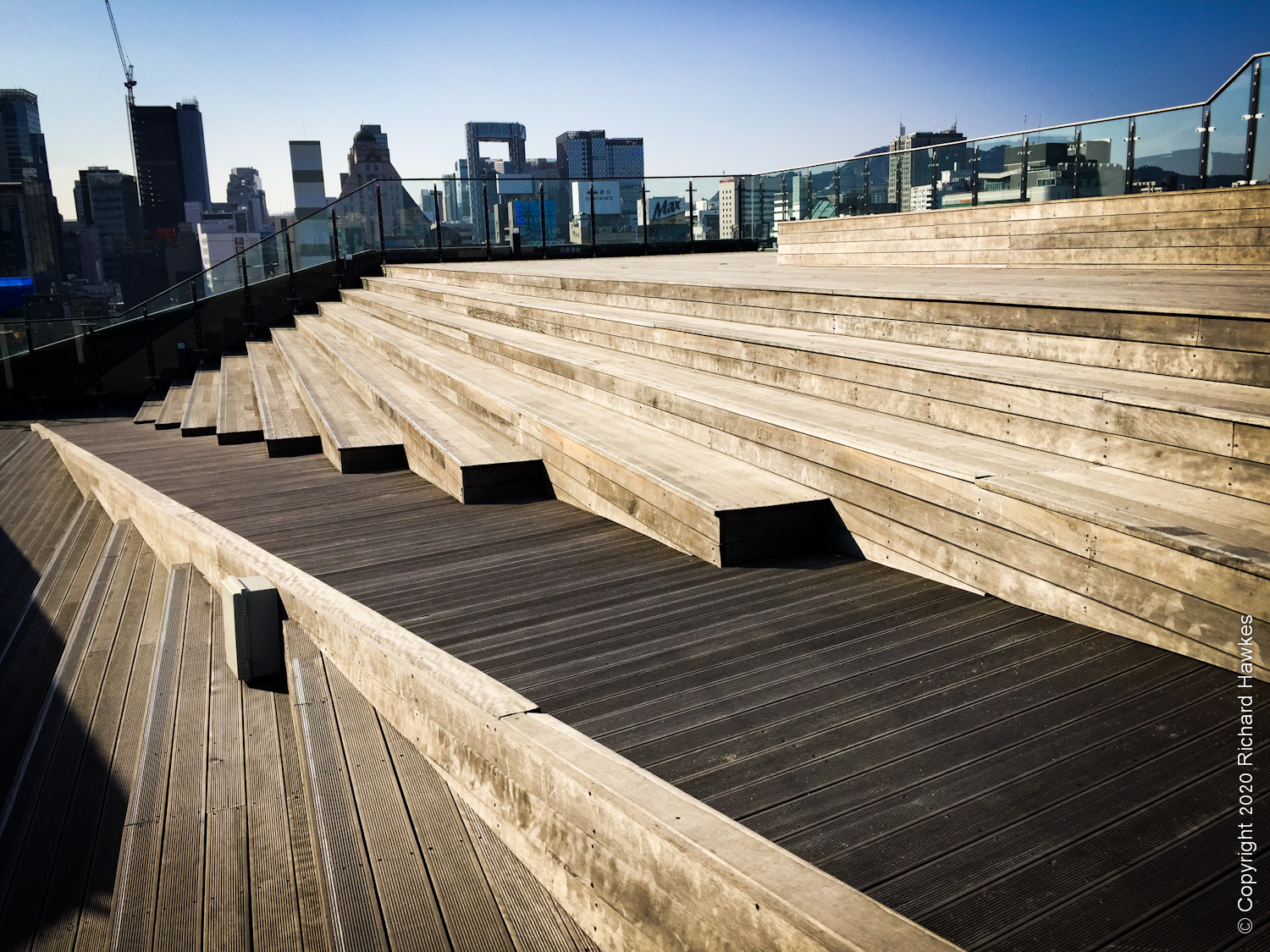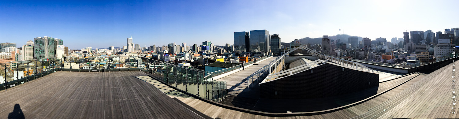 Downtown Jongro and Euljiro is home to a district known for shops and workshops dedicated to electrical lighting and design, old-school audio, general electronics and, more recently, design companies and places for young creatives to hang out, network and mix in with the older generations. Sewoon Plaza, Makercity and Arcade (it’s hard to decide what to call it!) also has a vast, wooden floored rooftop with impressive 360 degree view of the north of Seoul; looking north to Jongmyo Shrine, south to Namsan Tower and a huge swathe of old buildings east and west contrasting with modern skyscrapers further out. **NOTE: The rooftop has been closed since the start of the pandemic in 2021. I went on 2023-05-01 and it’s still closed for reasons unspecified.