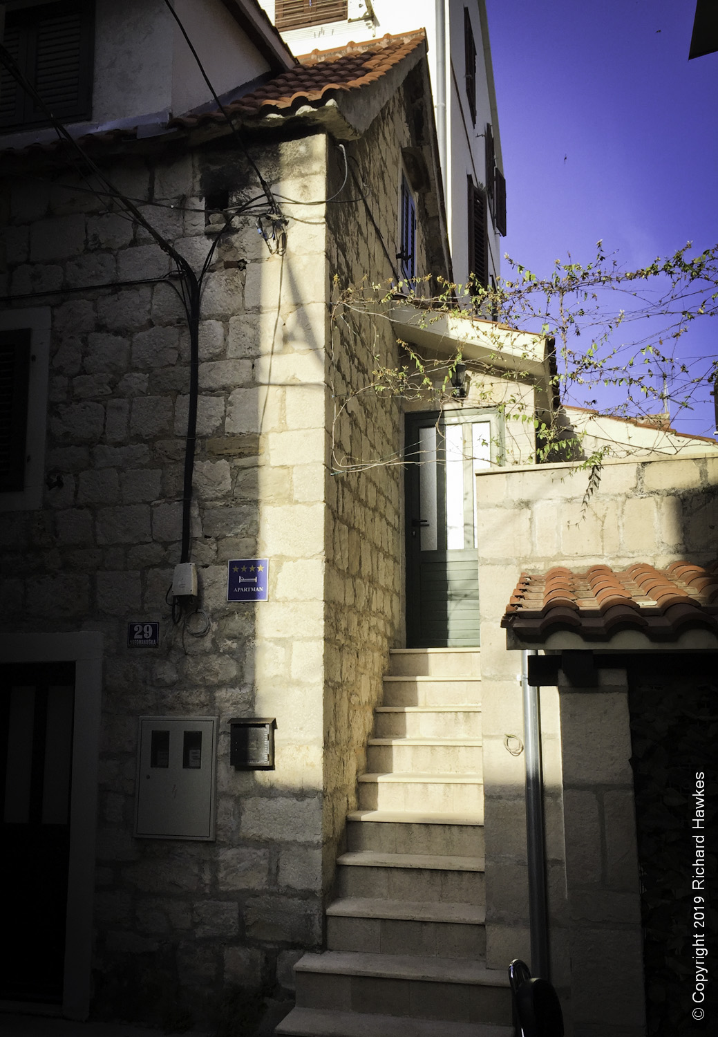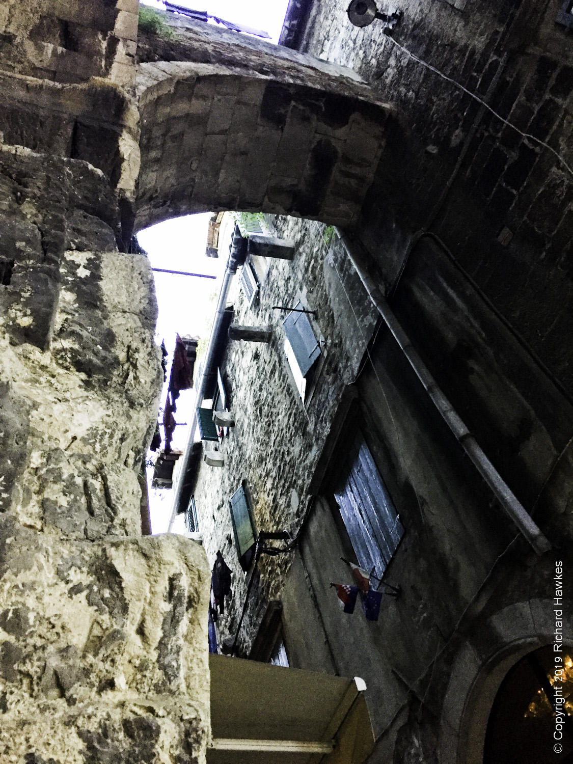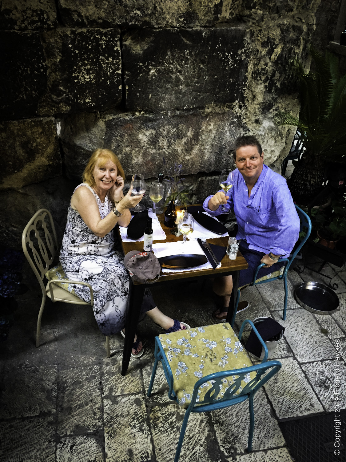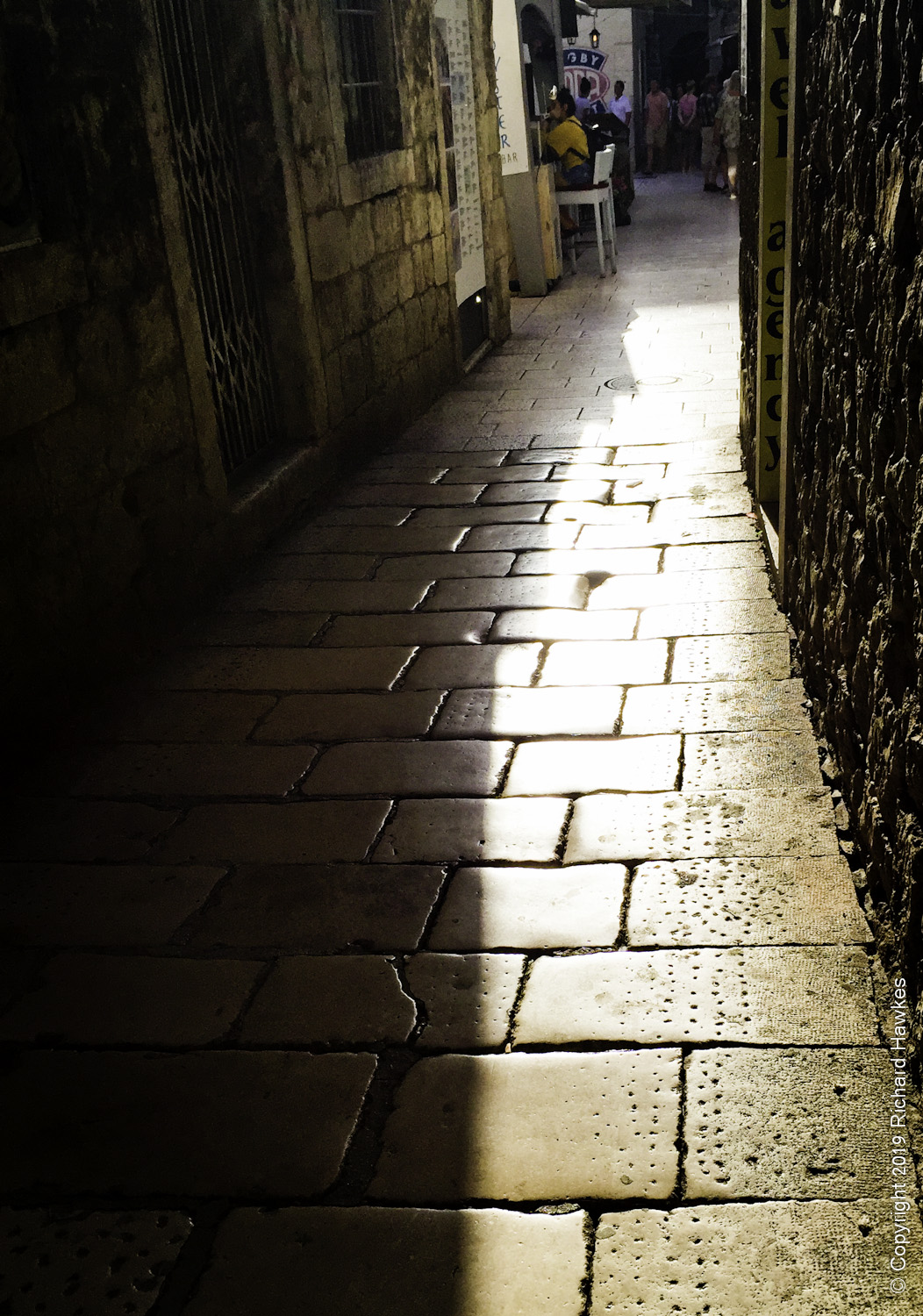 We headed out again after dark. Having dinner on the last night in narrow stone streets was a pretty decent experience. We were at a restaurant that served modern, Croatian cuisine; I had to take their word for it. The place was called Mazzgoon and the food was excellent. The street was narrow, with awesome old stone features running up and down and over it.